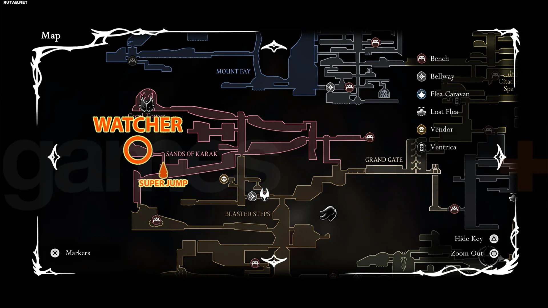 Наблюдатель на Краю находится в Западных Песках Карака, но станет доступен только после определенного прогресса в сюжете. Вам нужно добраться до третьего акта Silksong и получить способность «Шелковый Прыжок» (Silk Soar) в Бездне.