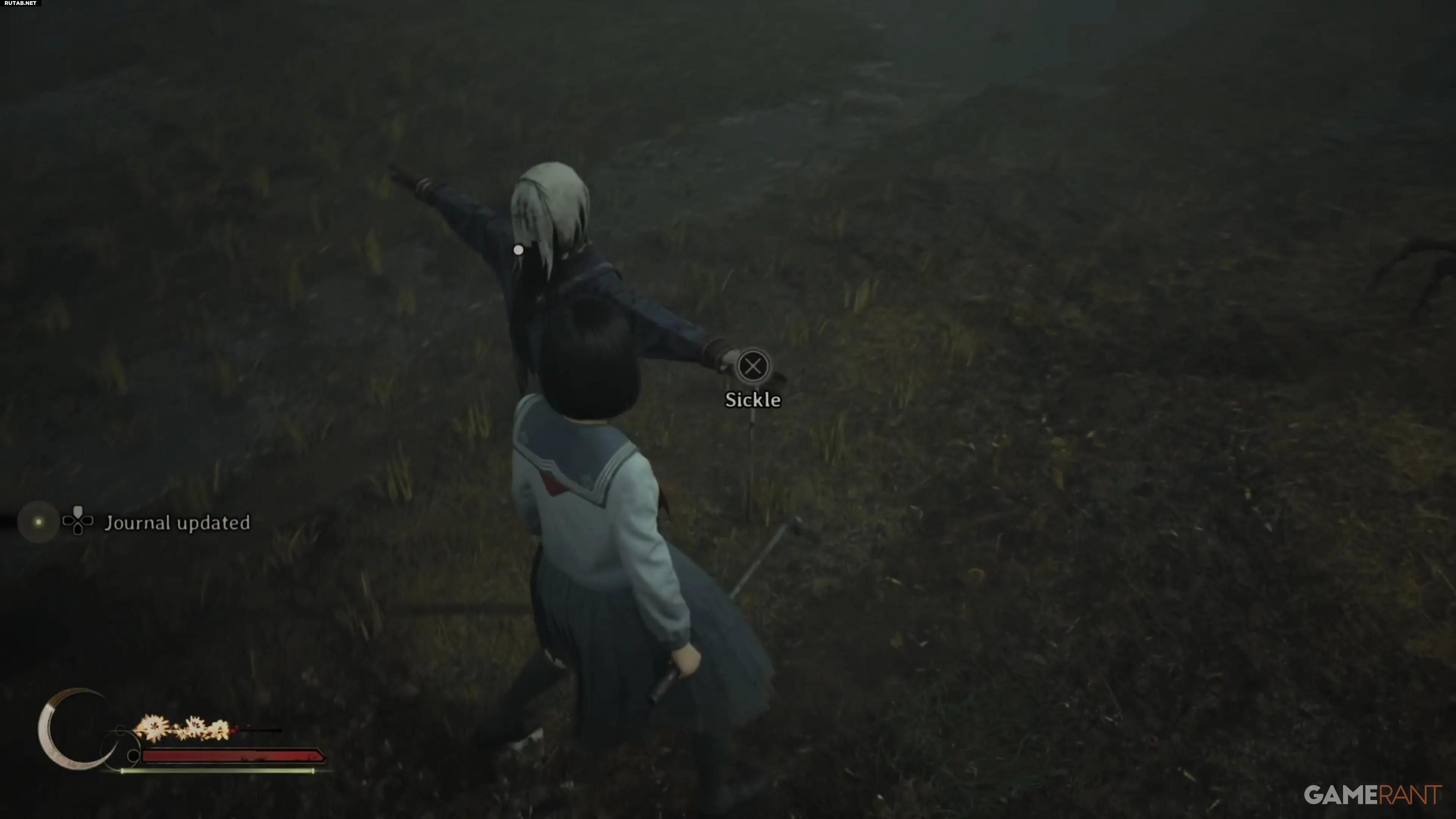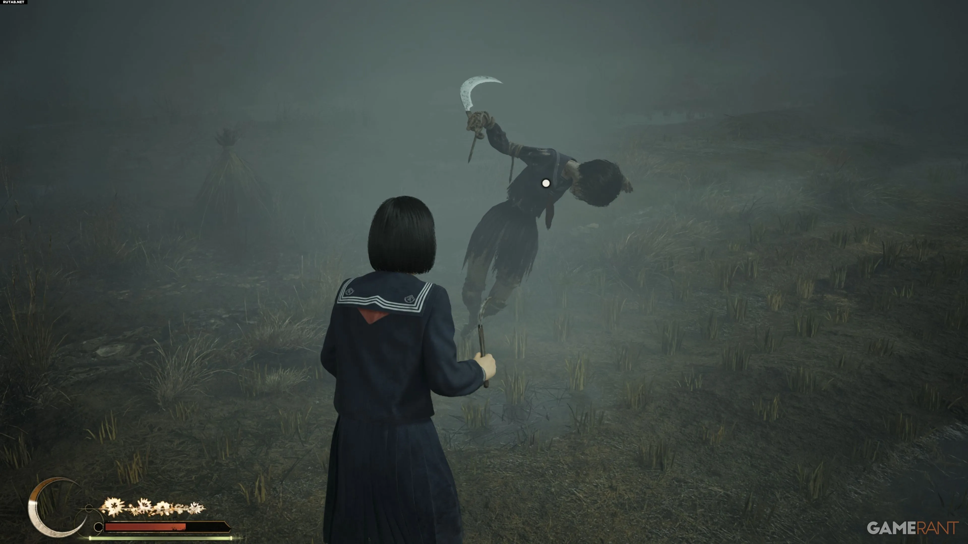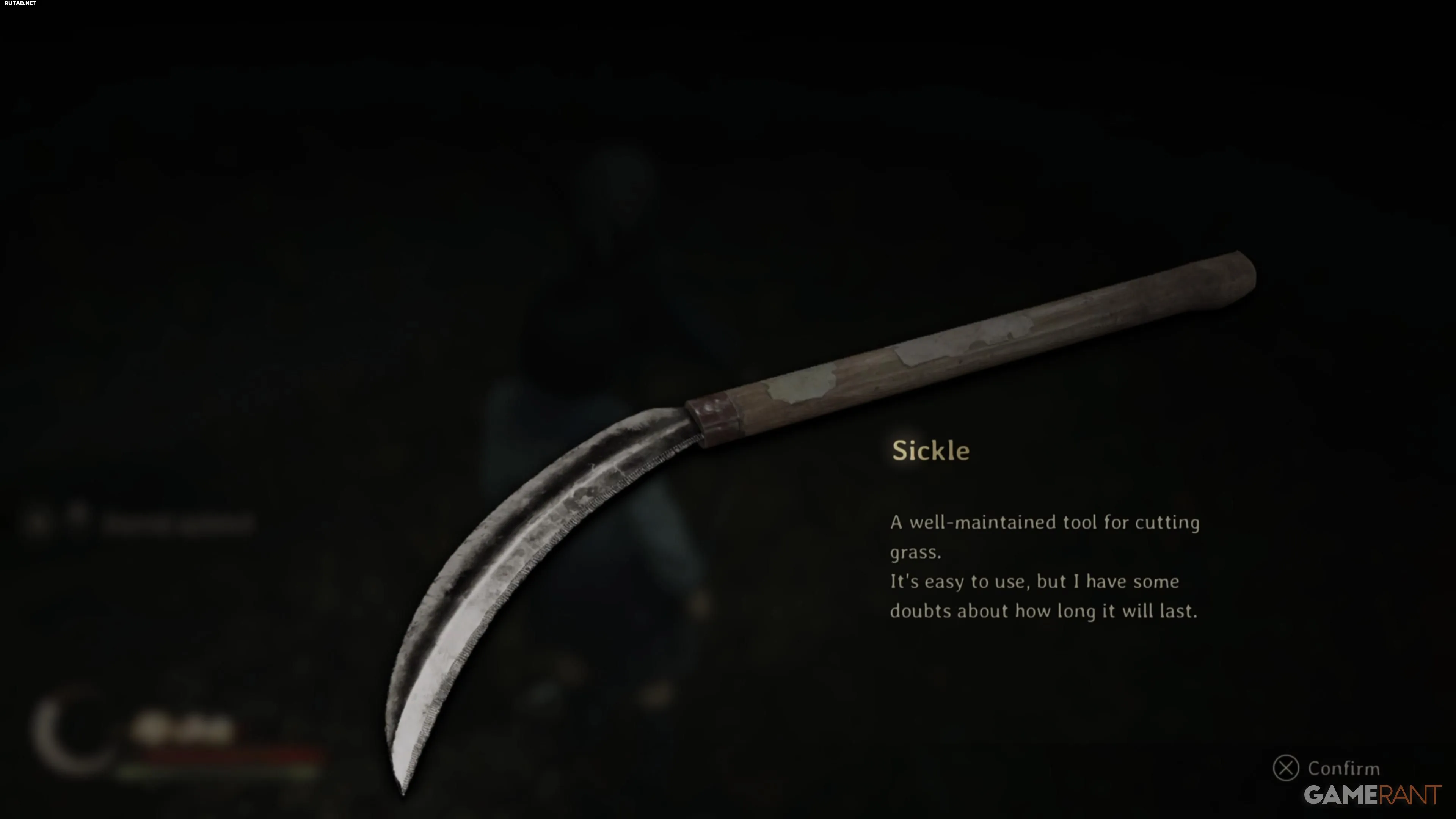 После кат-сцены с Сю вы окажетесь на пустынном поле с несколькими пугалами. Взаимодействуйте с первым пугалом, у которого лицо закрыто тканью. Возьмите серп из его руки — это оружие можно использовать в бою, хотя оно не очень прочное.