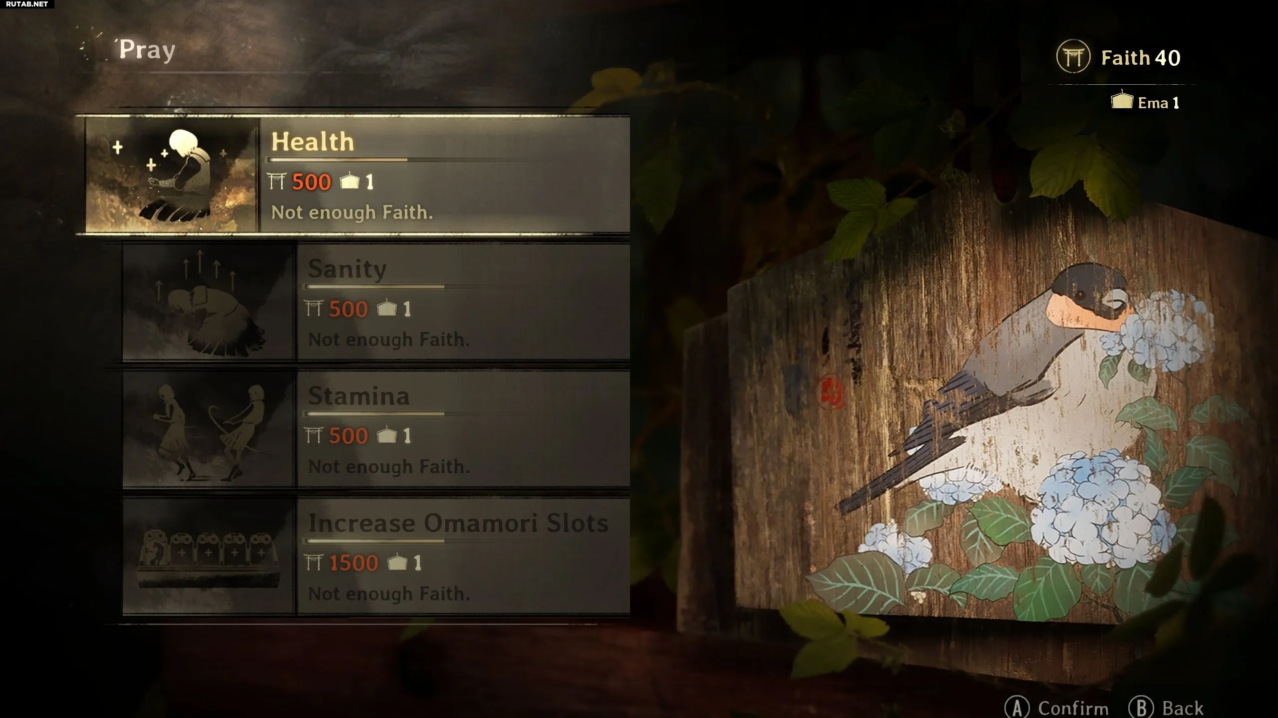 Чтобы повысить максимальное здоровье, выносливость, рассудок или количество слотов для омамори, игроки могут посетить святилище Хокора и перейти в меню «Молиться». Здесь можно выбрать конкретную характеристику для улучшения, используя табличку Эма. Для завершения улучшения также потребуется потратить немного Веры, которую можно получить, поднося предметы, такие как расходники, в святилище Silent Hill f.