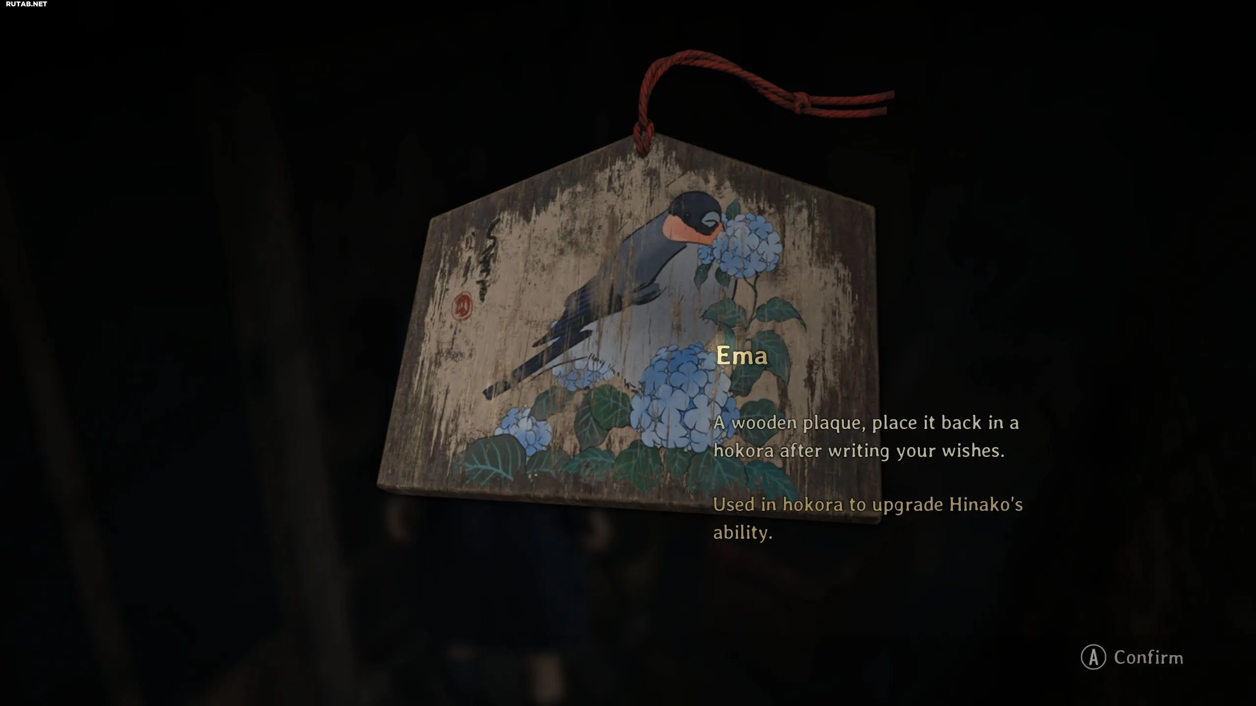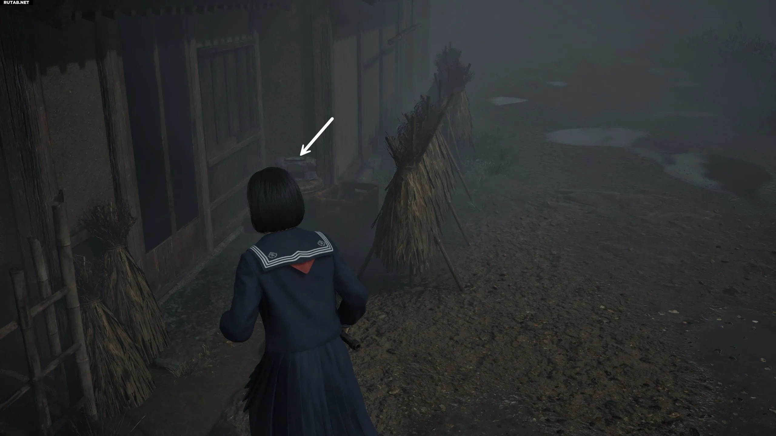 Продолжайте идти по улице, пока слева не увидите хижину с охапками рисовой соломы перед ней. Подойдите ближе к двери, и вы заметите табличку Эма, лежащую на бетонной колонне поверх соломенной корзины. Вы можете подобрать табличку Эма, чтобы позже использовать её в святилище Хокора для улучшения характеристик Хинако.