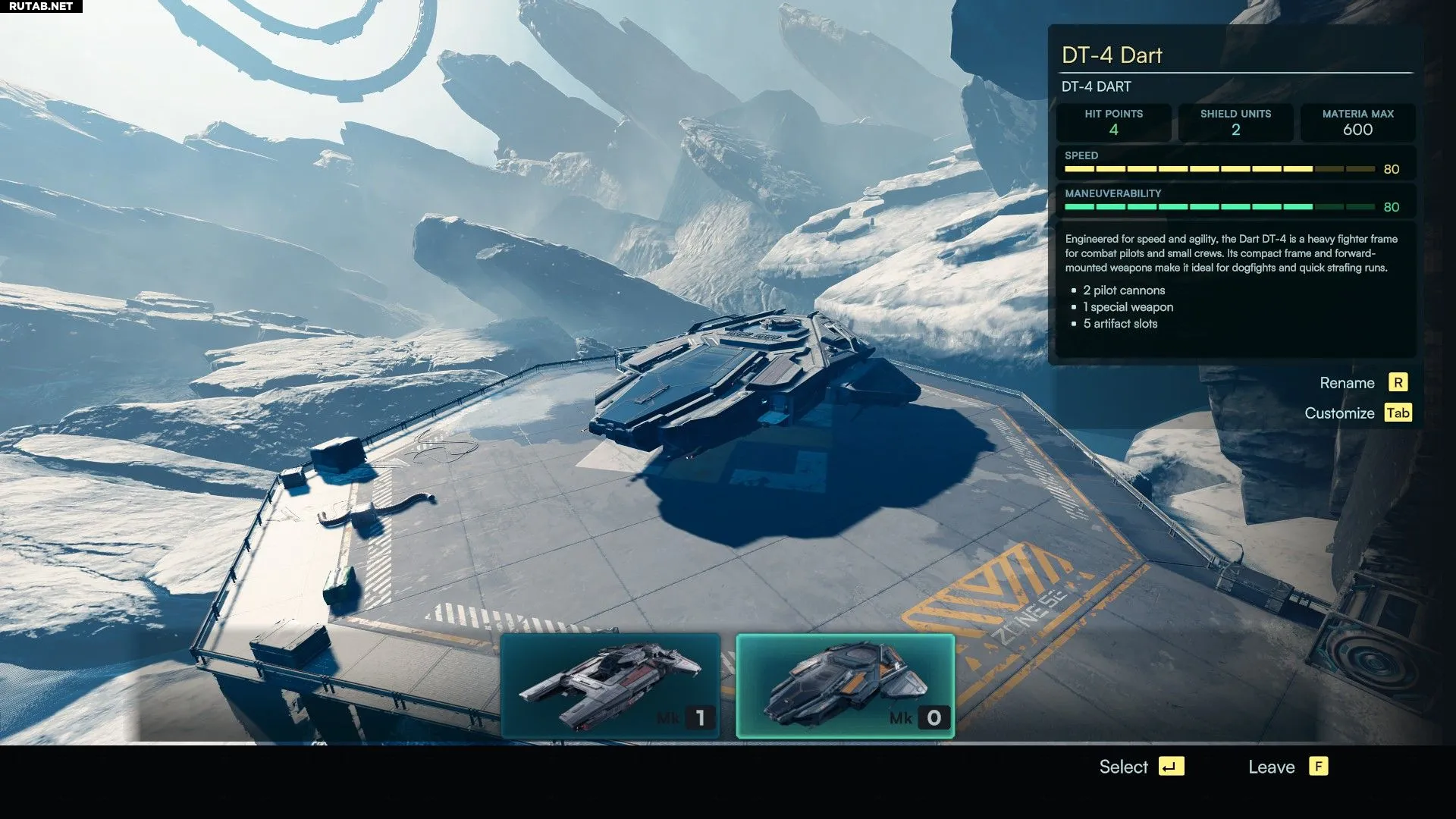 Dart — полная противоположность Катамарану. Несмотря на классификацию тяжелого истребителя, это небольшой и верткий корабль, больше подходящий для одного-двух игроков. В отличие от Катамарана, у Dart нет слотов для мульти-турелей. Корабль может использовать одно крупное спецоружие (например, рейлган) и две пушки пилота, то есть основная огневая мощь управляется пилотом, а не стрелком. Такая конфигурация означает, что Dart лучше подходит для воздушных боев, чем для бомбардировок.