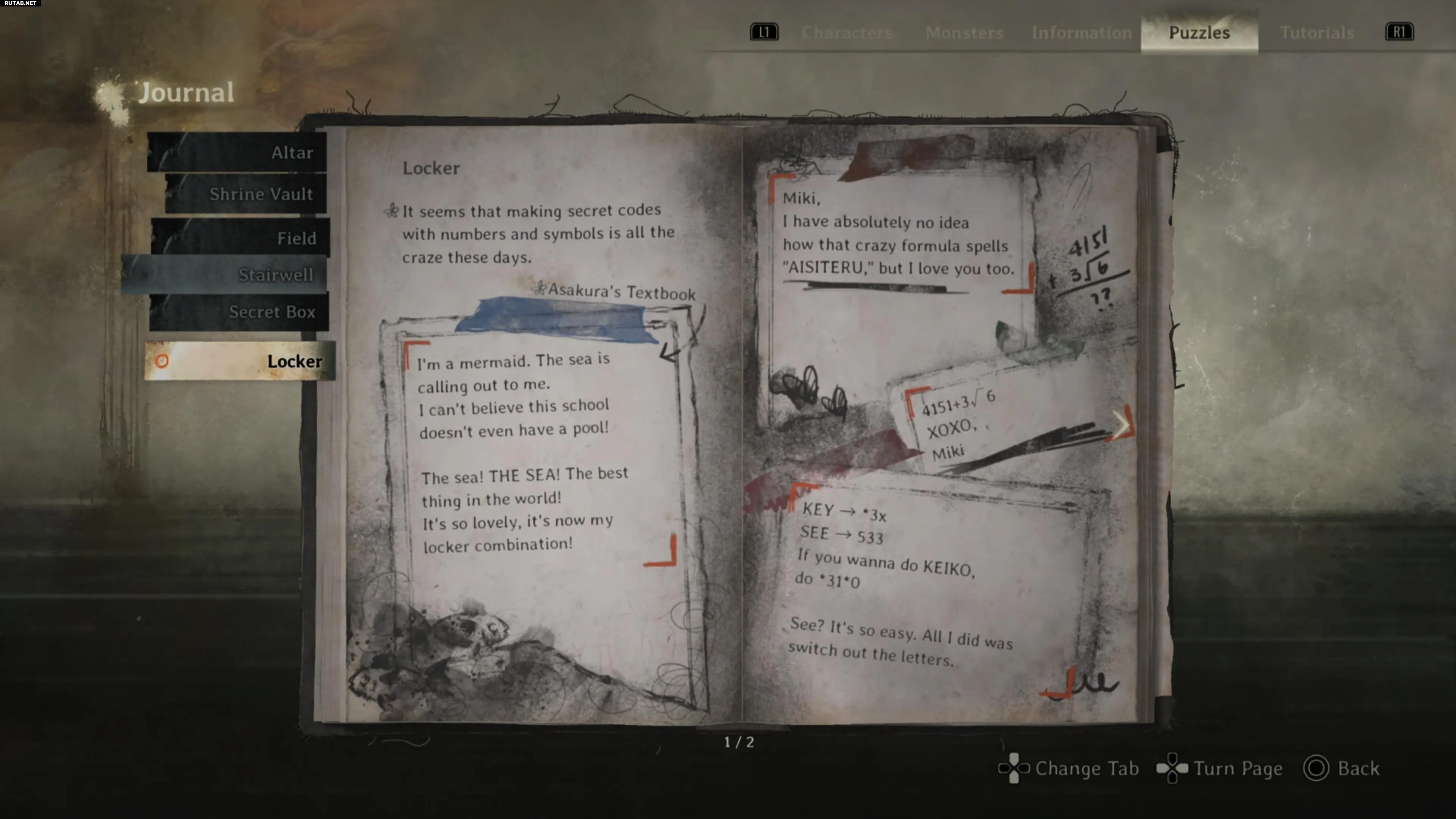 Комбинация зависит от сложности. На истории и высокой сложности в журнале указано, что Асакура Аюми любит «МОРЕ» (SEA) или «АВТОБУС» (BUS). Комбинация: 5-3-4 для «МОРЕ» или 8-6-5 для «АВТОБУС». Внутри находится «Ключ от ключницы», необходимый для сюжета.
