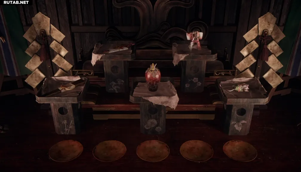 Эта головоломка встречается в начале игры и может вызвать затруднения, если упустить важную деталь. На алтаре расположены пять подставок, а перед ним на подносах лежат пять «даров»: ваза, бумажный веер и три запечатанных мертвых животных — птица, мышь и рыба.