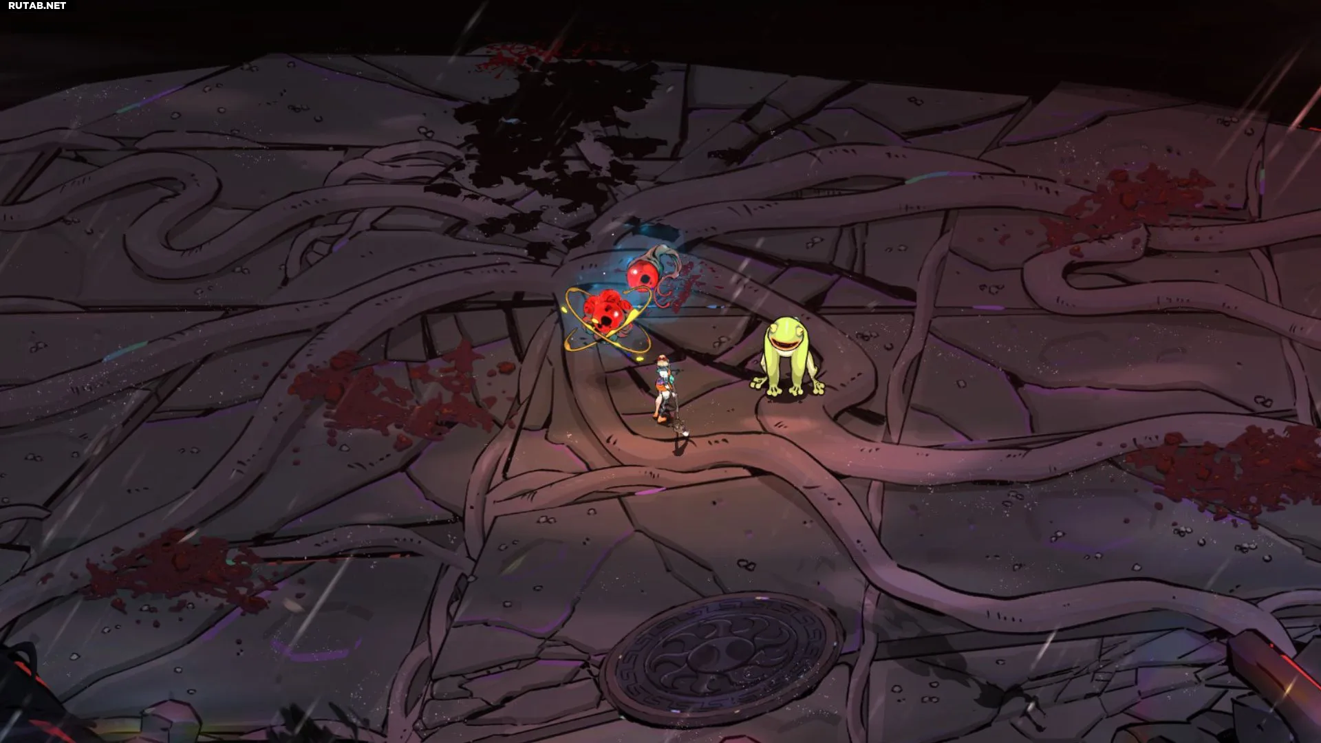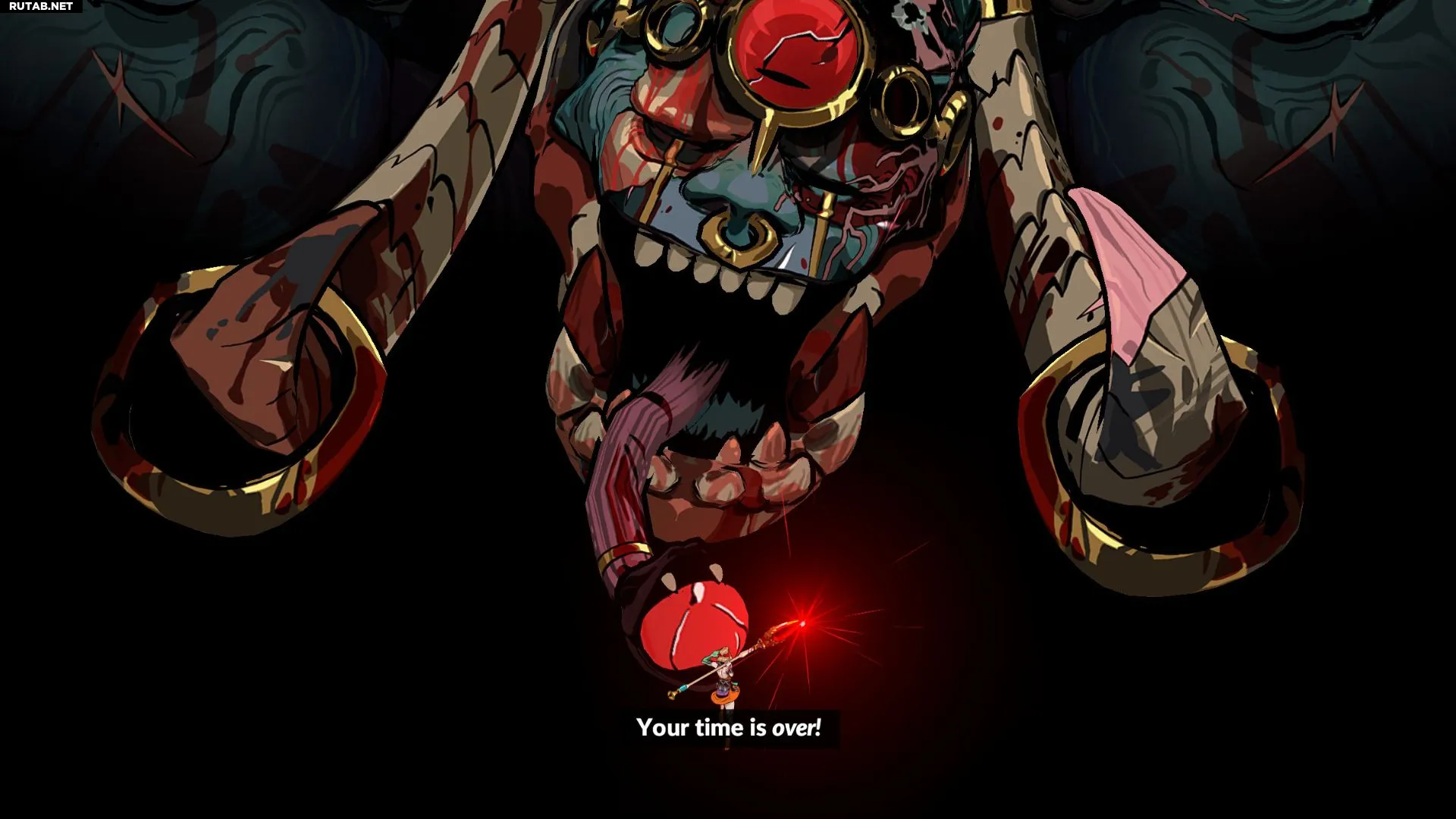 Тифон занимает большую часть экрана, и его невозможно победить по-настоящему – даже его полоса здоровья ломается и исчезает в начале боя, что подчёркивает его подавляющую силу.