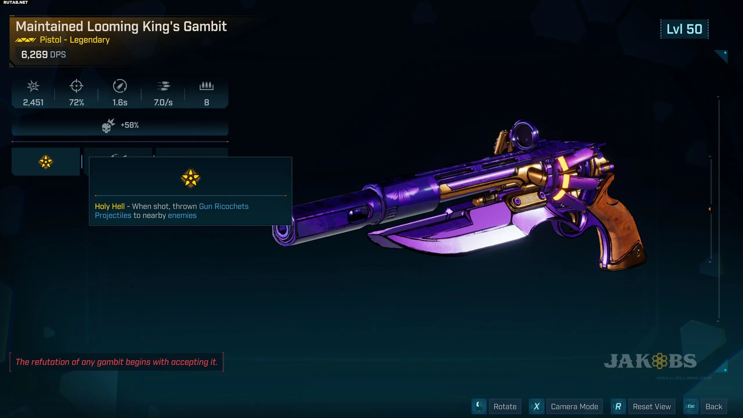 King's Gambit обладает уникальной анимацией: при перезарядке игрок бросает пистолет, и тот превращается в медленно летящий снаряд с большой зоной поражения. Сам по себе этот снаряд урона не наносит, но если в него выстрелить, то пули гарантированно рикошетят по врагам в радиусе 360 градусов. Сам по себе King's Gambit — неплохое оружие, но его истинная сила раскрывается как инструмент для рикошетов. Игроки могут бросить пистолет перезарядкой, переключиться на автомат, пистолет-пулемёт или любое другое оружие с высокой скорострельностью и обрушить на врагов шквал рикошетящих снарядов, где точность прицеливания не требуется. В сочетании с навыками, усиливающими рикошеты, King's Gambit становится обязательным элементом арсенала.