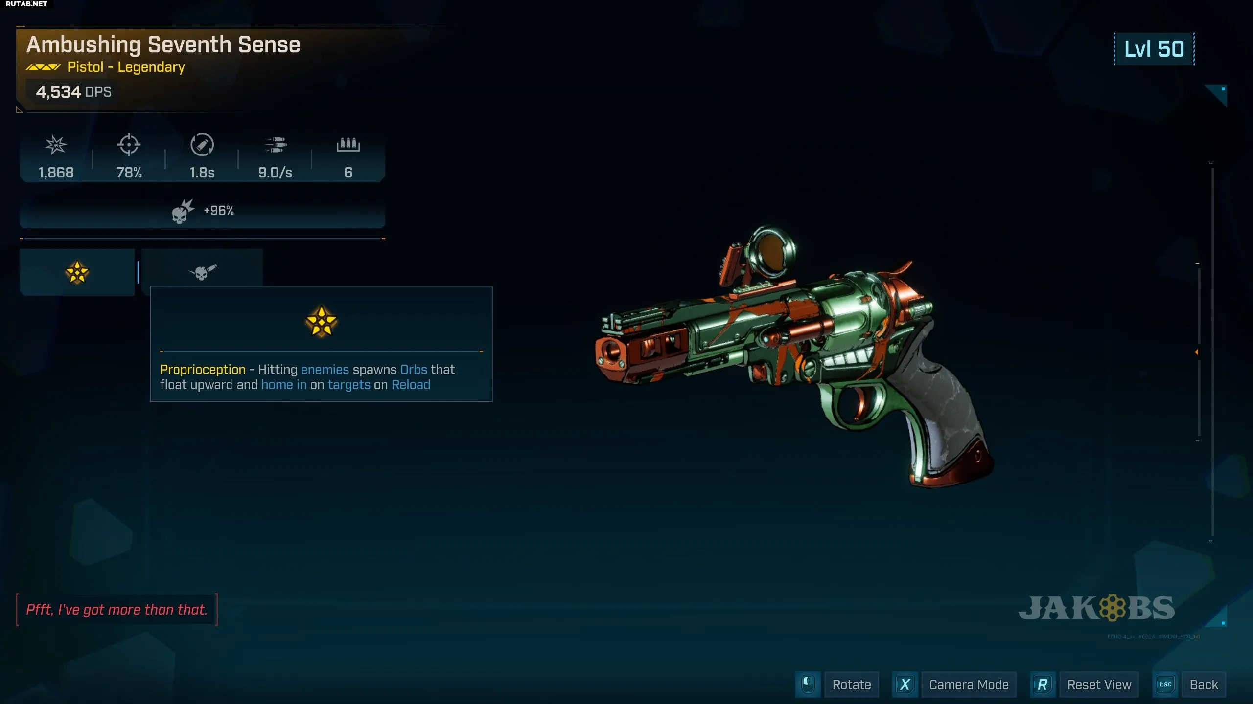 Seventh Sense обладает ограниченным боезапасом, что, впрочем, становится его преимуществом. Уникальная черта Proprioception заключается в том, что попадания по врагам создают сферы, которые взмывают вверх и самонаводятся на цели при перезарядке, нанося взрывной урон. Благодаря высокой скорострельности, быстрой перезарядке и солидному урону, характерному для оружия Джейкобс, Seventh Sense становится отличным выбором для DPS как против обычных врагов, так и против боссов.
