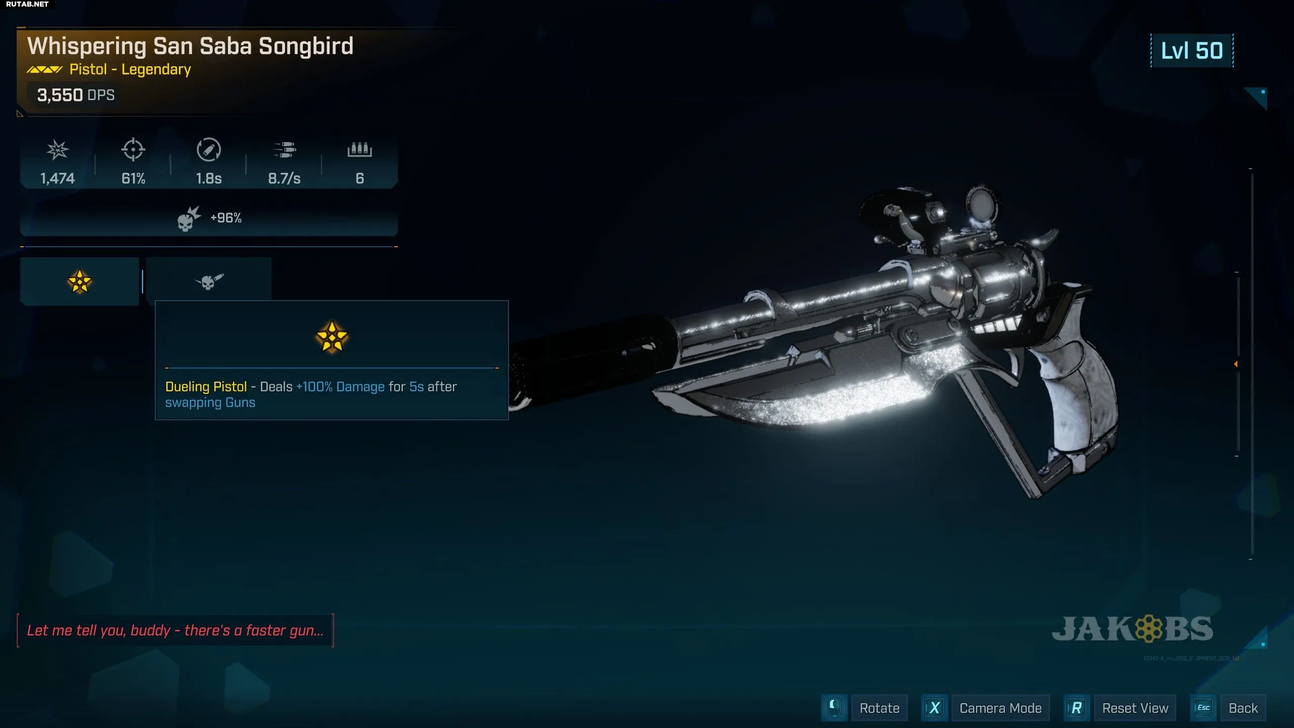 San Saba Songbird — один из самых мощных пистолетов в Borderlands 4. Этот револьвер от Джейкобс обладает уникальной механикой Dueling Pistol, которая увеличивает урон на +100% в течение 5 секунд после смены оружия. Эффект суммируется при многократной переключении оружия перед возвратом к San Saba Songbird.