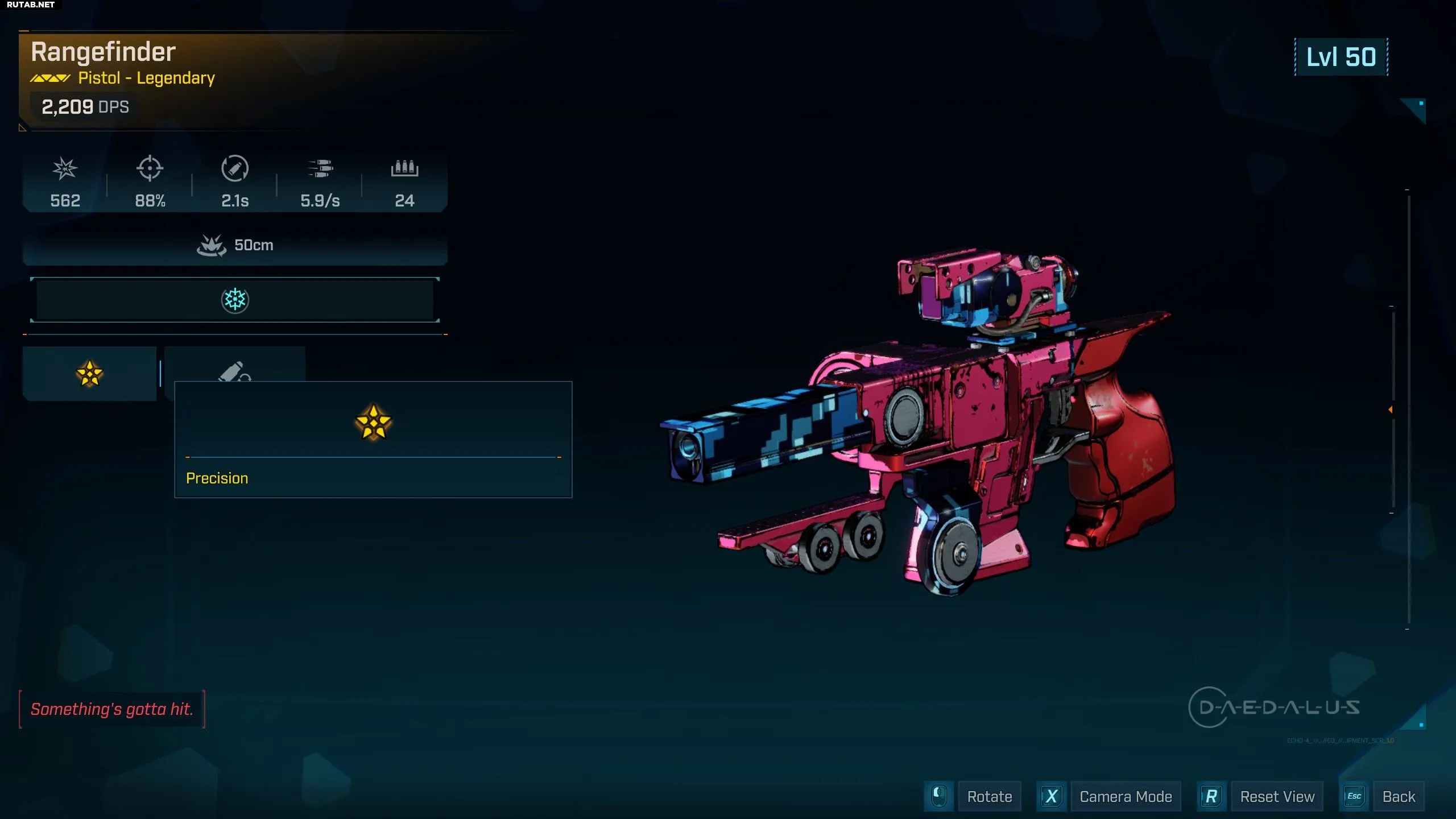 Rangefinder стреляет очередями по необычной схеме: первое нажатие — три выстрела, второе — два, третье — один. Цикл повторяется. Главная сила оружия — в накоплении урона от этих очередей, что создаёт огромные множители урона. Это особенно эффективно для сборок, ориентированных на шанс и силу стихийного урона.