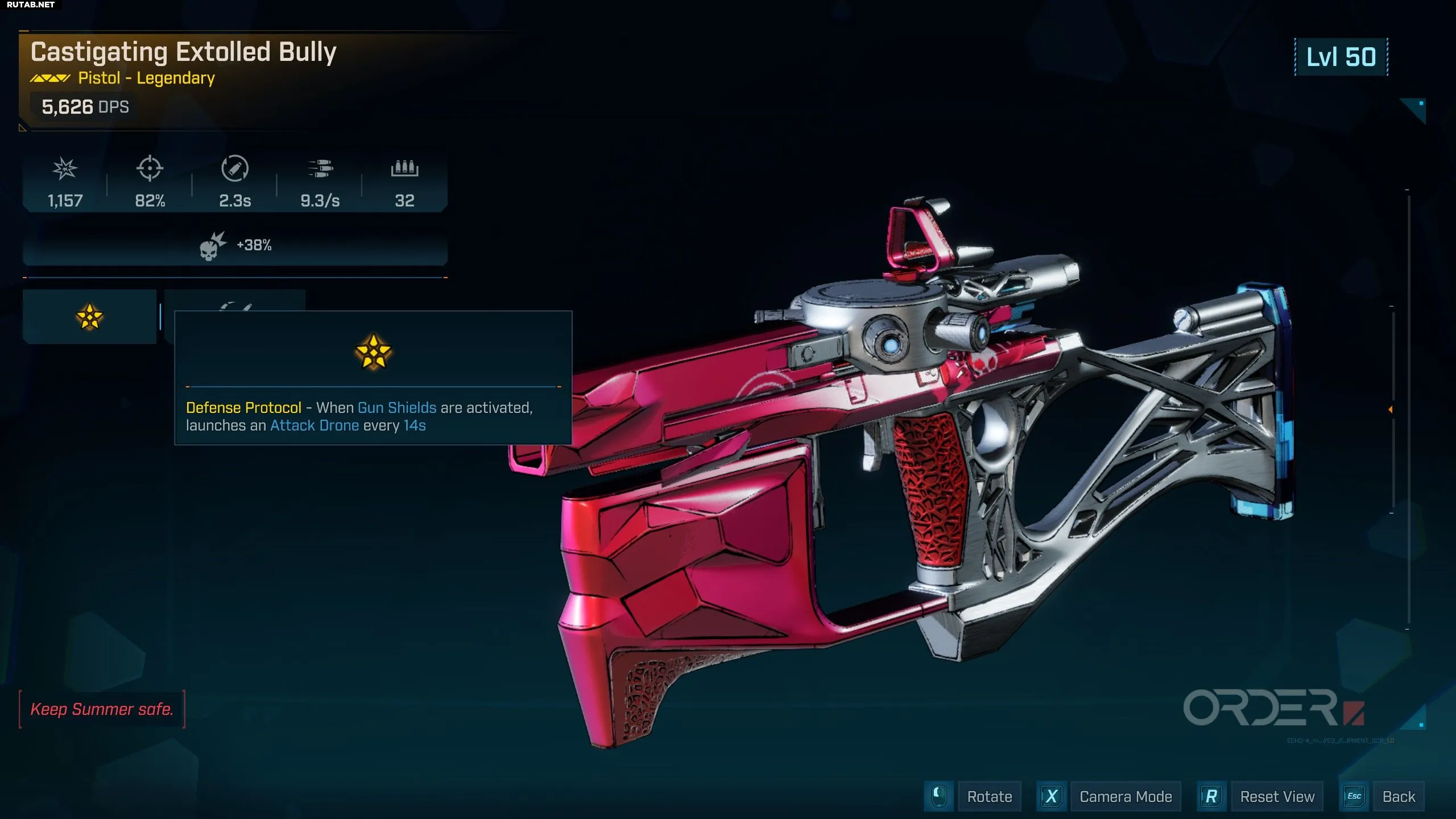 Bully идеально подходит для того, чтобы «задирать» цели. При прицеливании он каждые 14 секунд запускает атакующий дрон, который самостоятельно находит врагов и обстреливает их, предоставляя вам верного пулевого напарника. Пистолет исключительно эффективен, так как может выпасть с любым типом стихийного урона, что полезно для различных сборок. Однако его главное преимущество — высочайшая скорострельность и быстрая перезарядка, превращающие Bully в настоящий пулемёт. Это машина DPS, которая, хоть и расходует много патронов, невероятно эффективна в режиме «поливай и молись», особенно с активированным щитом и вызываемым дроном.