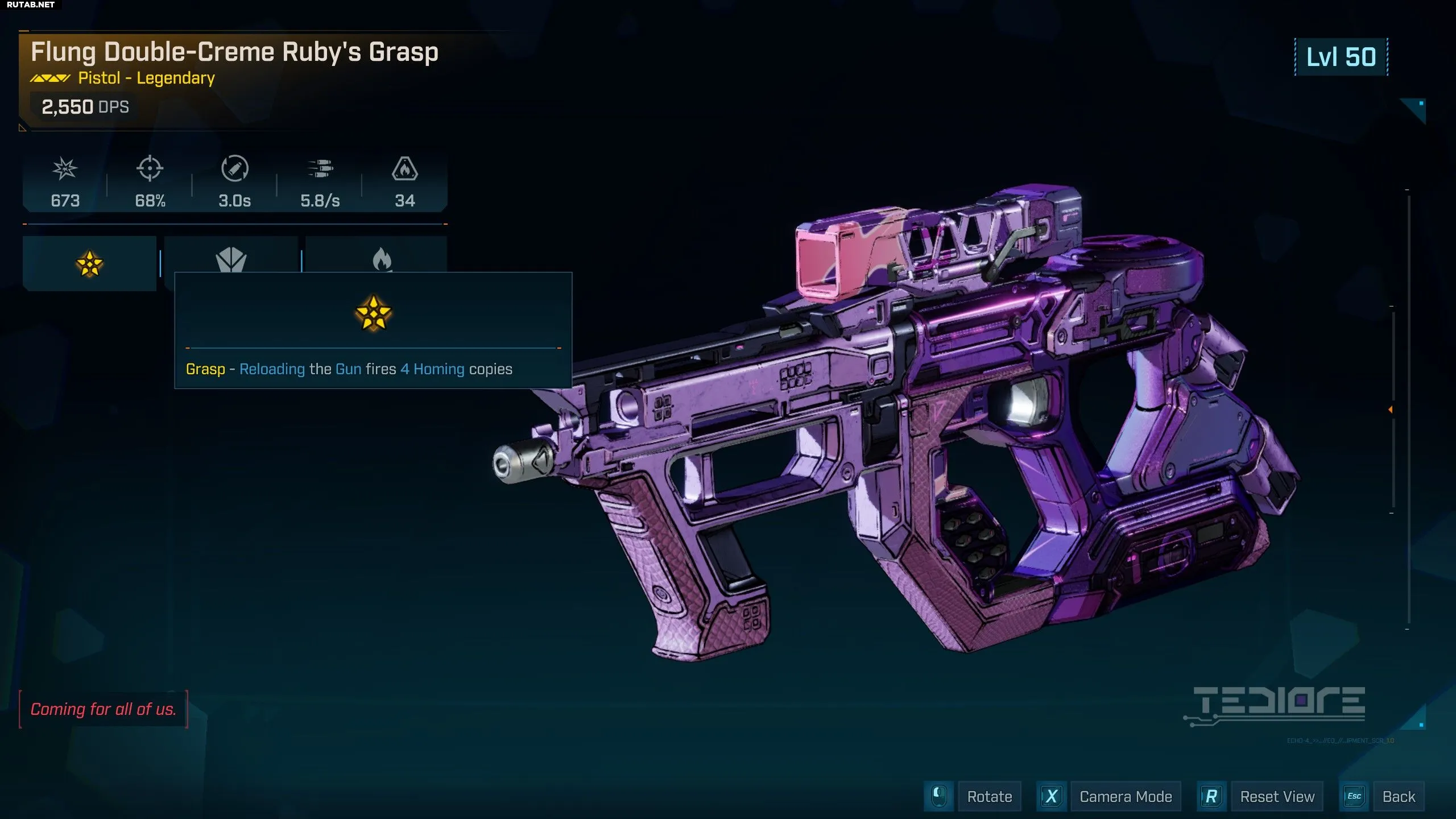 Ruby's Grasp продолжает традицию Тедиор — перезарядка броском оружия, которое взрывается при попадании во врага. Однако его сила не только в мгновенной перезарядке, но и в высокой скорострельности и хорошем уроне. Уникальный эффект Grasp при перезарядке выпускает 4 самонаводящиеся копии пистолета, превращая каждый бросок в залп из четырёх «ракет». Урон зависит от количества патронов в магазине — можно выстрелить один раз и бросить пистолет, получив 4 мощных самонаводящихся взрыва без перезарядки. Правда, это быстро расходует боеприпасы.