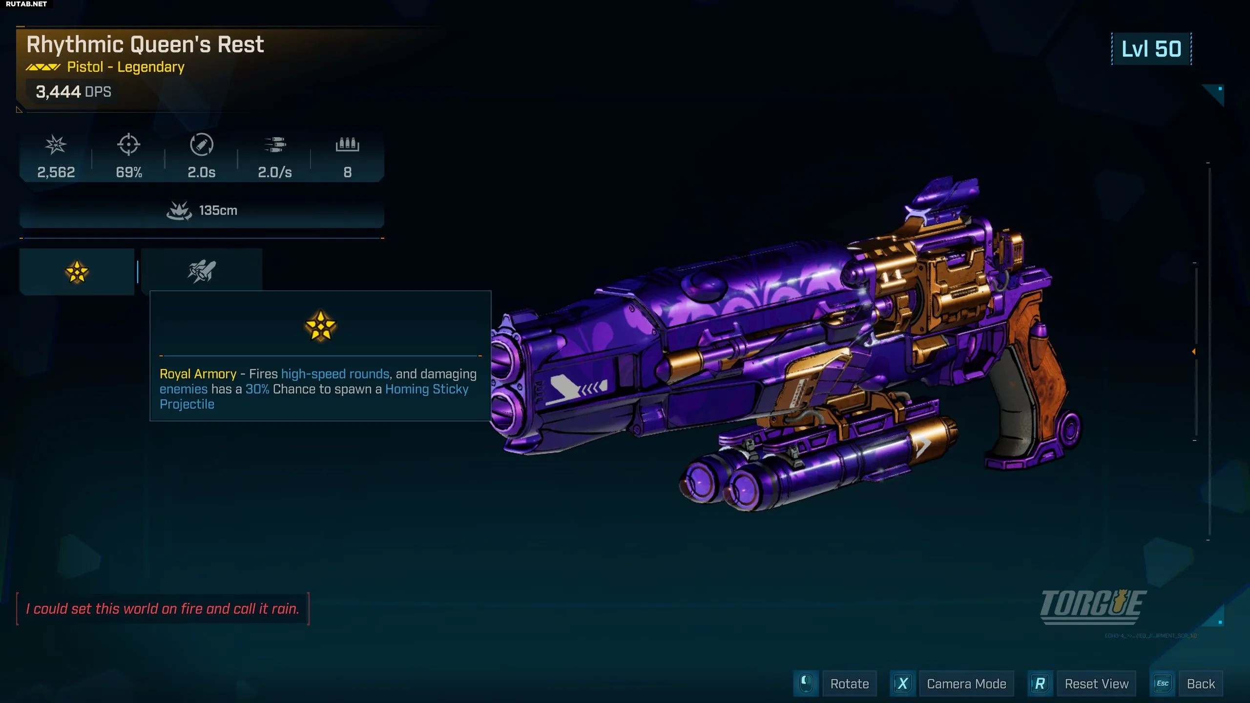 Queen's Rest — это настоящая взрывная мощь Торрг в компактном корпусе. Этот пистолет-ракетница выпускает высокоскоростные снаряды, по сути, превращая каждый выстрел в ракету. Он отличается высокой скорострельностью, быстрой перезарядкой и наносит сокрушительный урон с приличным разбросом. Уникальная особенность оружия также весьма полезна: с 30% шансом каждый выпущенный снаряд создаёт самонаводящийся липкий снаряд, что значительно увеличивает общий урон благодаря цепной взрывной реакции.
