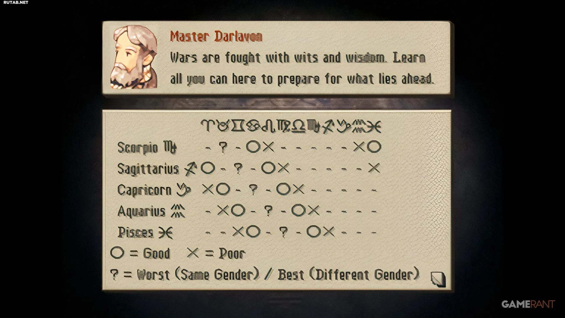 Поскольку в культовой Final Fantasy Tactics важно объединять наиболее совместимых персонажей в отряде, вот информация о поле и знаках Зодиака каждого героя. Персонажи могут быть мужского, женского пола или гендерно-нейтральными. Большинство врагов в игре не имеют пола, что немного меняет правила совместимости. Когда у персонажа должна быть лучшая или худшая совместимость с монстром (например, если монстр — Рак, а ваш боец — Козерог), это меняется на плохую совместимость.