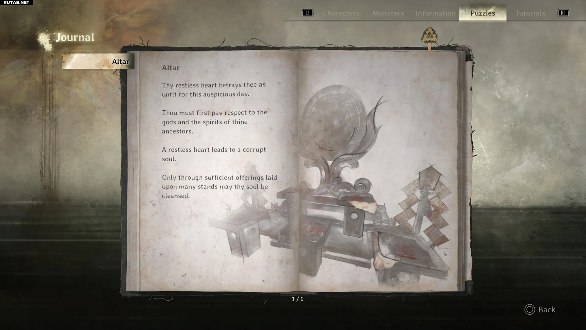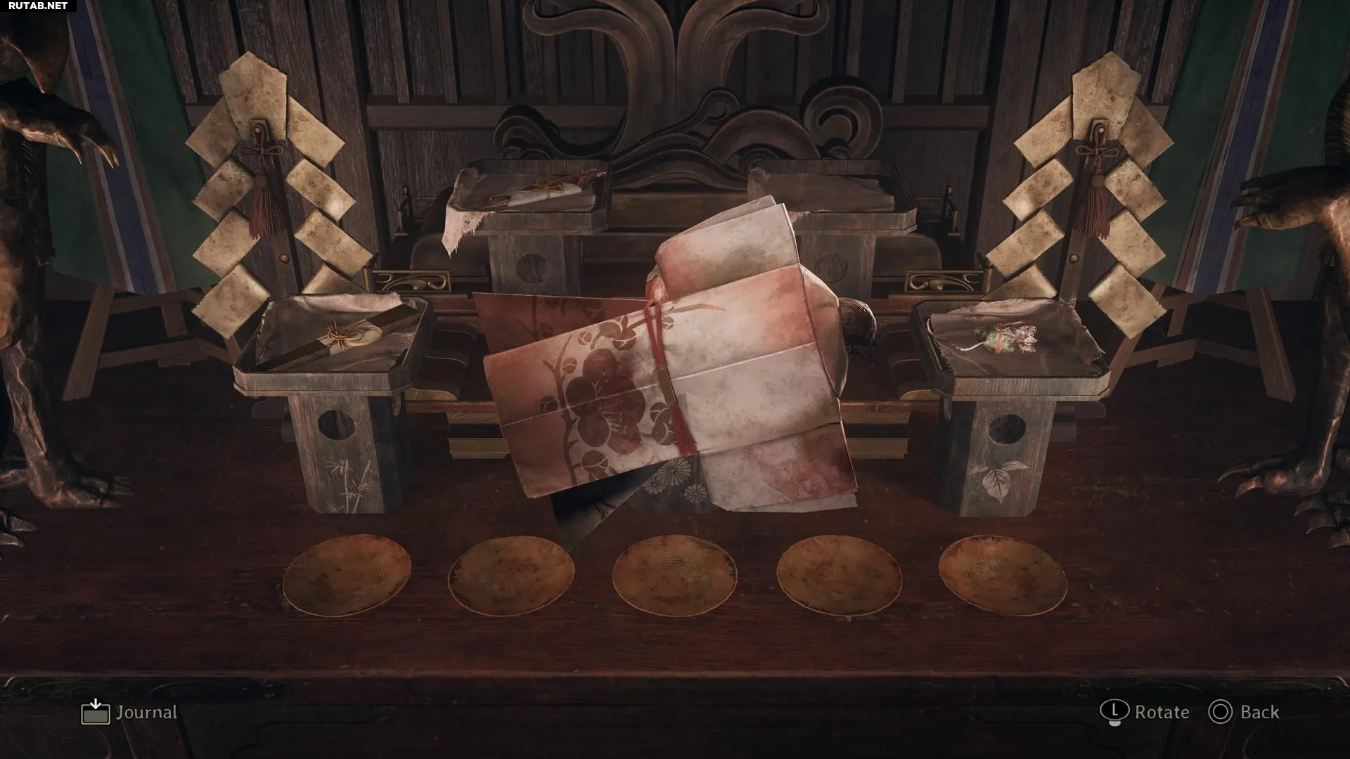 Взаимодействуя с алтарем, вы обнаружите пять предметов для подношения: крысу, птицу в мантии, урну, веер и сушеную рыбу. Позади них расположены пять деревянных подставок. Все пять подношений должны быть размещены на подставках в определенном порядке, чтобы продолжить.
