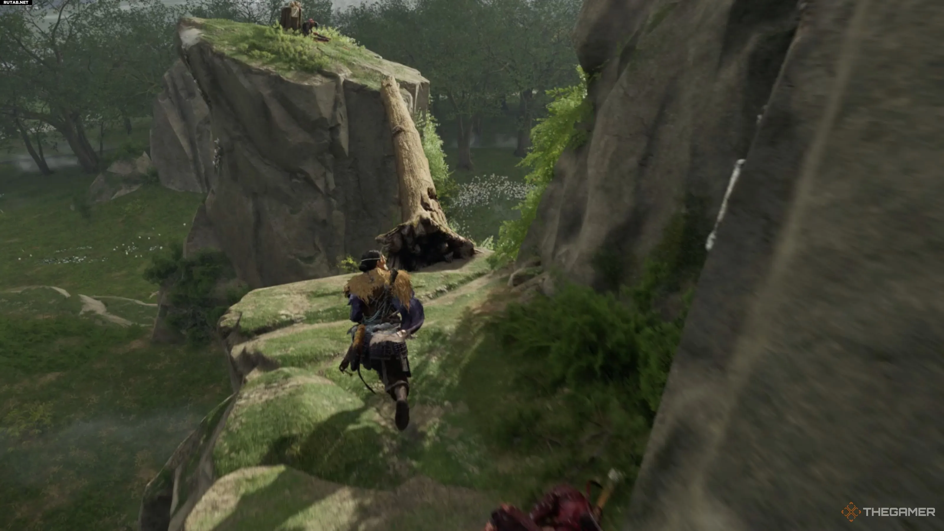 С верхнего уступа прыгните на ближайшее дерево, а затем — на белые отметки на стене. Поднимитесь выше, ухватитесь за пень наверху. Обойдите колонну, перепрыгивая на ветки и уступы, двигаясь вниз. За углом вас ждёт бревно, ведущее к другой каменной колонне с ещё одним трупом.