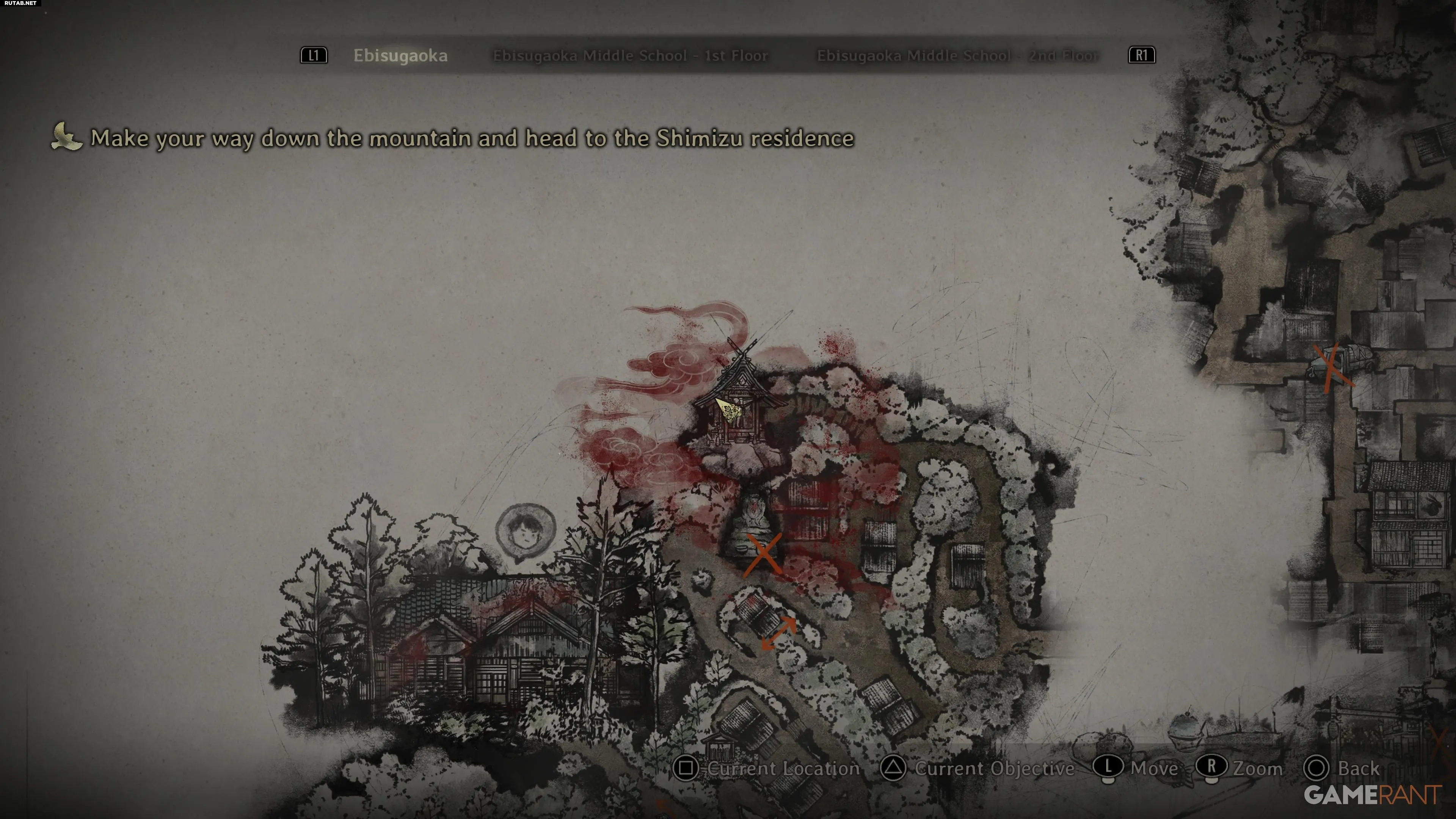 После получения Священного Меча и завершения головоломки продолжите главу с Главным Залом. Вы окажетесь у дома Сю, а затем попадёте в Эбисугаоку. Пройдя через врагов, вы увидите развилку: правая дорога — основной путь, а левая ведёт к лестнице, ведущей к небольшому святилищу.