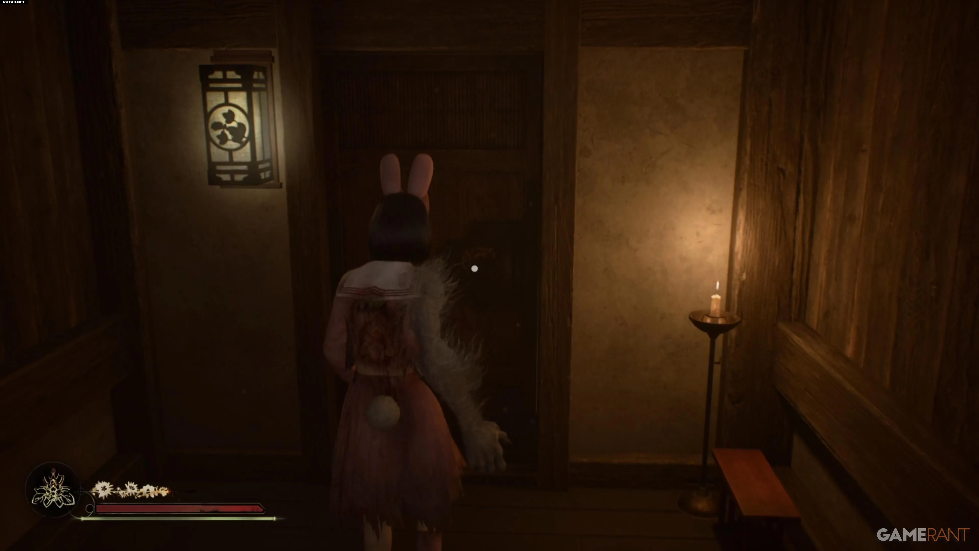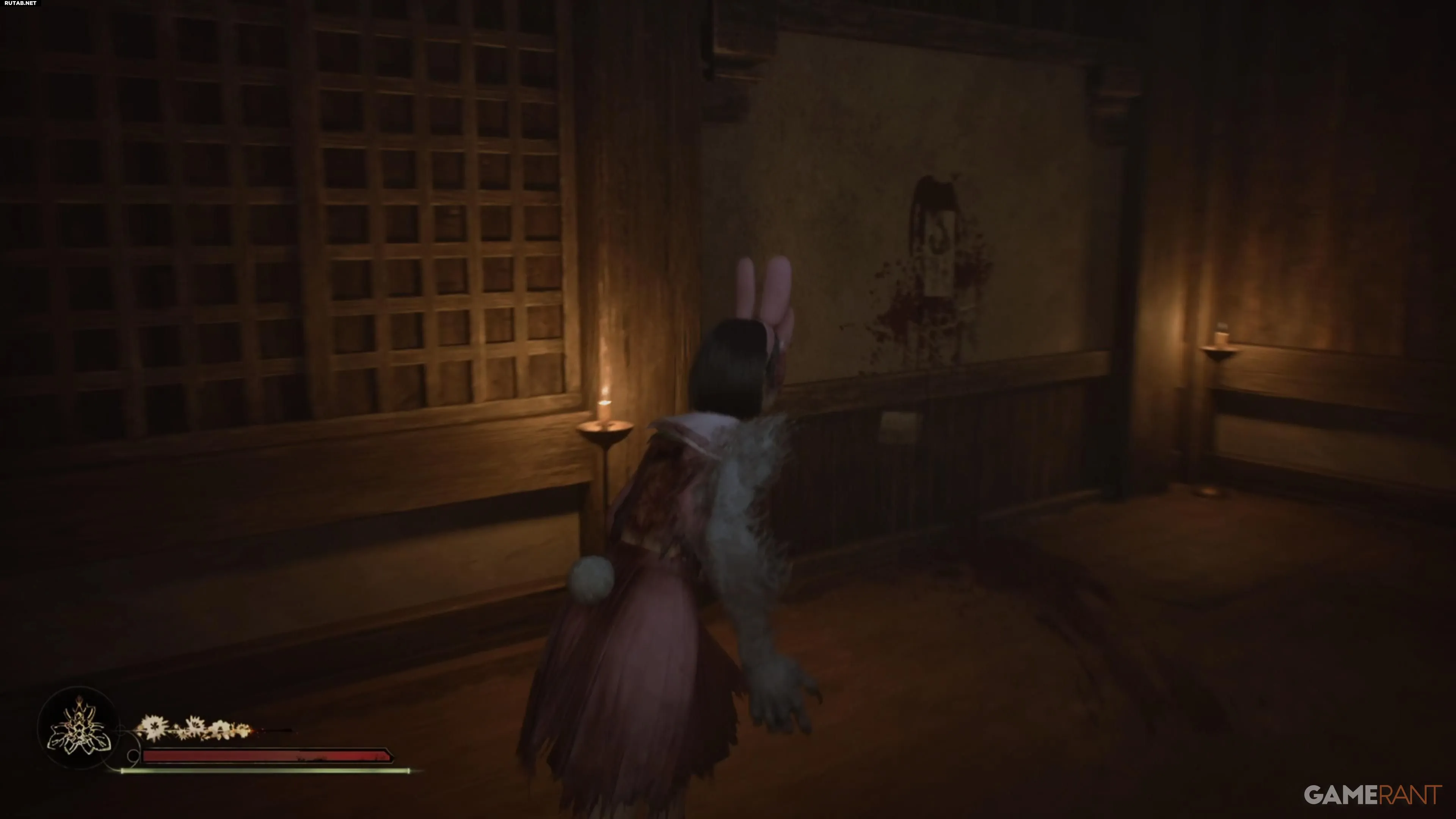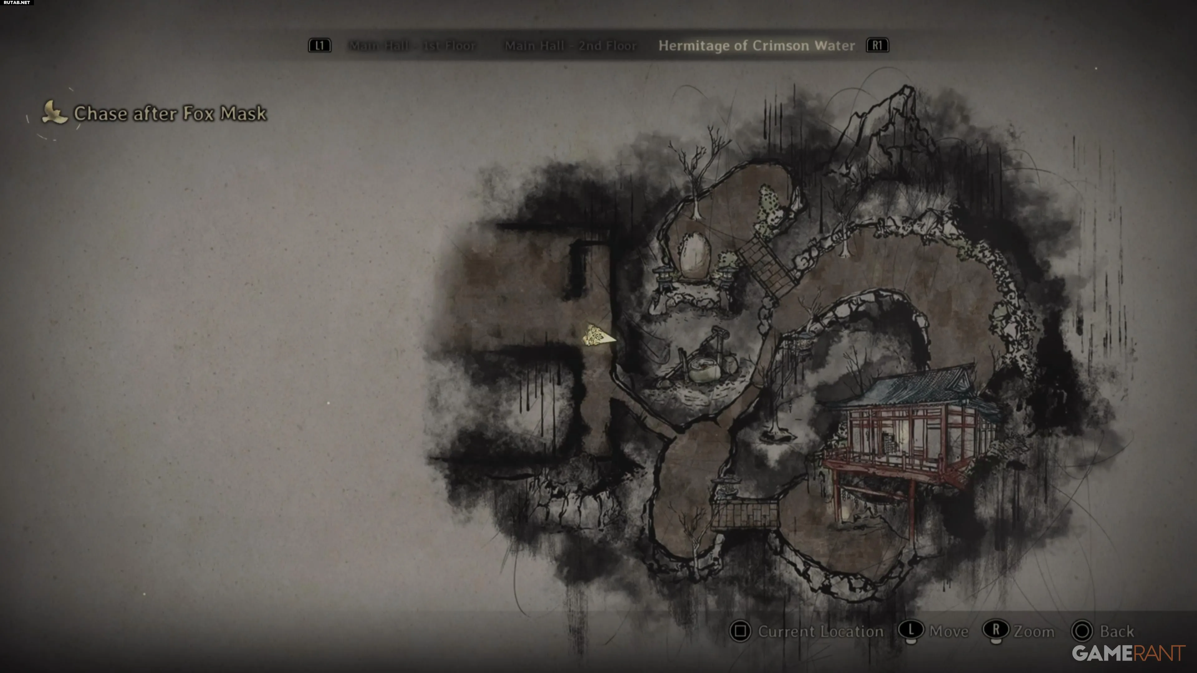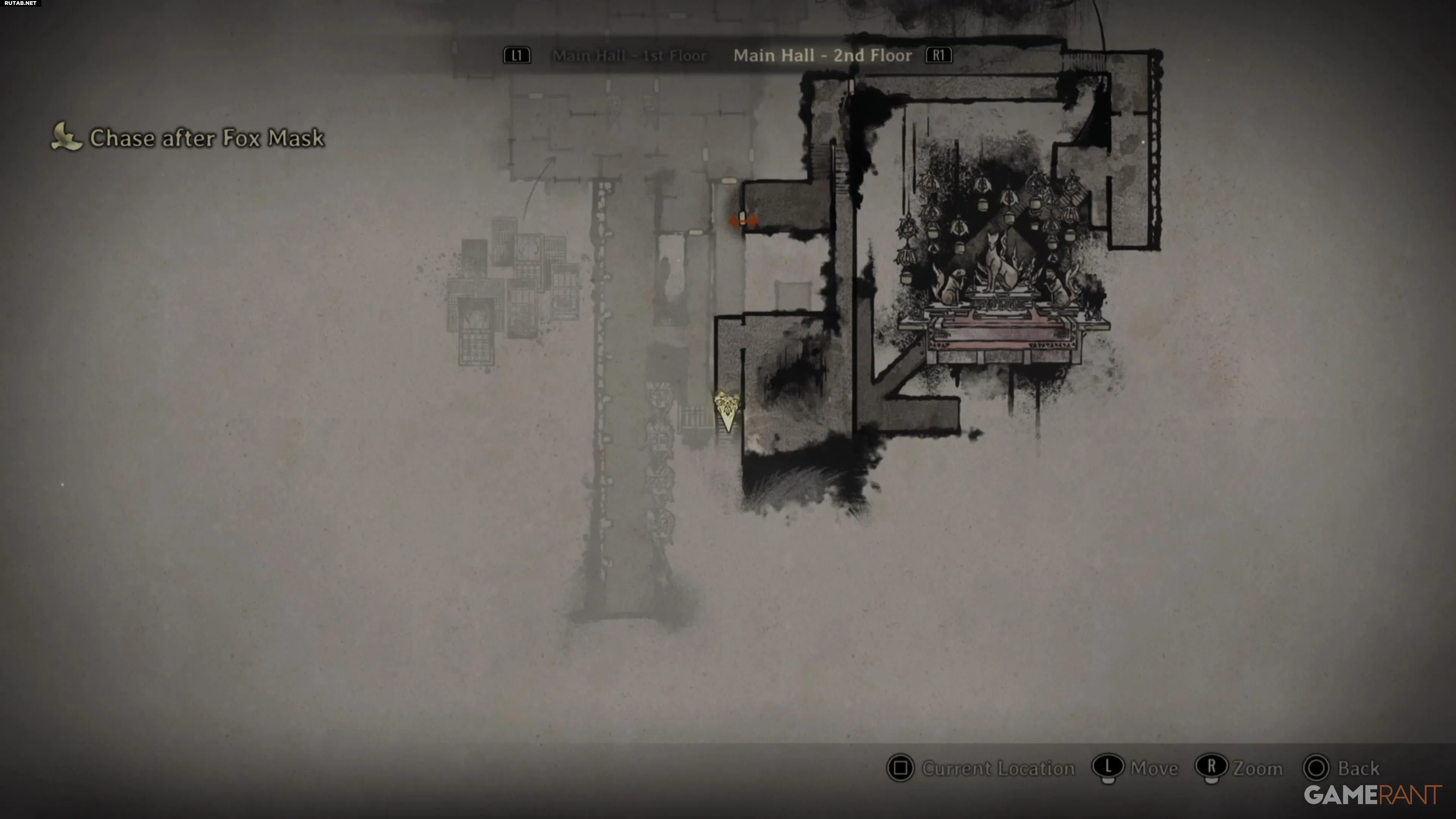 Чтобы начать эту головоломку, пройдите основную историю в режиме NG+ до Главного Зала. Поскольку у вас уже есть лисья рука и способности, можно пропустить большую часть главы. Направляйтесь на юго-восток карты, откройте дверь и поднимитесь по лестнице. Пол наверху повреждён, поэтому придётся обойти комнату.
