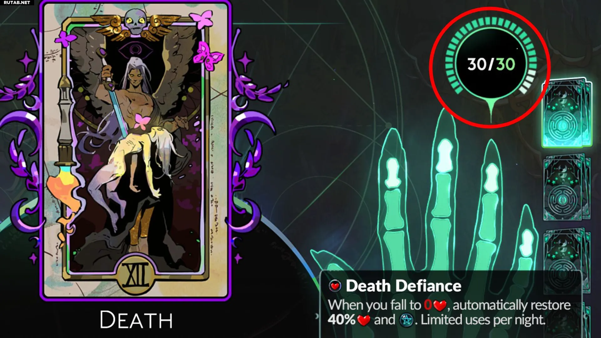 Изначально у игроков всего 10 единиц Хватки, что быстро становится ограничивающим фактором по мере открытия новых карт Арканов с более высокой стоимостью. Тратя Волю на увеличение Хватки, игроки могут повысить этот показатель до максимума – 30 единиц.