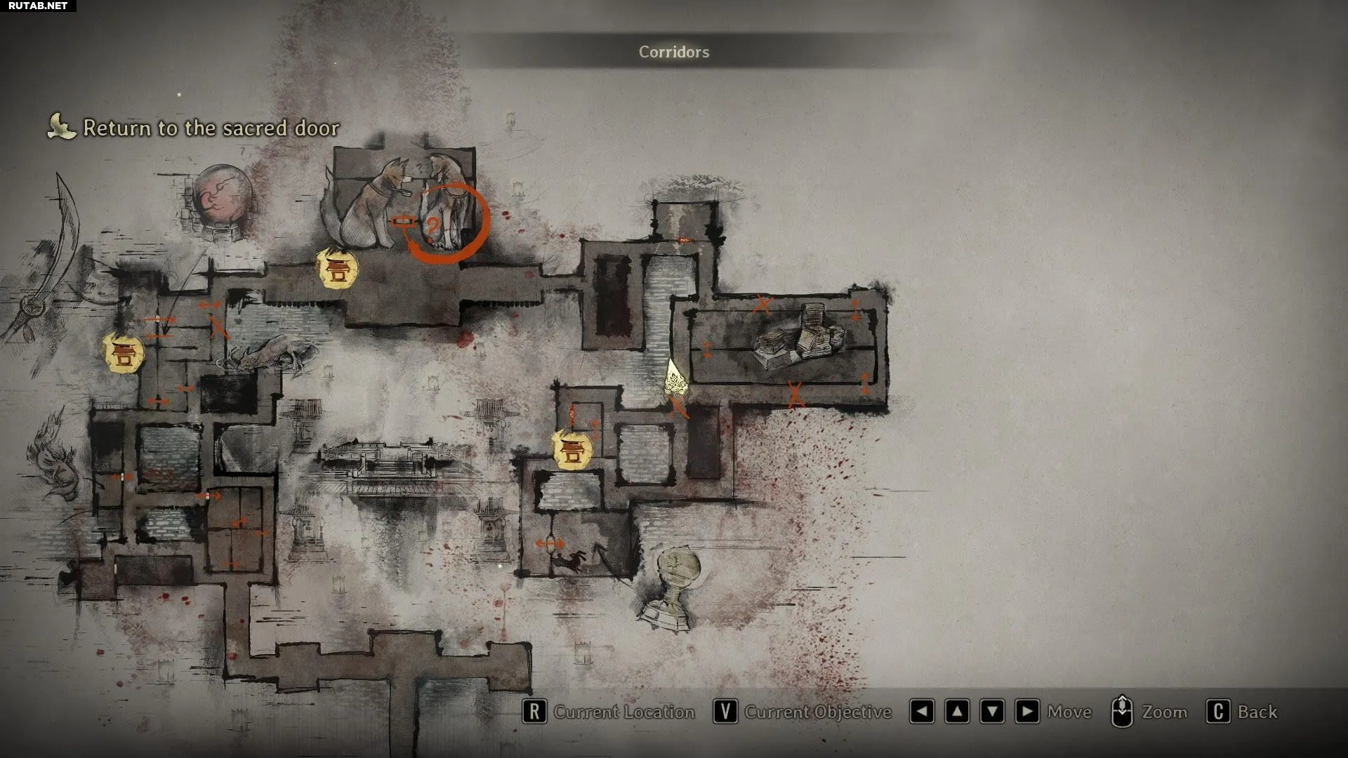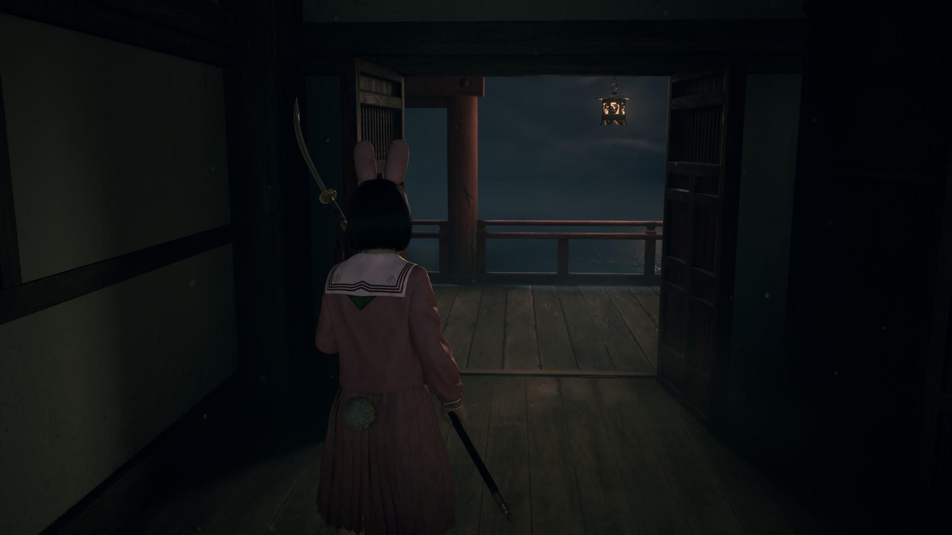 Подобрав Нагинату, вы обнаружите, что ваш Фонарь уничтожен. Двери автоматически откроются, и вы сможете продолжить движение к Священной Двери. На выходе вы увидите комнату, освещённую фонарями и окутанную красным туманом. Слева вы заметите Святилище Хокора.