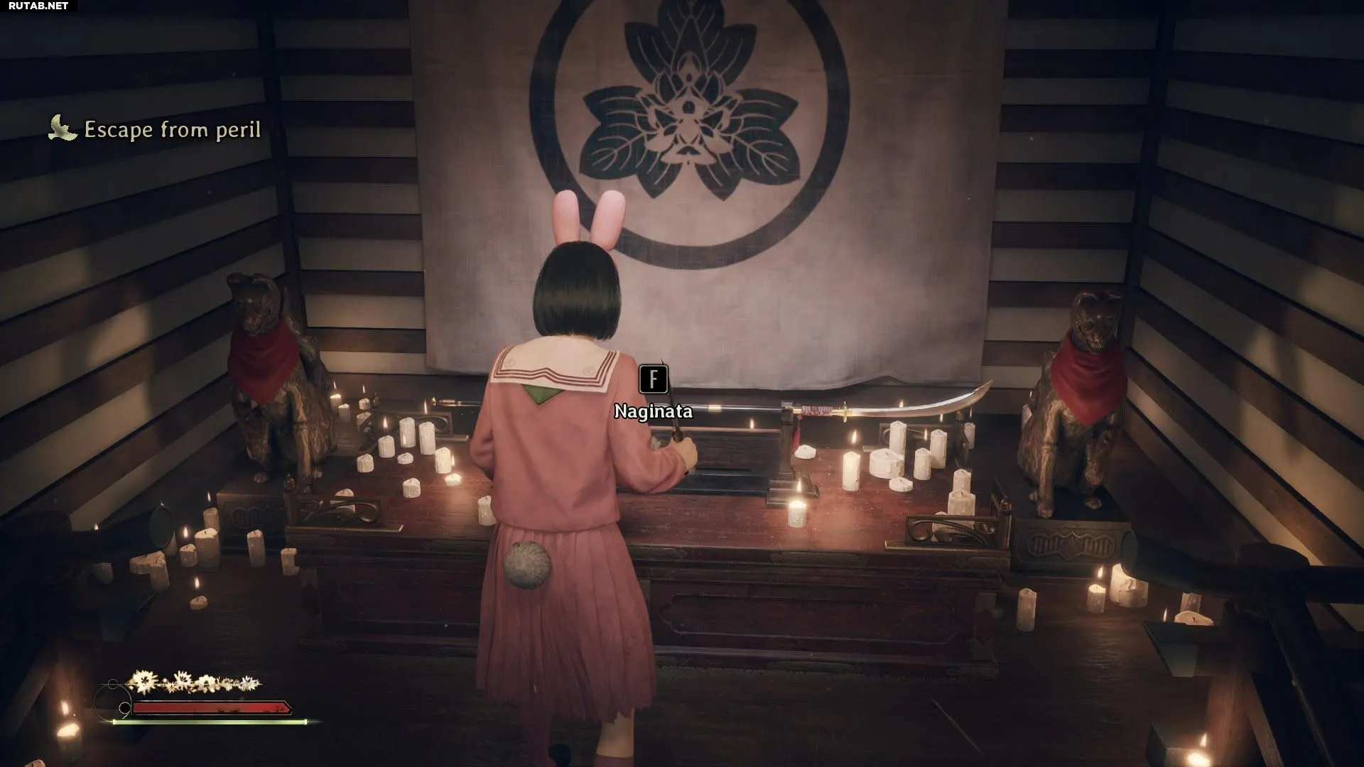 Вернитесь к алтарю и поместите Скульптуру Инари в его центр. Это откроет потайной проход. Войдите в него — начнётся кат-сцена. Здесь вы столкнётесь с Монстром с лезвиями вместо ног. Не вступайте в бой, а бегите вперёд и подберите оружие Нагинату.