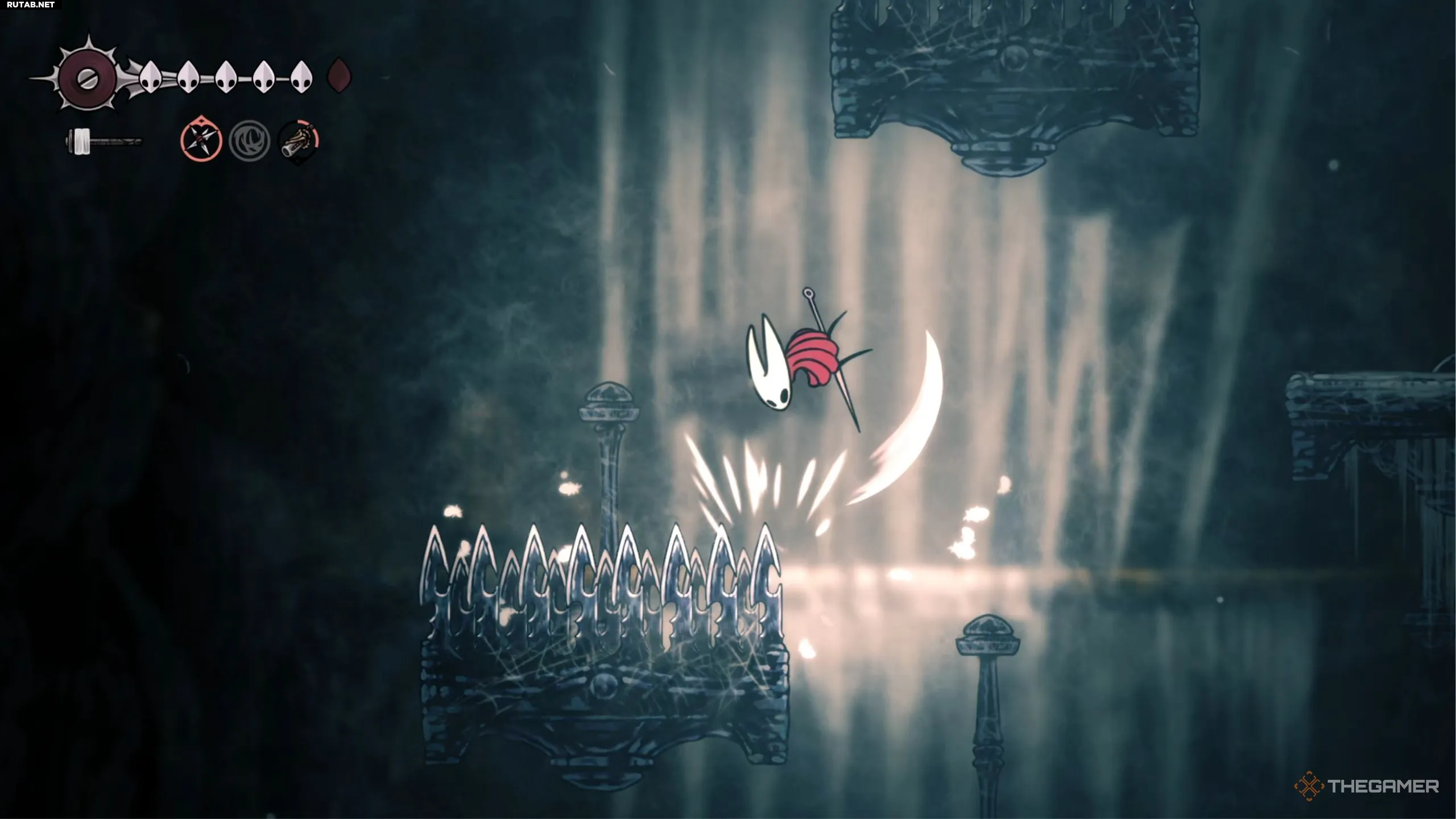 В главном зале нужно запрыгнуть на несколько платформ и атаковать сверху шипы, чтобы добраться до босса и бросить ему вызов.
