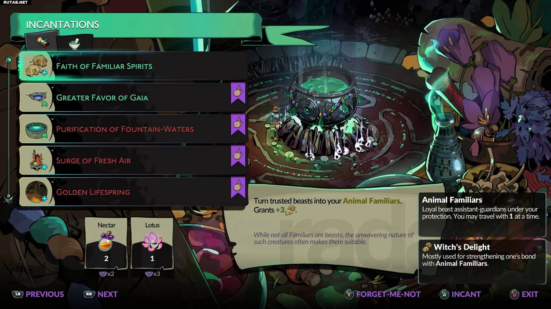 Вы можете улучшить бонусы, которые предоставляет каждый фамильяр, после того как сотворите заклинание «Доблесть духов фамильяров». Оно автоматически появится в котле после того, как вы установите связь с Фриносом, Тулой и Раки. Для сотворения этого заклинания требуется 1 Шерсть и 3 Пшеницы.