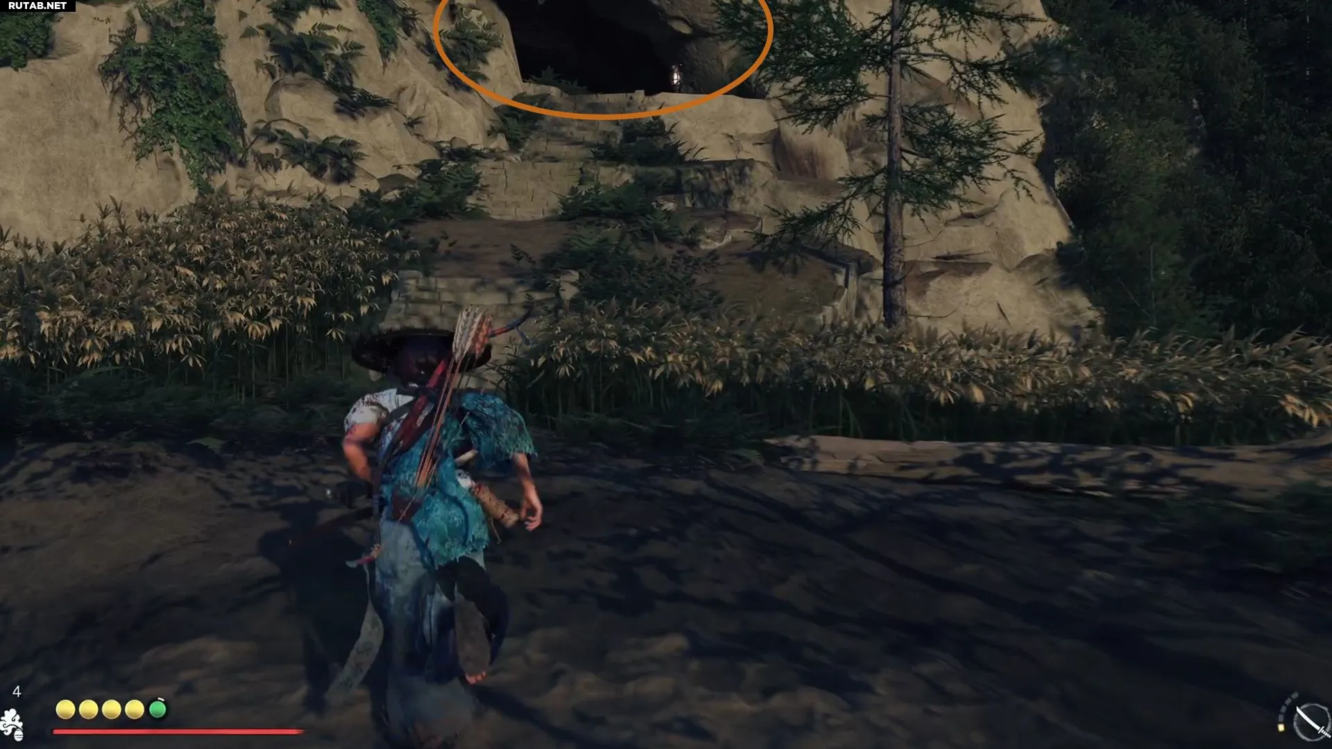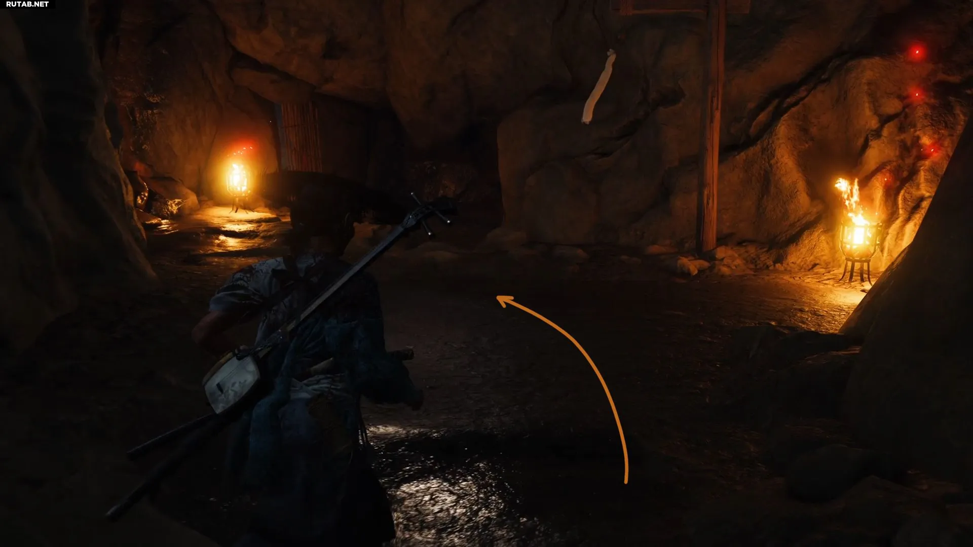 Разобравшись с врагами, Ацу может осмотреть пещеру, но путь внутрь преградит массивная деревянная дверь. Единственный способ попасть внутрь — сыграть на своем сямисэне у ворот. Сома, находясь внутри, оценит музыку и откроет доступ в пещеру.