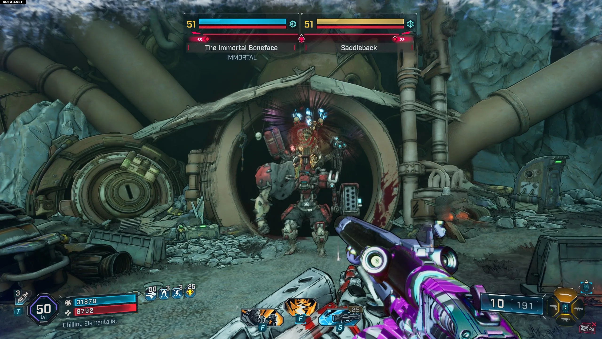 Чтобы добраться до самого Бессмертного Костяного Лица, сначала нужно убить Сэддлбэка, который скрывает второго босса. Сэддлбэк — крупный Тупоголов с двумя полосками здоровья. Первая — броня, поэтому используйте коррозионный и криогенный урон. Вторая — плоть, так что применяйте зажигательное оружие. После смерти Сэддлбэка Бессмертный Костяное Лицо теряет свою бессмертность: его первая полоса здоровья — щит (уязвим к электрошоку), а вторая — снова плоть, так что очередная порция зажигательного урона докажет его смертность.