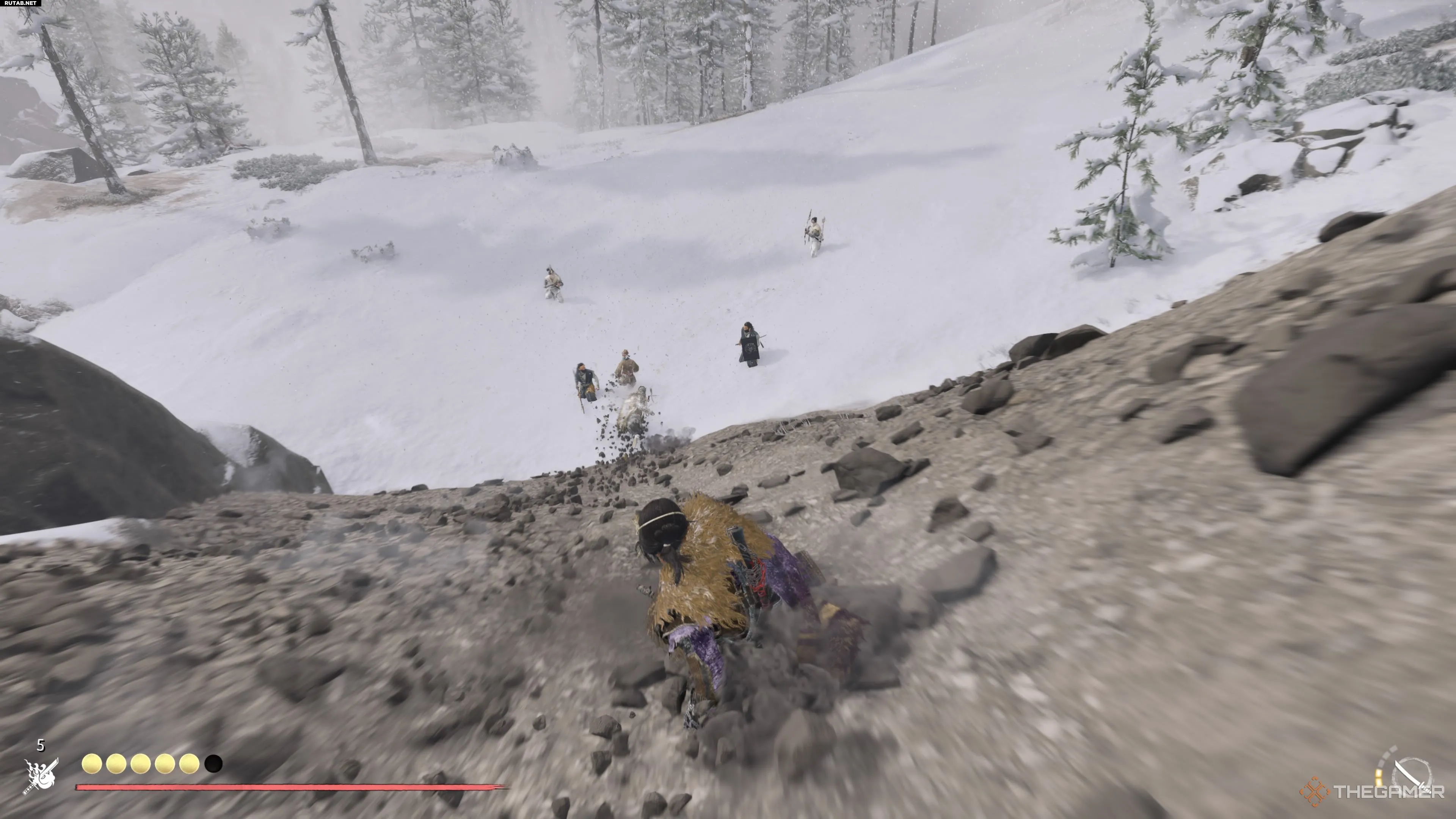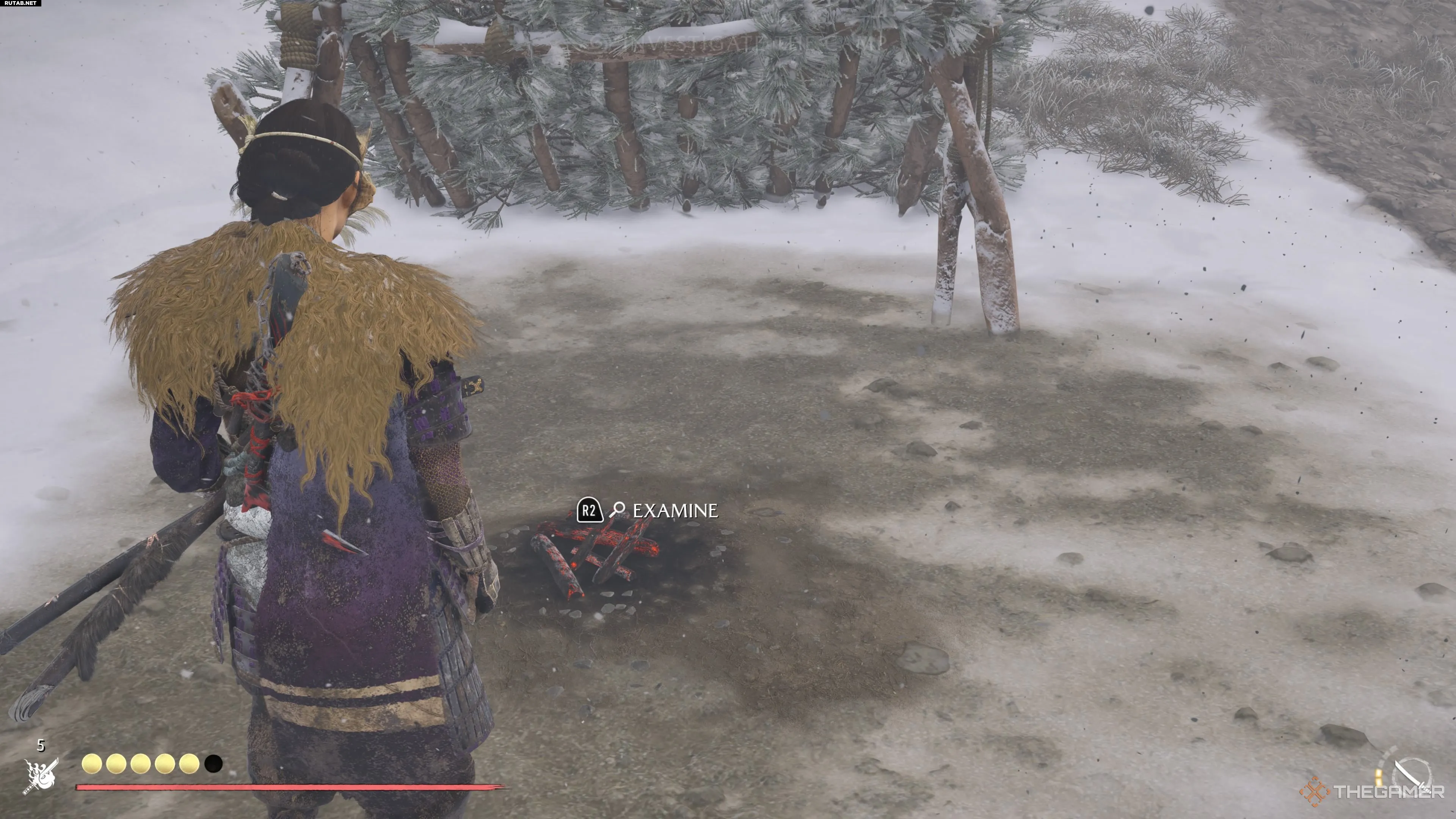 Подойдите к нему и заметите торчащий из скалы напротив пень. Прыгните и схватитесь за него с помощью R2. Сделав несколько шагов вперед, вы обнаружите тлеющий костер. Взаимодействуйте с ним, чтобы запустить кат-сцену, затем скатитесь по ближайшему каменистому склону. Это приведет вас к внуку, на которого напали враги. Отразите атаку, помня, что нужно сохранить внука в живых — в первую очередь сосредоточьтесь на противниках, атакующих его.