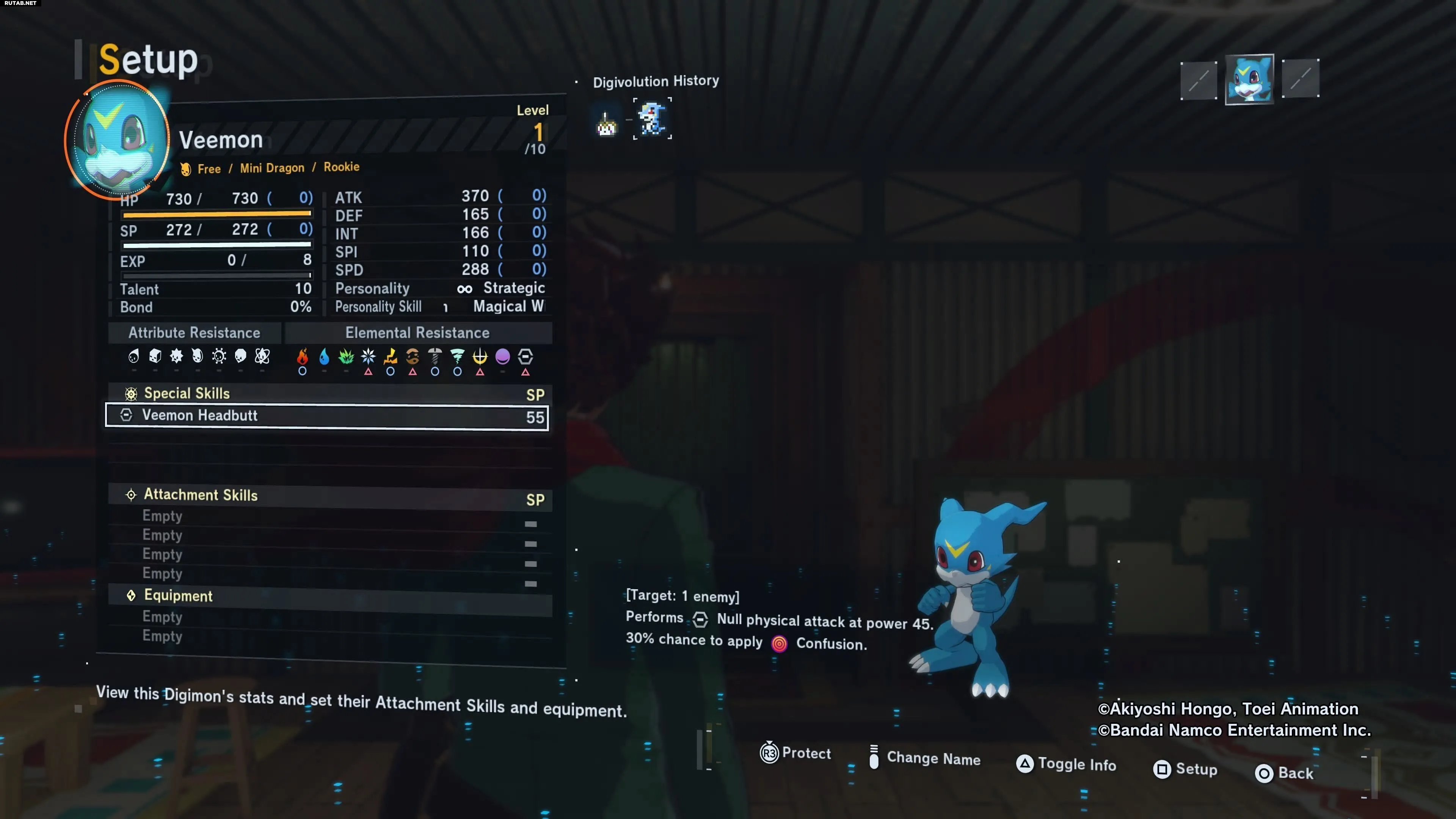 Также требуется Ранг Агента 1 (это стартовый ранг, так что проблем нет). Как только выполнены минимальные требования, вернитесь в меню дигиволюции, где силуэт Вимона станет доступным путем. Поздравляем! Теперь у вас есть Вимон с его специальным умением Удар головой Вимона.