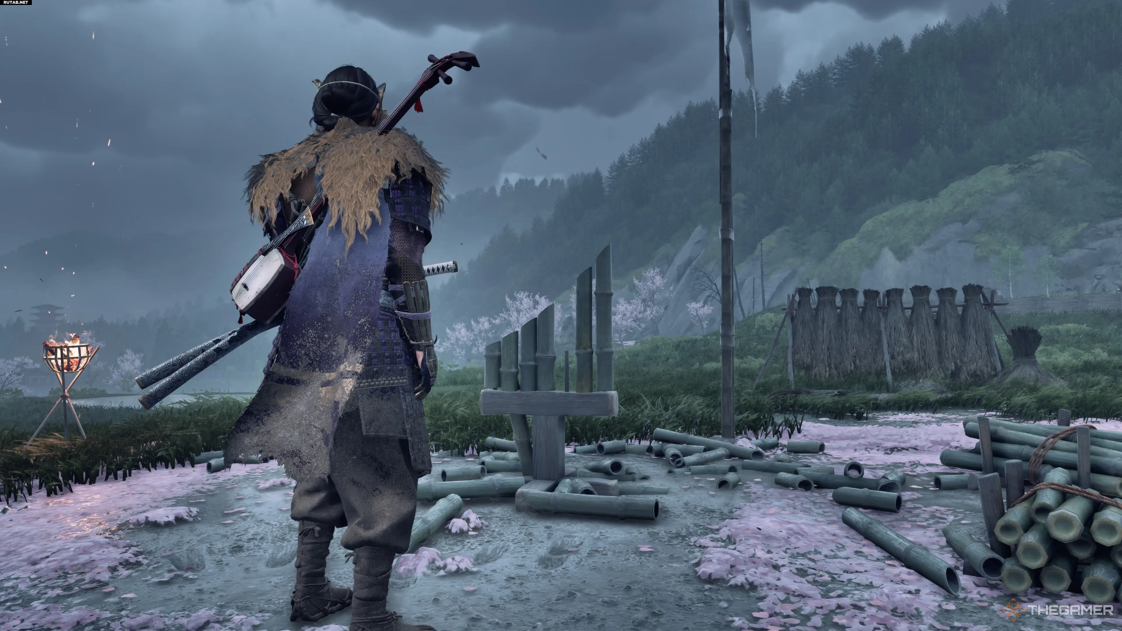 К счастью, здесь не требуется специального снаряжения — нужно лишь осмотреться. Прямо за вами, когда вы стоите у пьедестала, вы увидите два меча-катаны и четыре яри (копья), торчащие из земли. Они действуют как громоотводы, поэтому поднимите их все и отбросьте подальше. После этого вы сможете завершить бамбуковый удар без проблем.