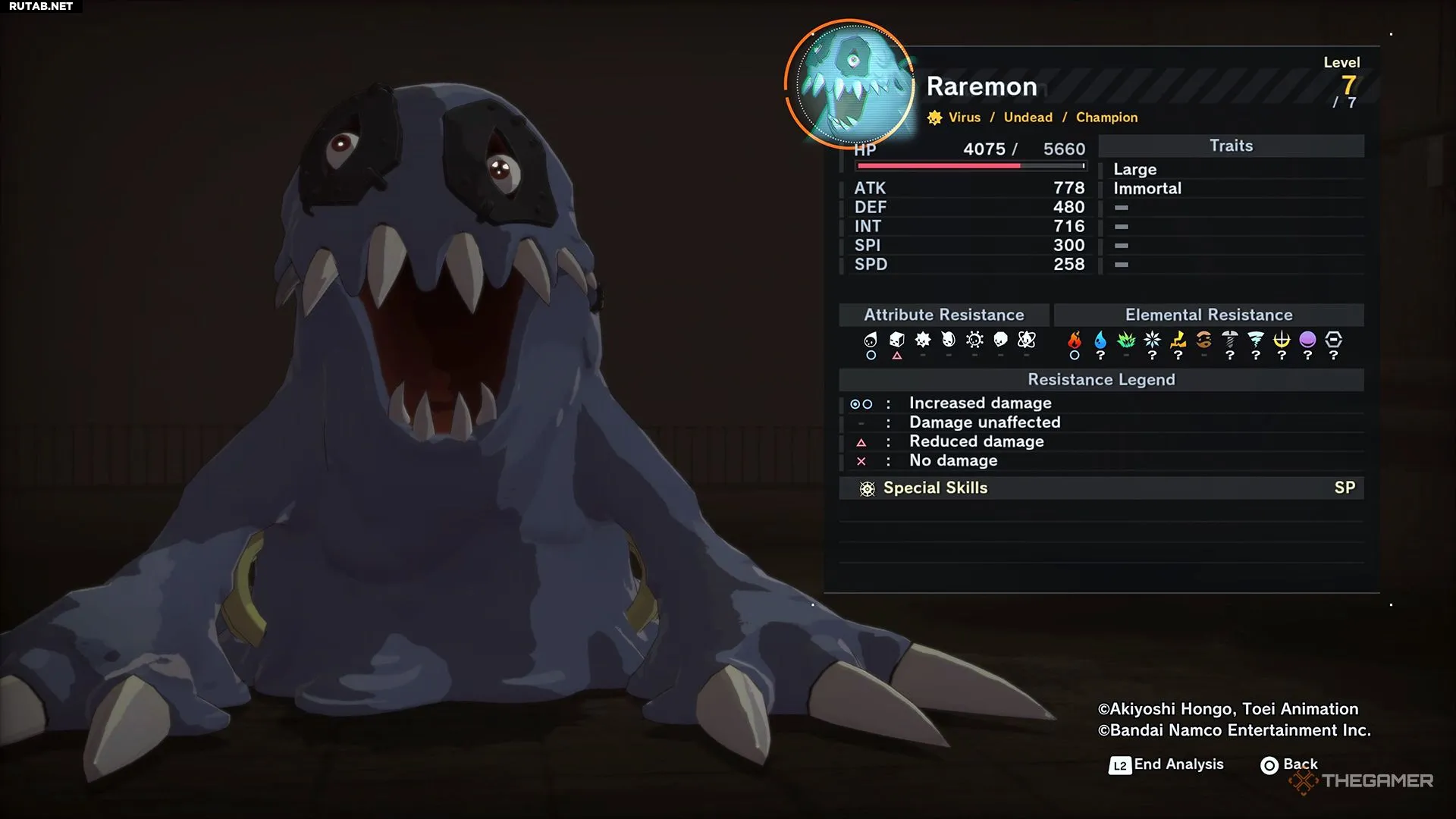 Рейрмон — дигимон атрибута Вирус, что делает его уязвимым к Вакцине и сильным против Данных. Что касается элементального урона, Рейрмон слаб к Огню и Свету и устойчив к Воде и Тьме. Кроме того, босс будет в основном использовать атаки Тьмы на протяжении всего боя, так что учитывайте это при формировании команды.
