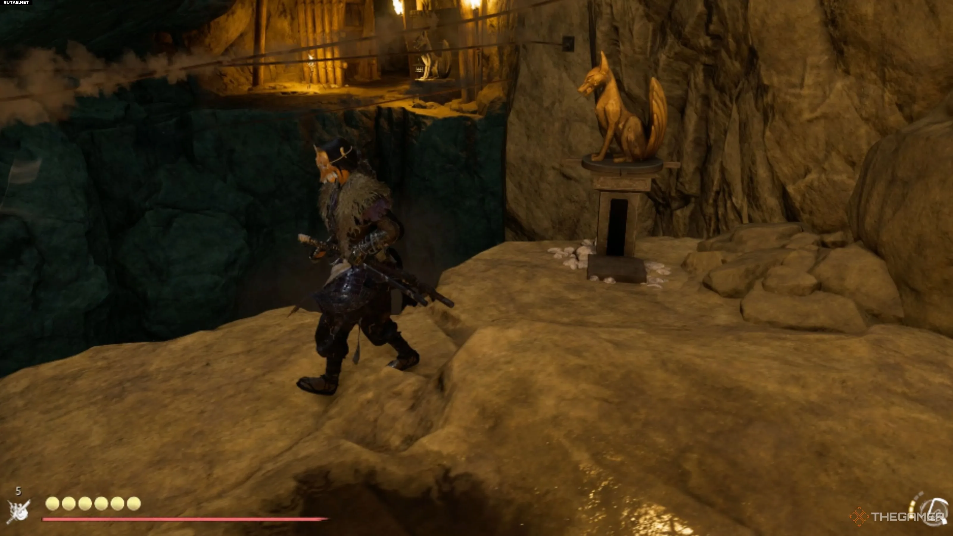 Внутри вы увидите пропасть и две лисьи статуи. Разверните их лицом друг к другу — появится веревка для перехода. Далее будут еще две лисы, но они служат лишь декоративными лампами. За ними — еще одна статуя. Поверните ее налево, и появятся дополнительные веревки.