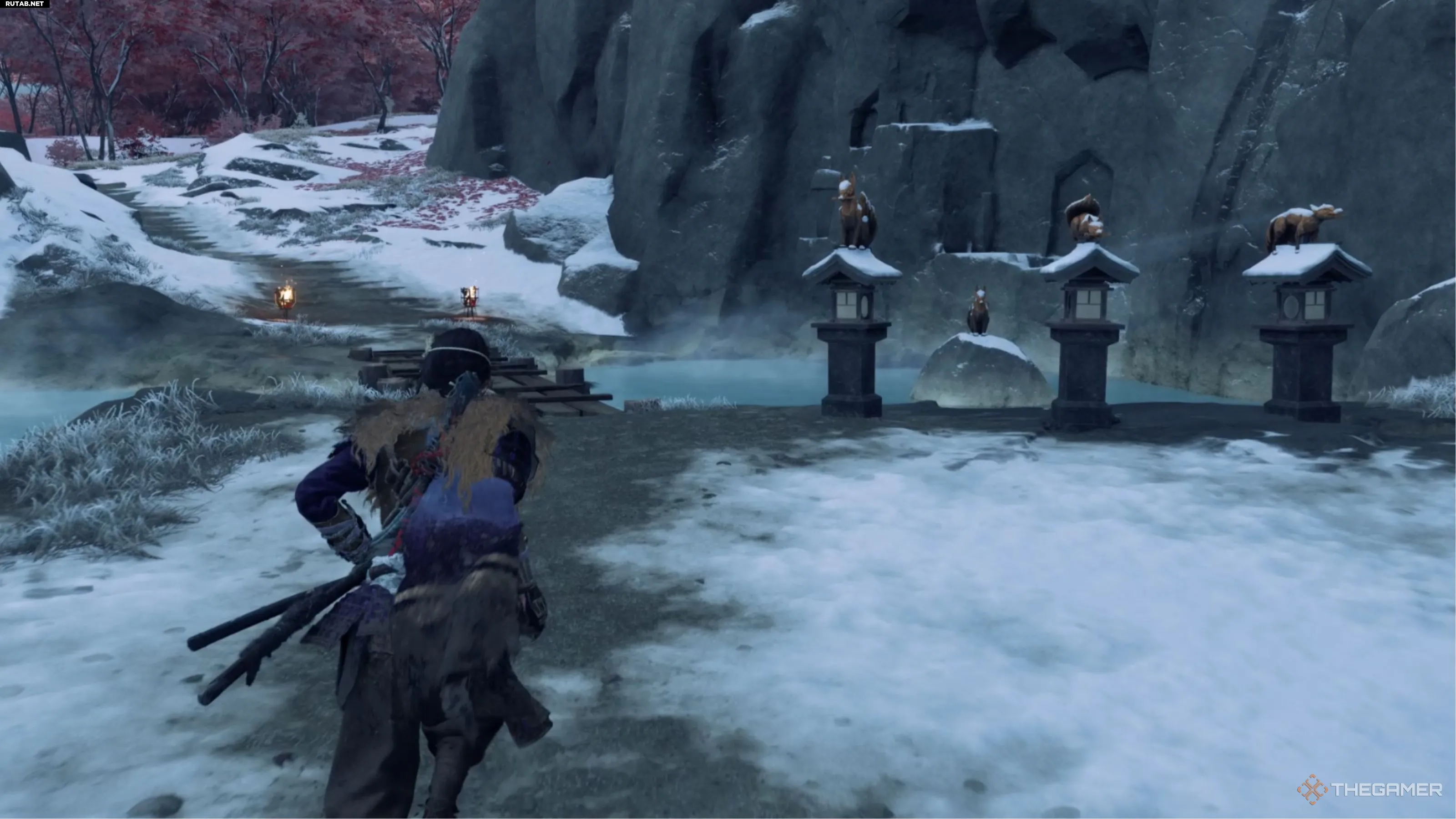 Святилище Снежных Родников расположено в юго-западной части пятого региона Ghost of Yotei — хребта Тесио. Как и во многих заснеженных районах, вход охраняют лисьи статуи, загадку которых предстоит разгадать.