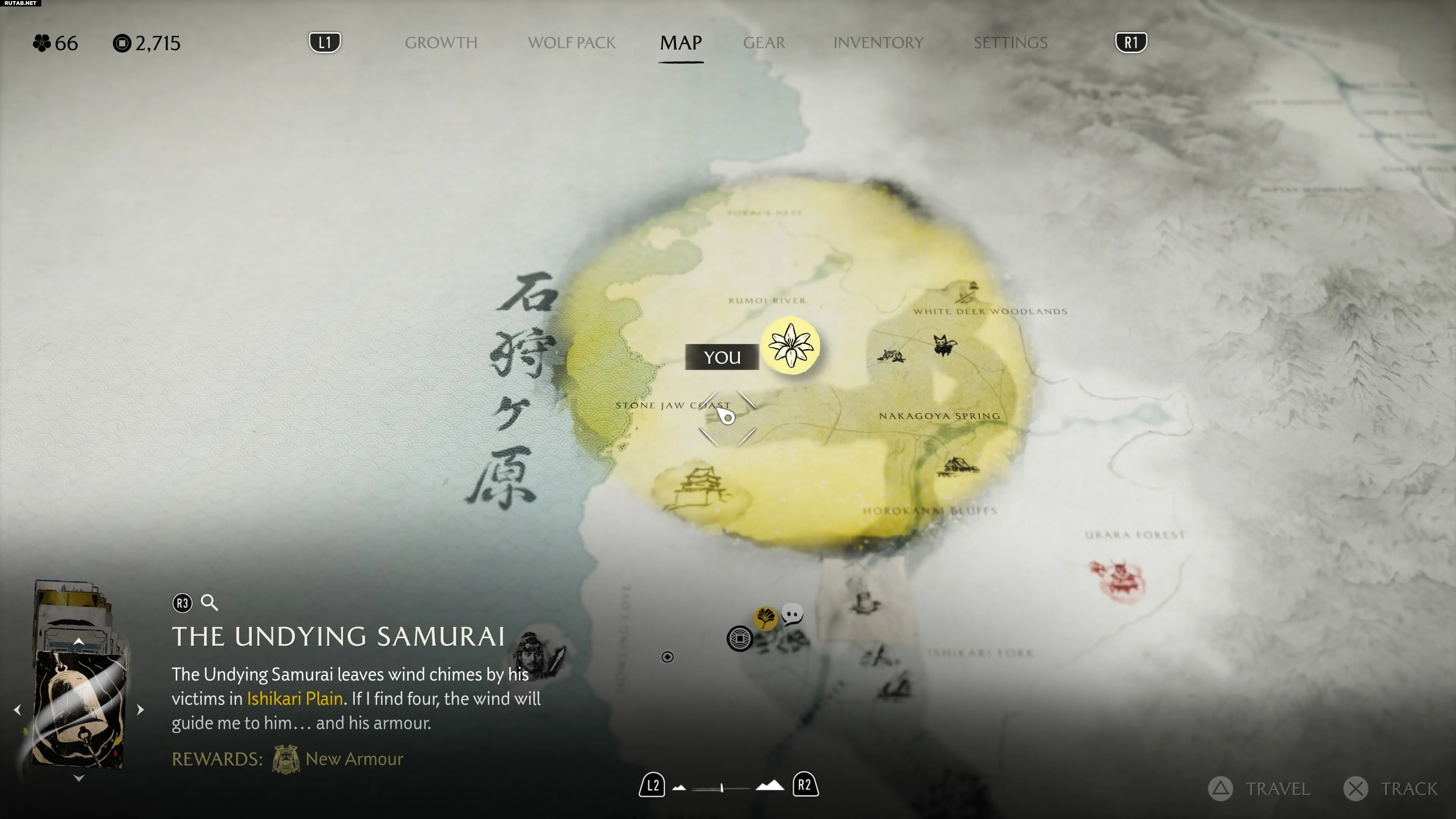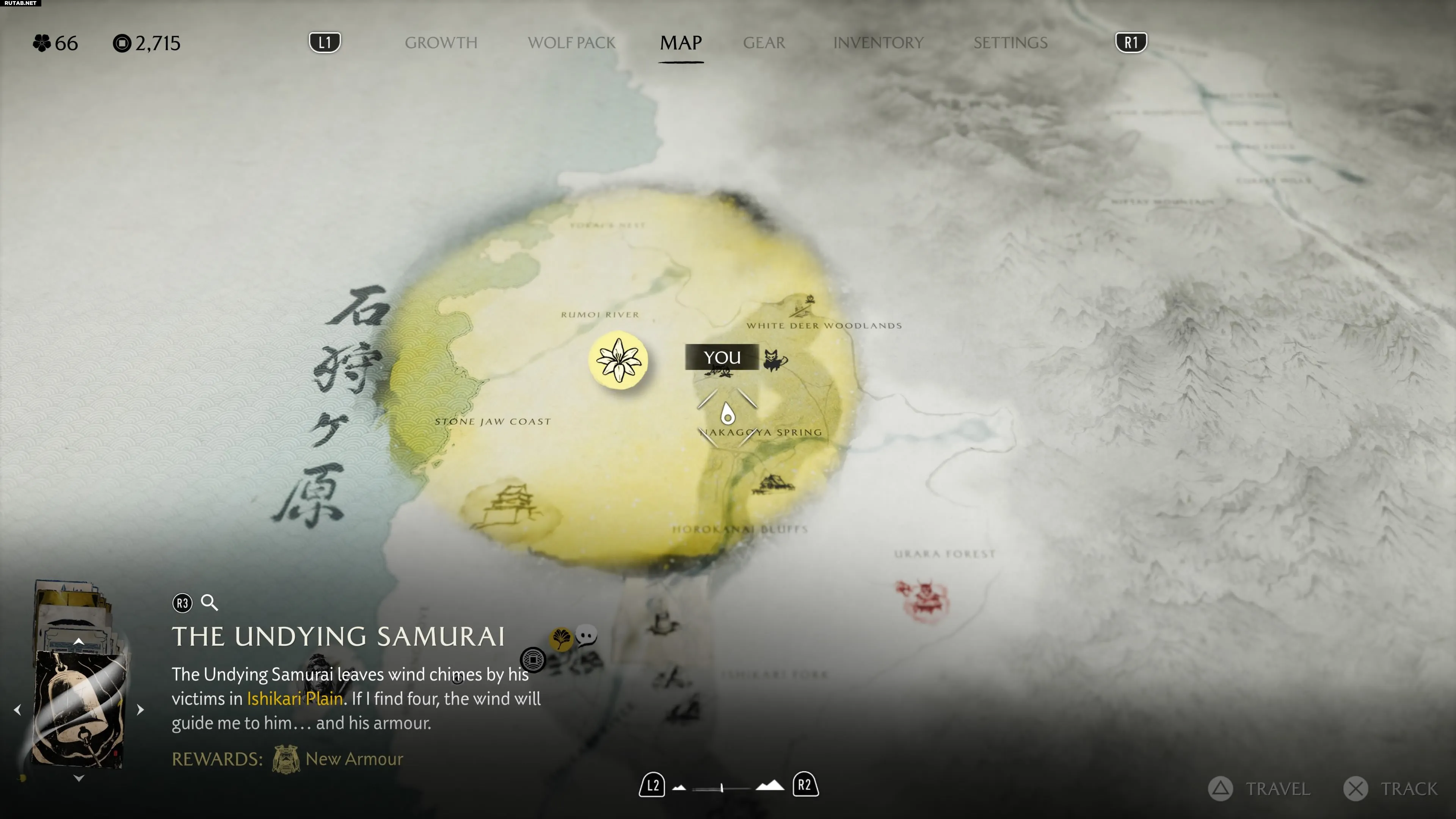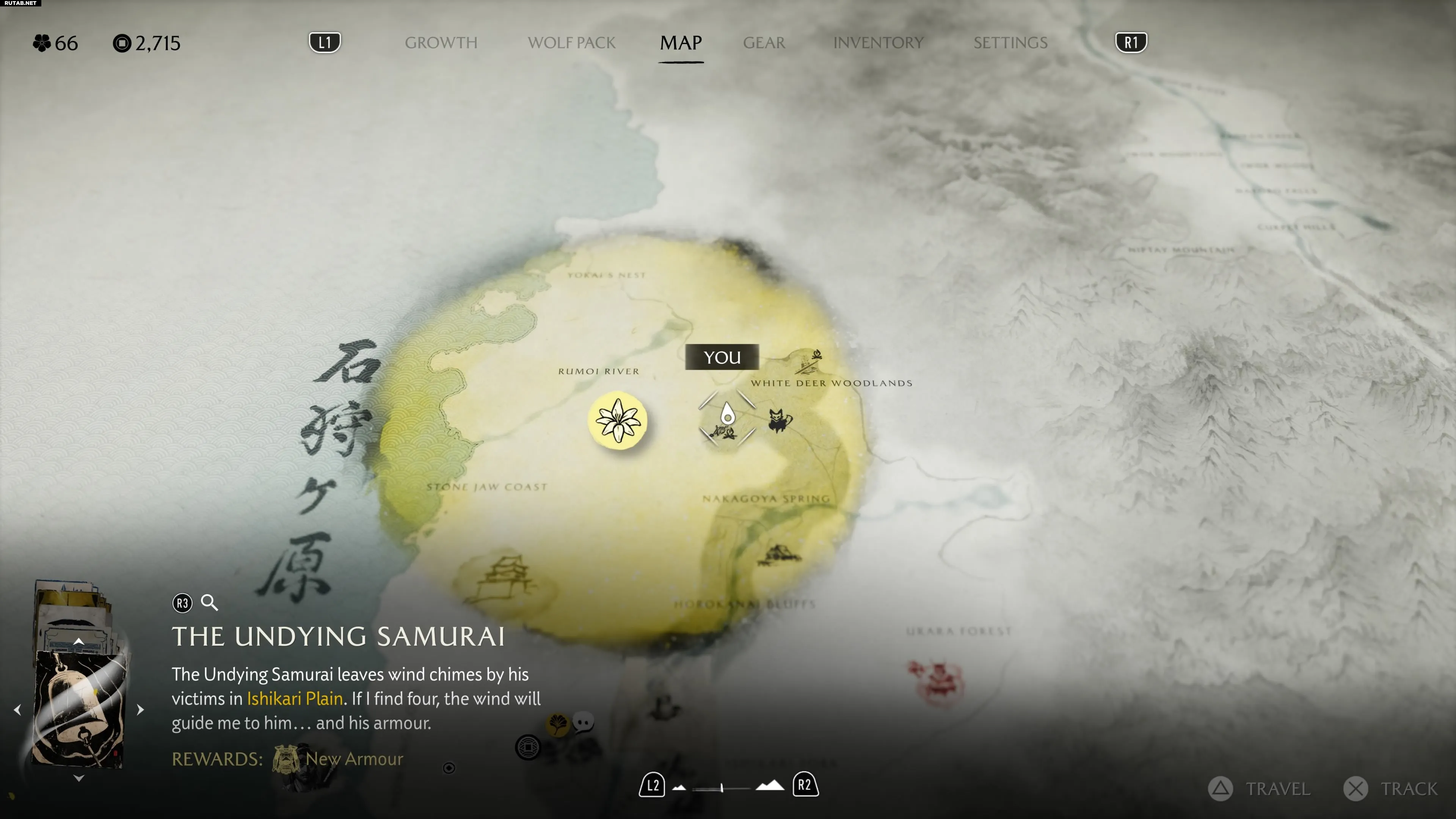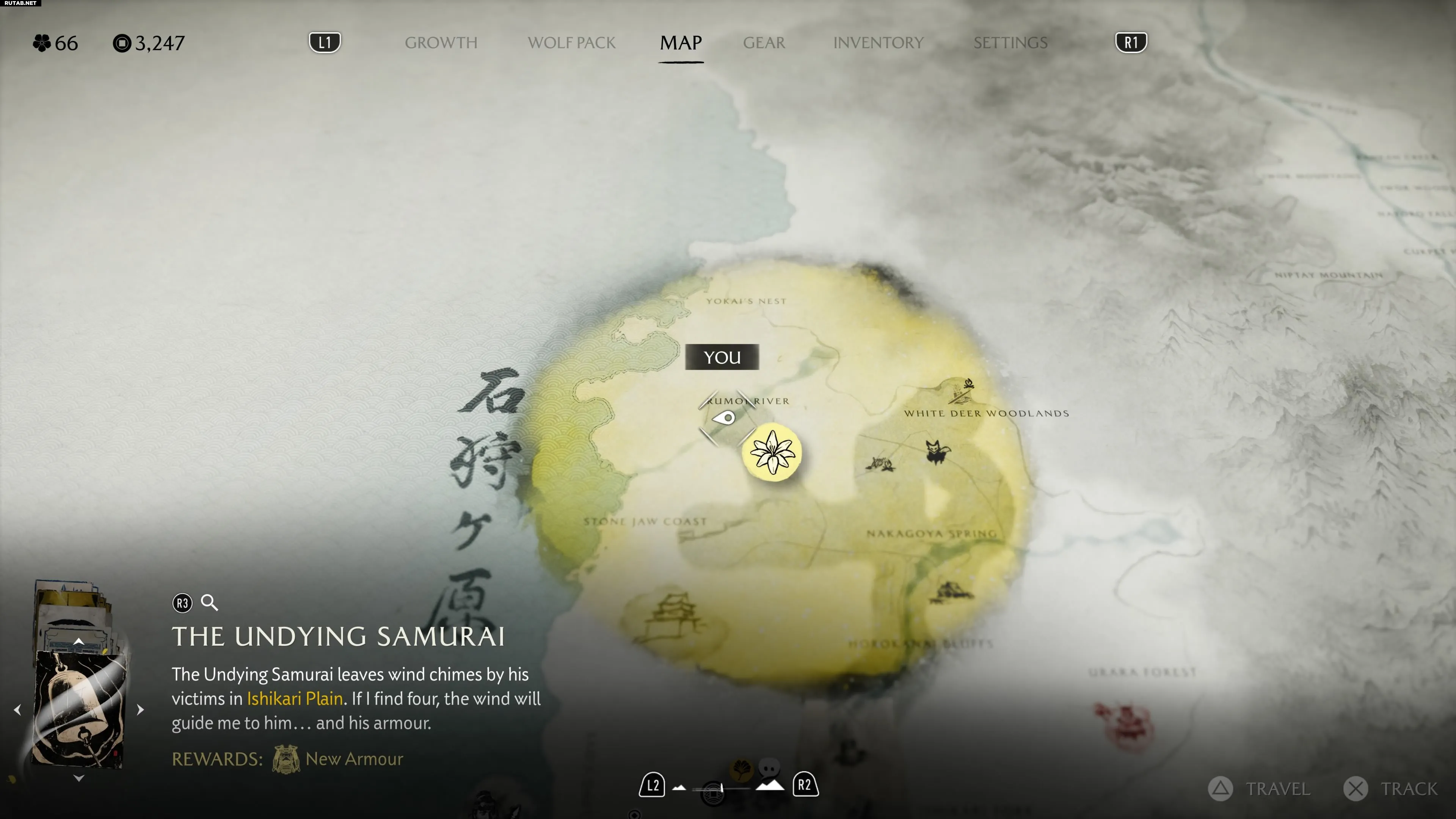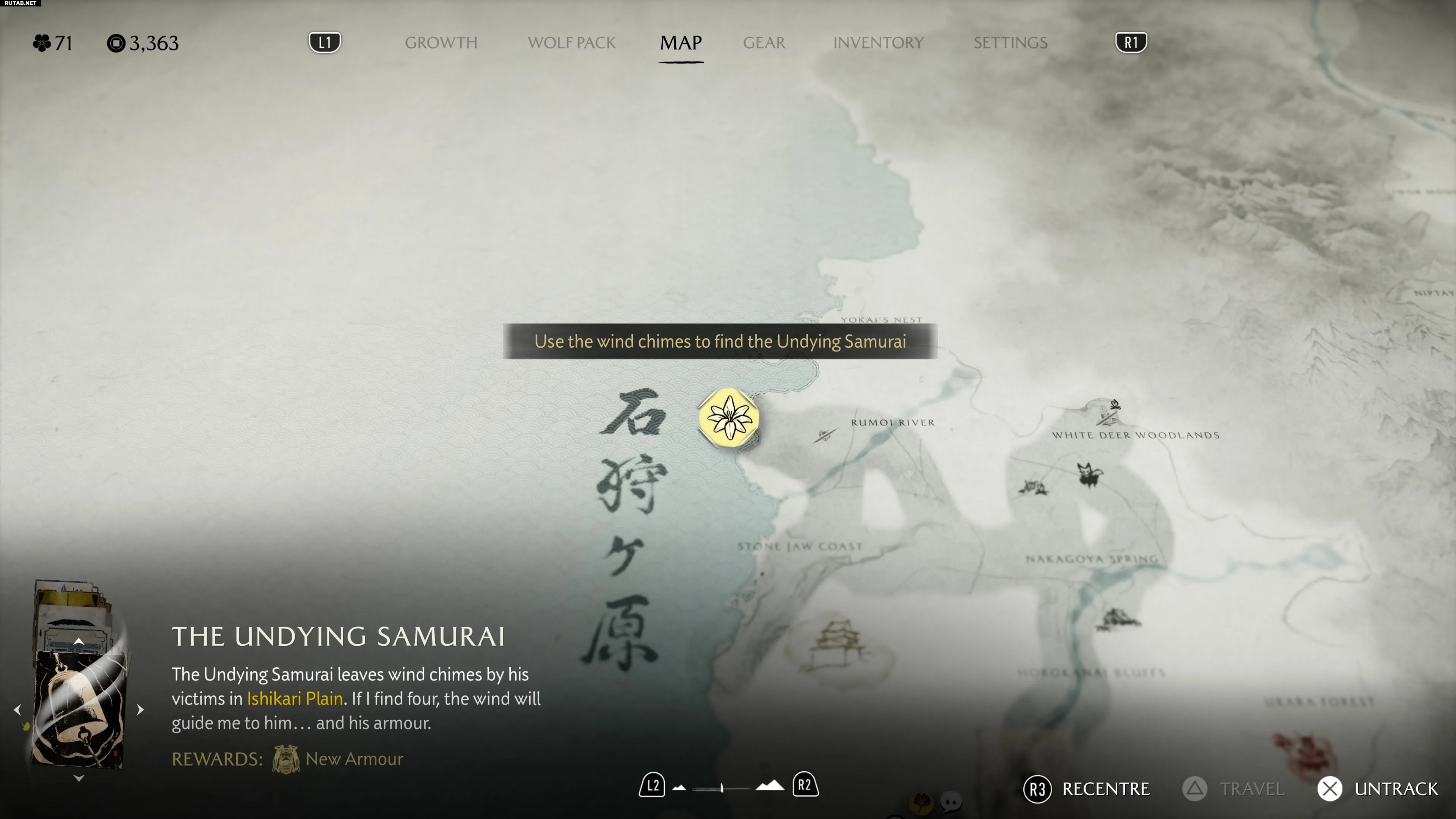Теперь, когда у вас есть все четыре колокольчика ветра, пора использовать их, чтобы найти убежище Бессмертного Самурая. Его логово расположено к северу от Берега Каменной Челюсти и к западу от реки Румой, поэтому игрокам следует направиться к самому западному краю равнины Исикари — к первому иероглифу на карте (см. изображение выше). Вы можете самостоятельно найти это место, проведя пальцем вверх по сенсорной панели: колокольчики будут громче всего звенеть в нужном направлении.