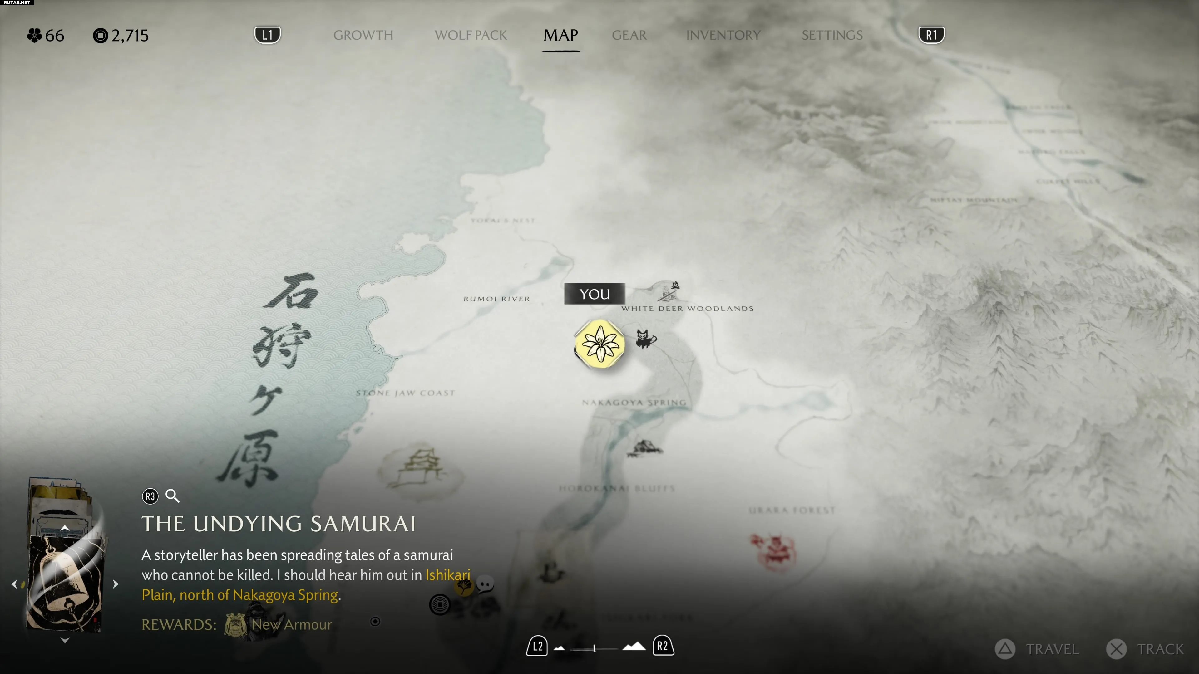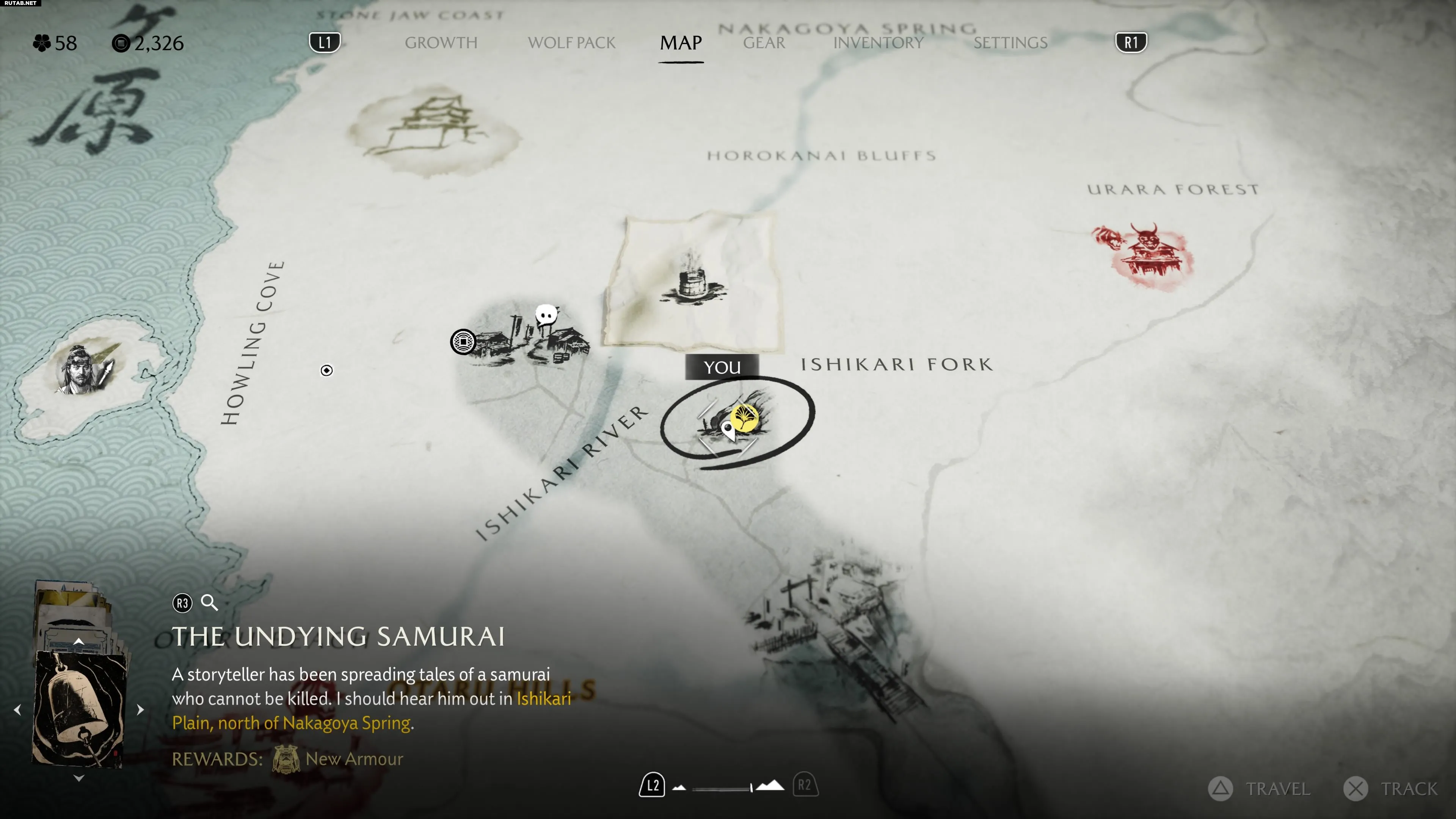 Отправляйтесь в северо-западный регион — на равнину Исикари. К востоку от рынка Исикари вы обнаружите сожжённую деревню. Внутри неё поговорите с мужчиной, сидящим у камня: он поведает слух о Рассказчике и Бессмертном Самурае. Это положит начало нужному вам мифическому сюжету. Теперь остаётся найти Рассказчика Угэцу, чтобы узнать подробности и начать квест.