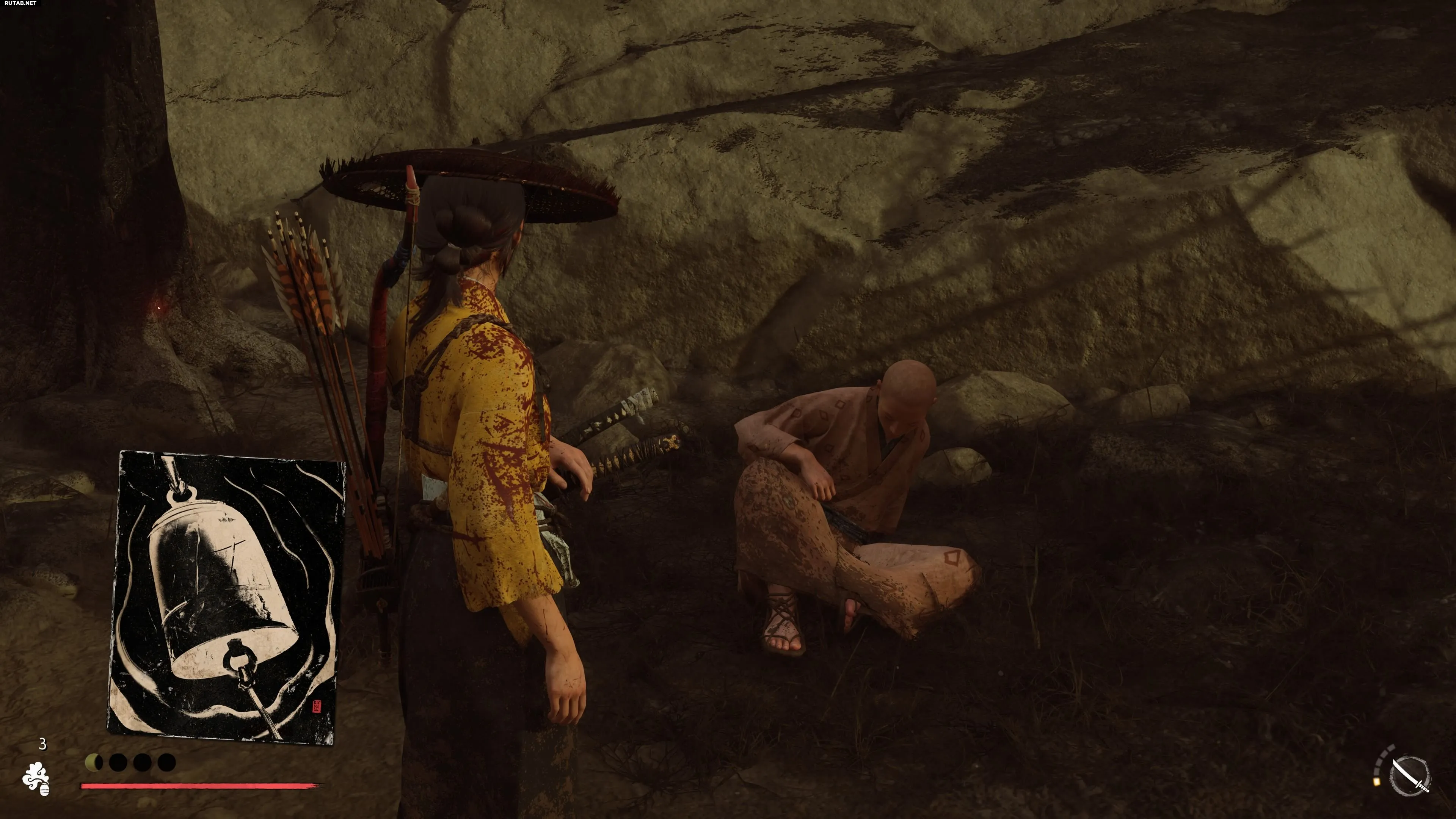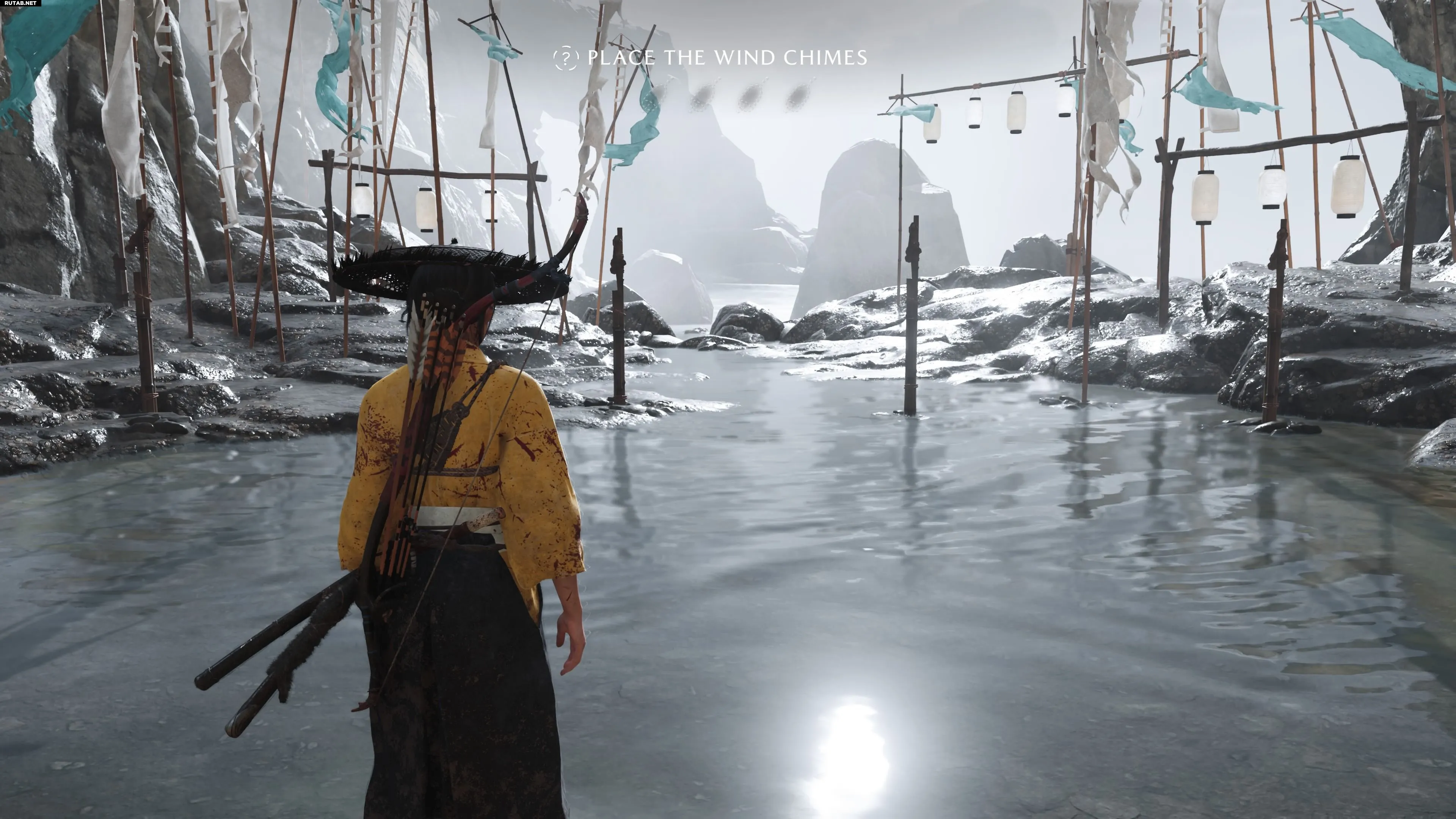 Добравшись до указанного утёса, вам нужно будет спуститься вниз от точки, где вы увидите шесты с доспехами самурая. Используйте верёвку, прикреплённую к обрубку дерева, чтобы спуститься. Следуйте по линейному пути вдоль скалы до самого низа, где вы попадёте в заполненную водой пещеру. Подойдите к четырём деревянным столбам, разместите на них колокольчики ветра, чтобы запустить кат-сцену и призвать Бессмертного Самурая для начала битвы с боссом.