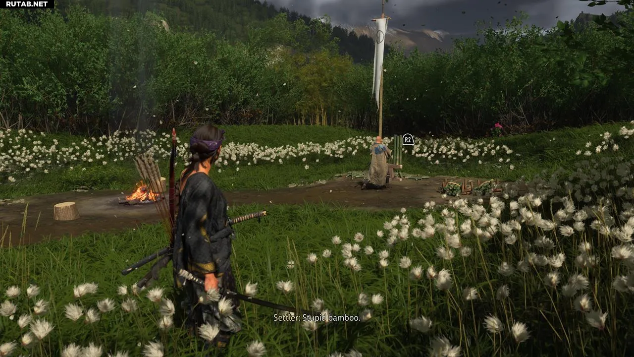 - Местоположение: на поляне, скрытой за бамбуковыми ветвями, которые нужно срубить. Поселенец насмехается над вами, но вы можете продемонстрировать свое мастерство.
