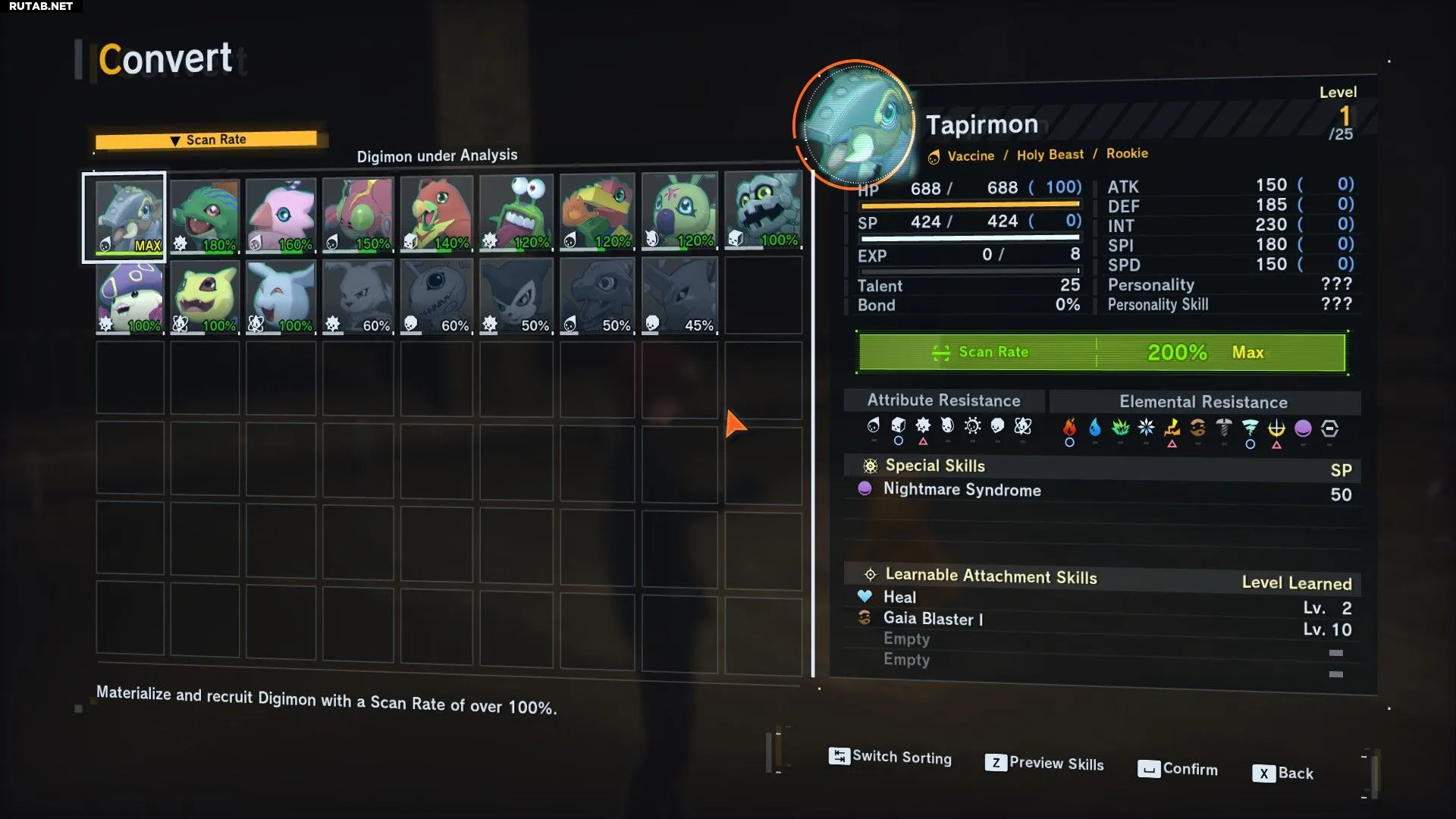 Например, для эволюции Wanyamon в Renamon потребуется повысить показатель SP до 380 или выше, а INT — до 230 или выше, чтобы эта эволюция стала доступной.