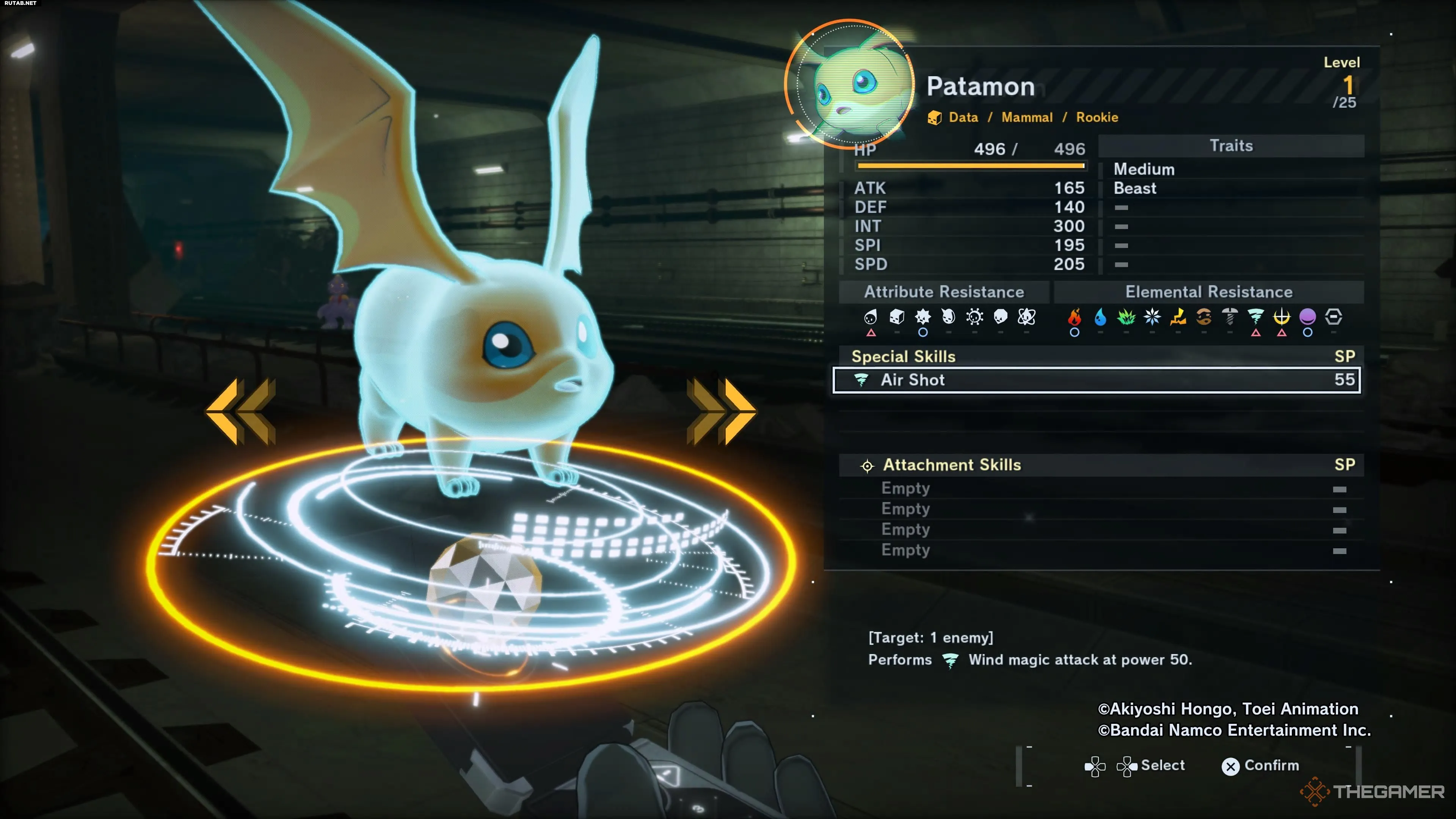 Также необходимо выполнить требования к характеристикам: 730 SP и 540 INT. Патамон достигает этих показателей относительно быстро, но у Кудамона, другого пути эволюции, базовые SP и INT выше, что ускоряет процесс.