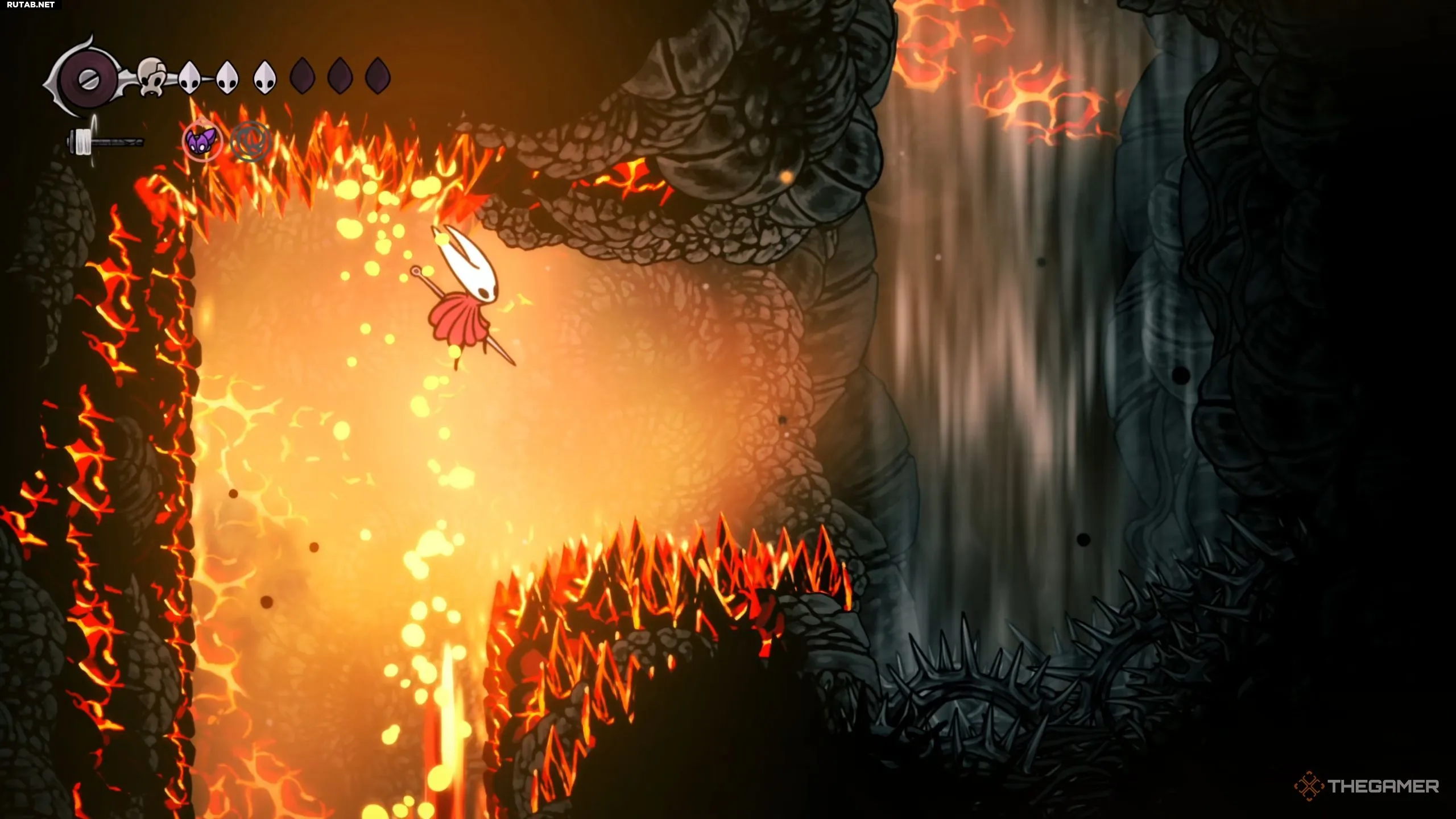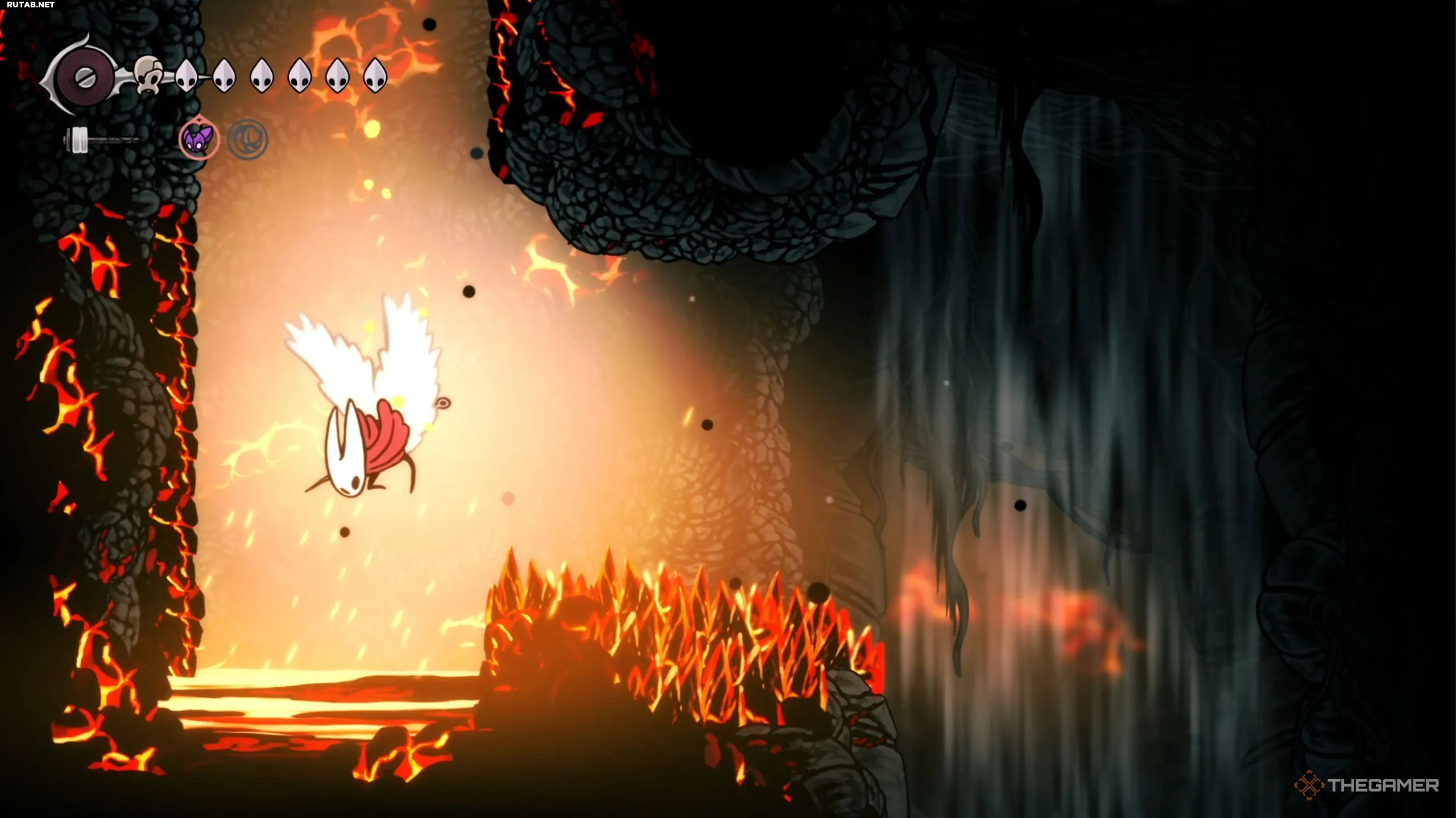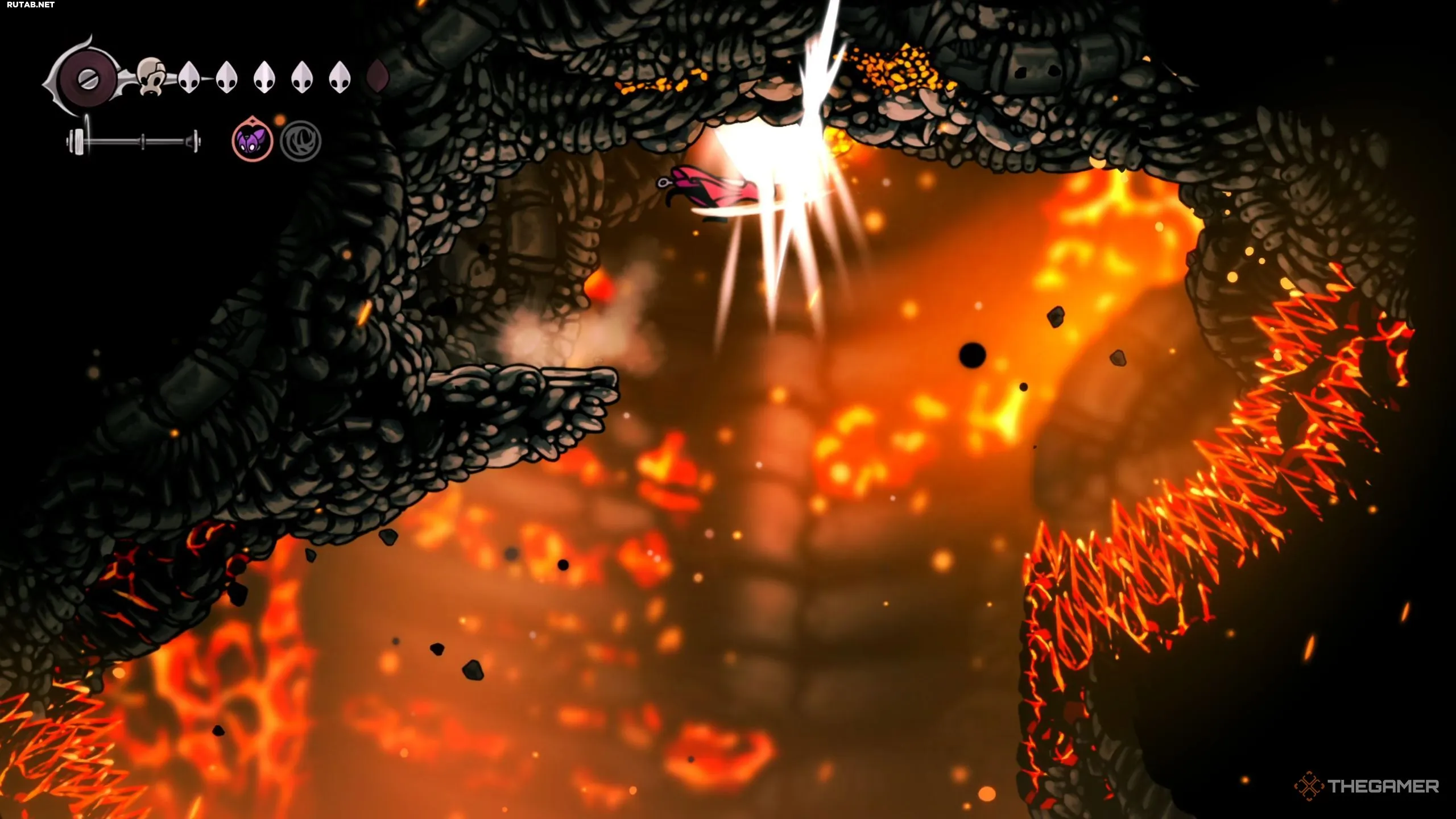 Добравшись до скамьи на вершине Бездны, вас ждёт сложный платформерный участок: придётся постоянно избегать шипы и лаву, а в конце пройти испытание на время. Для начала от скамьи в открытой области идите направо и используйте Окрыляющий Шёлк, чтобы подняться повыше.