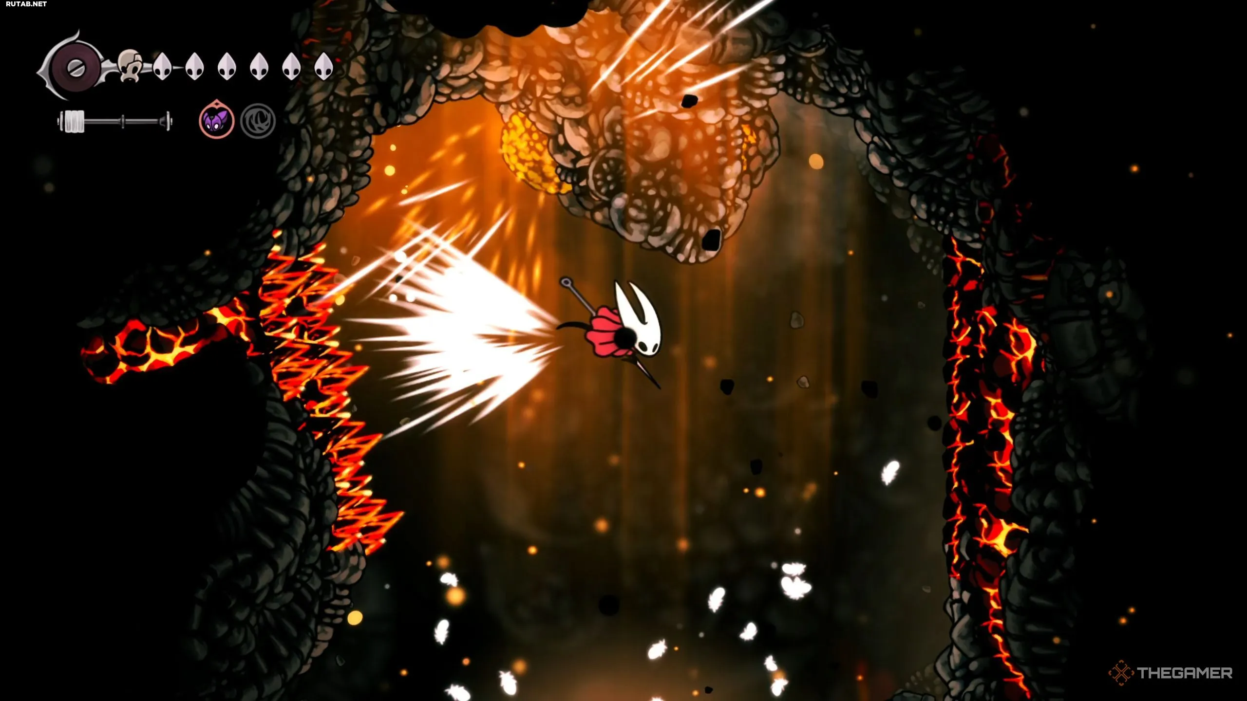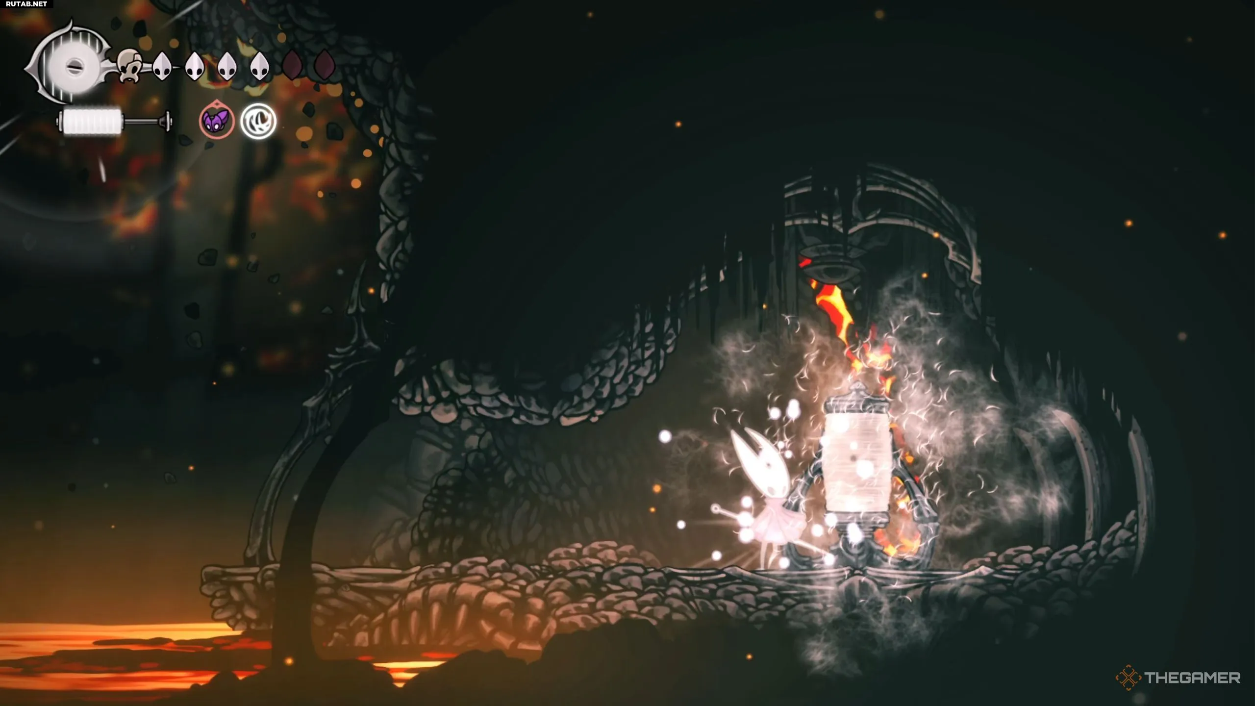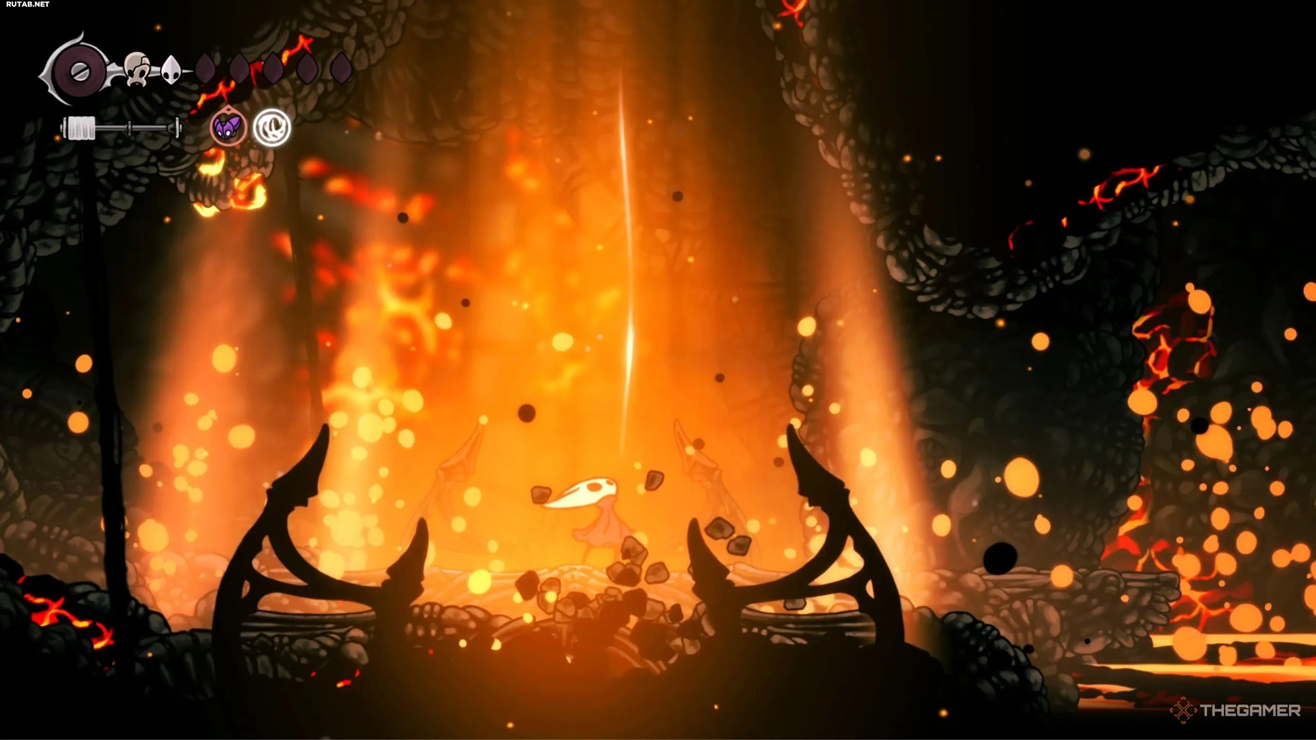 Добравшись до скамьи на вершине Бездны, вас ждёт сложный платформерный участок: придётся постоянно избегать шипы и лаву, а в конце пройти испытание на время. Для начала от скамьи в открытой области идите направо и используйте Окрыляющий Шёлк, чтобы подняться повыше.