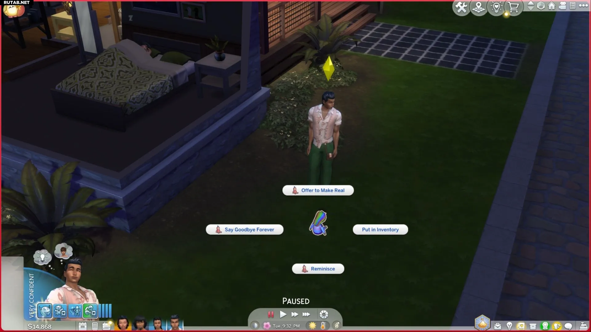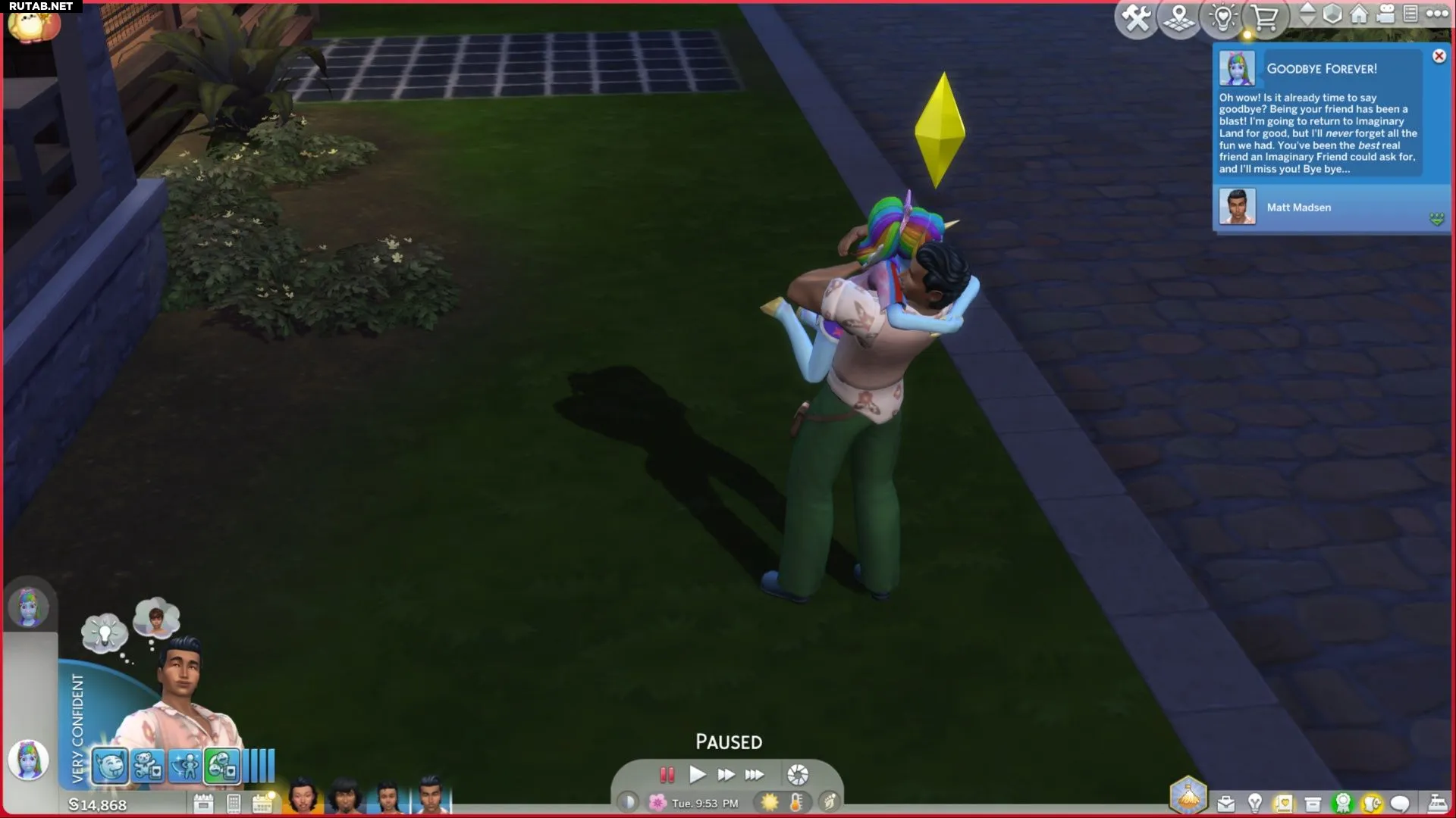 Чтобы навсегда попрощаться с воображаемым другом, нужно выбрать соответствующее взаимодействие. После подтверждения выбора сим и его друг обнимутся в трогательный момент прощания.