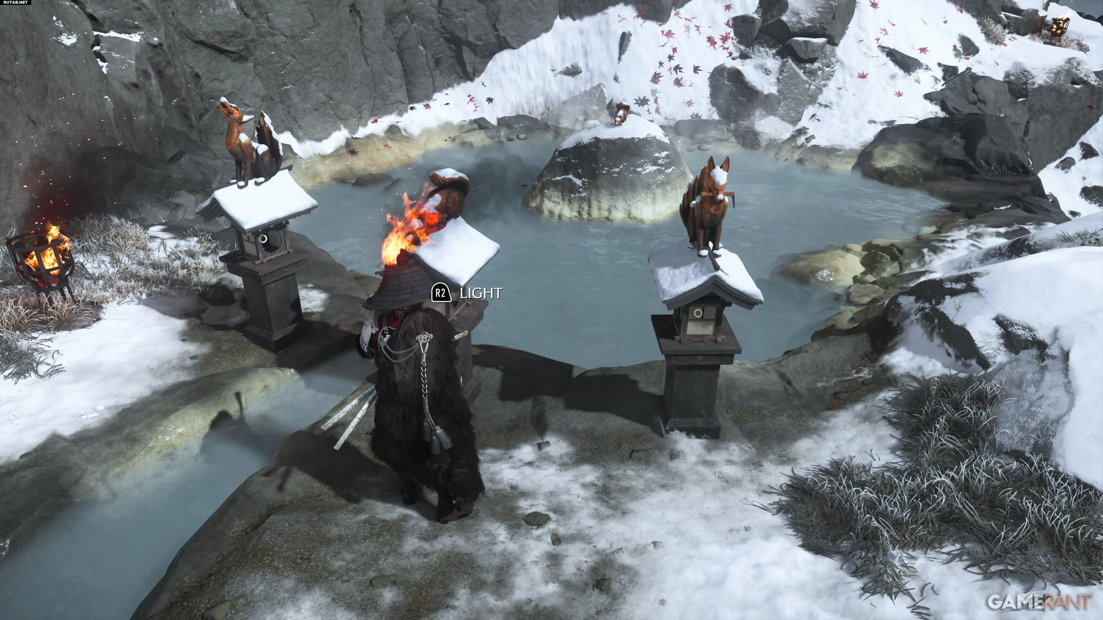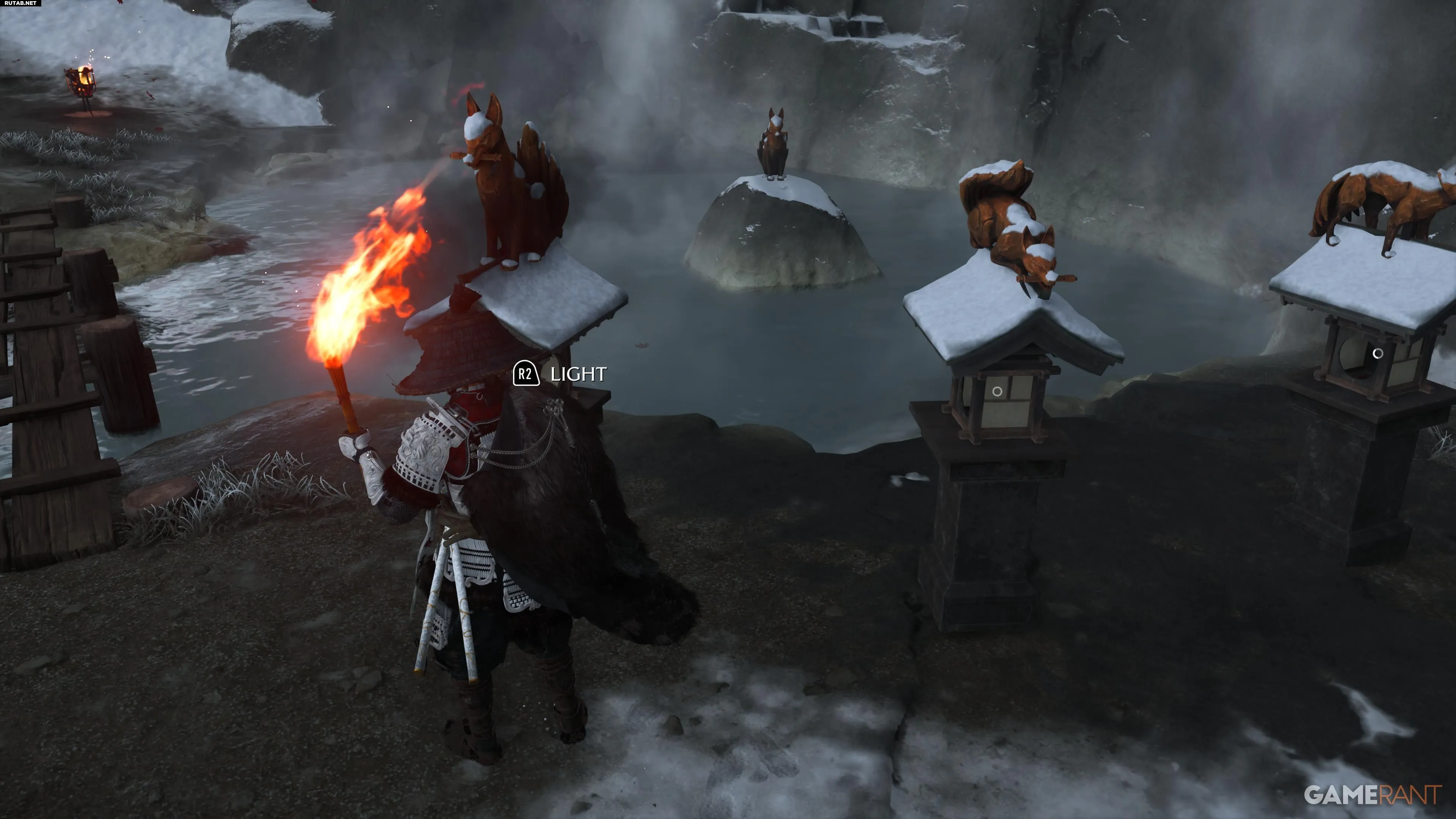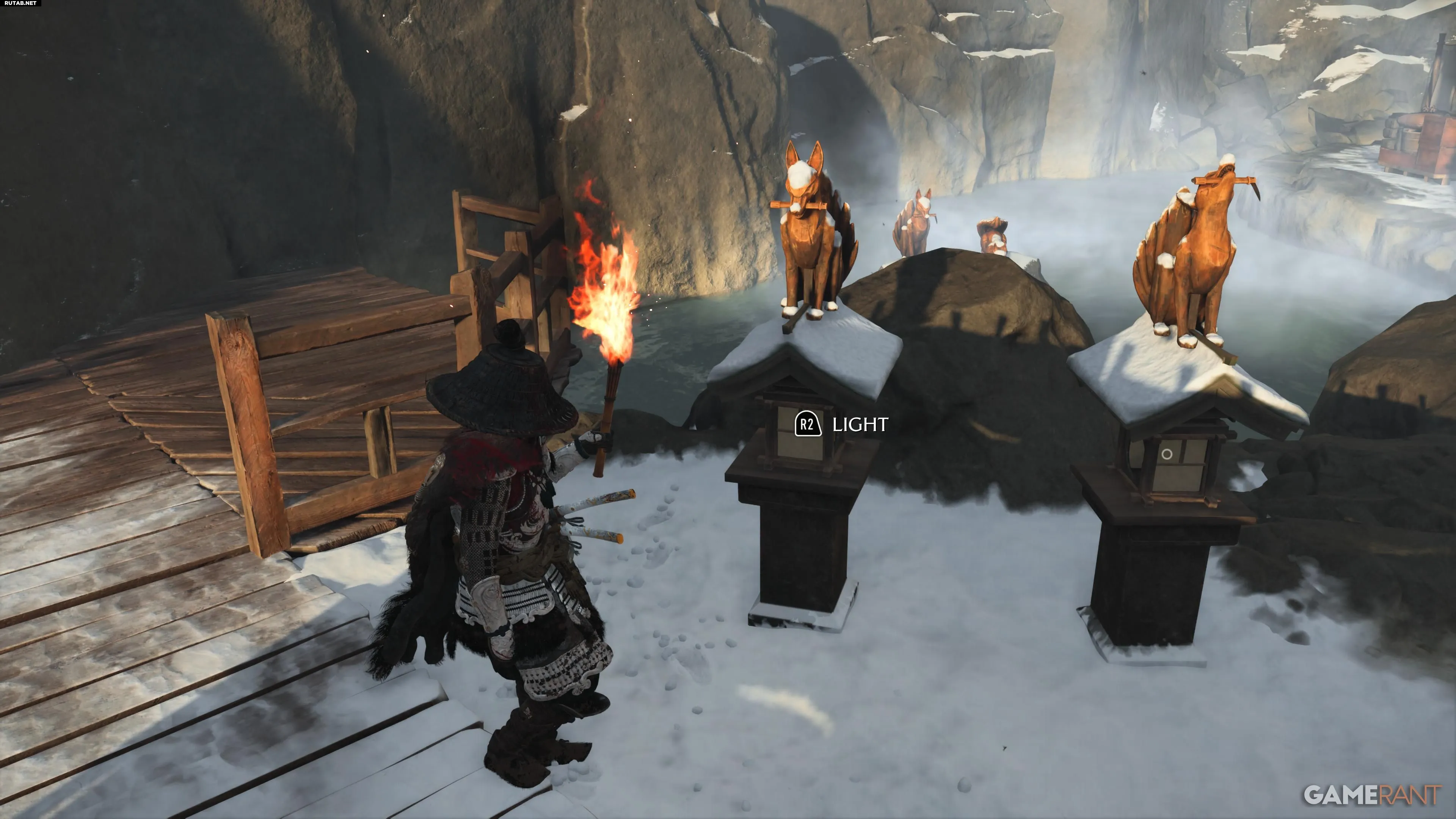 Головоломка находится в святилище Снежных Родников к западу от Красного Журавля в регионе Тесио Ридж. Рядом расположен горячий источник, а персонаж Ацу обратит внимание на резные изображения. Вы увидите несколько резных лисиц на световых столбах и закрытую дверь, для открытия которой нужно решить головоломку.