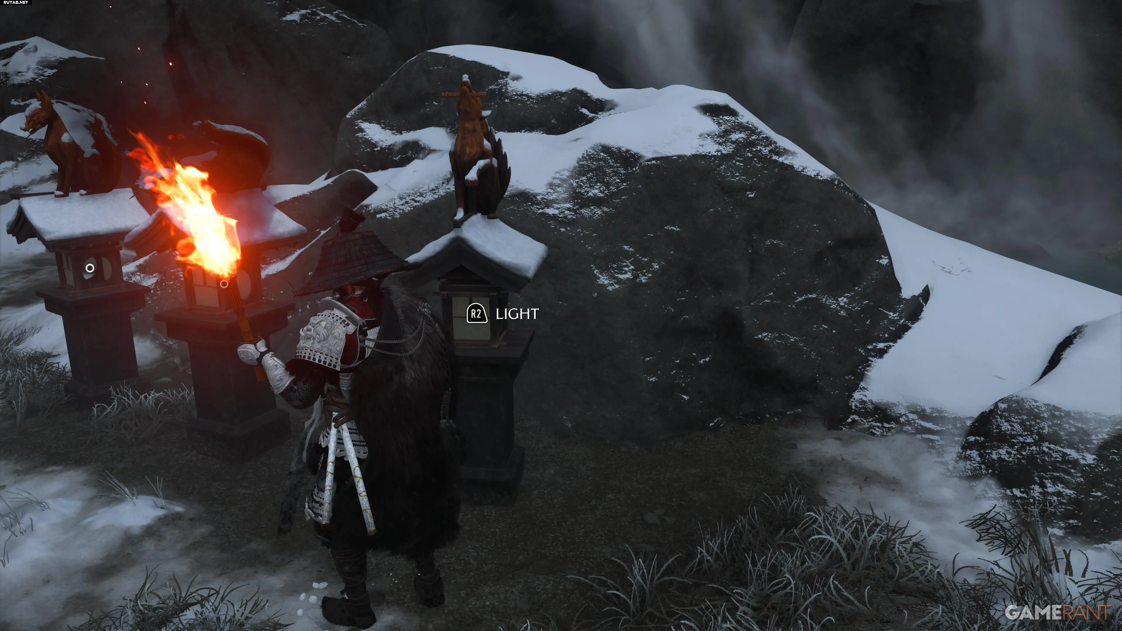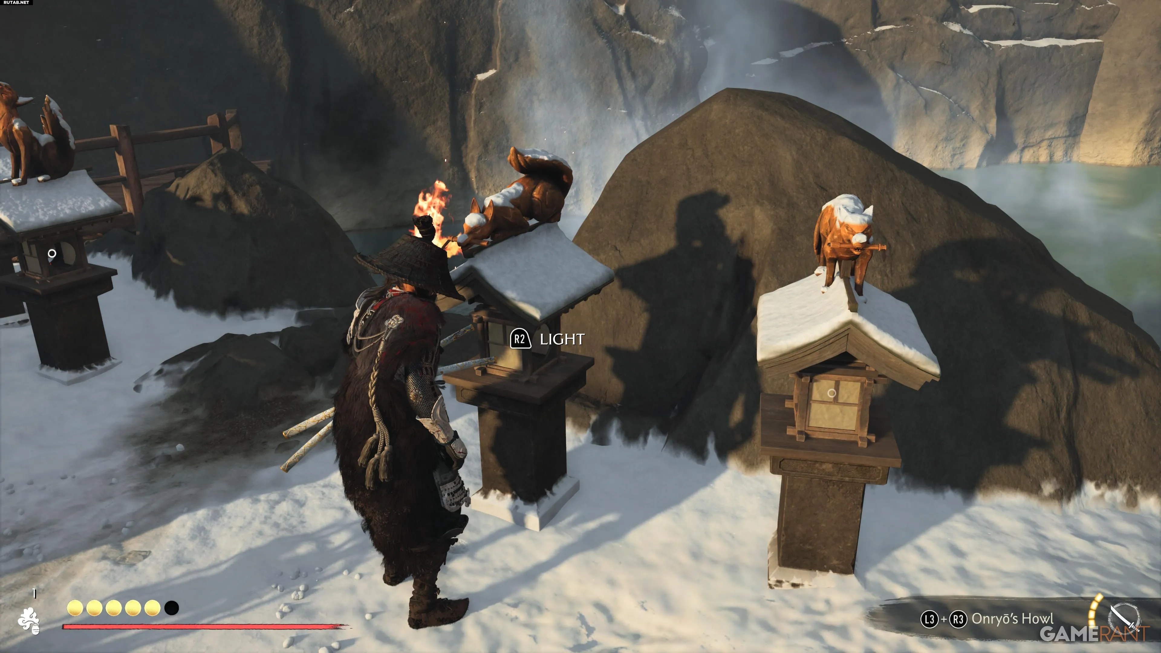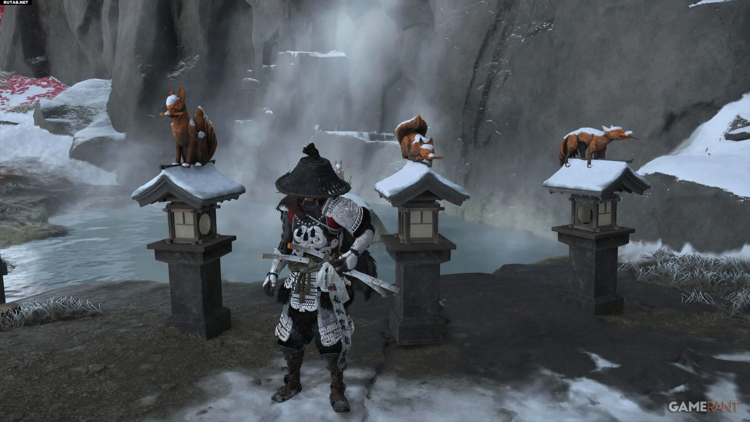 Головоломка находится в святилище Снежных Родников к западу от Красного Журавля в регионе Тесио Ридж. Рядом расположен горячий источник, а персонаж Ацу обратит внимание на резные изображения. Вы увидите несколько резных лисиц на световых столбах и закрытую дверь, для открытия которой нужно решить головоломку.
