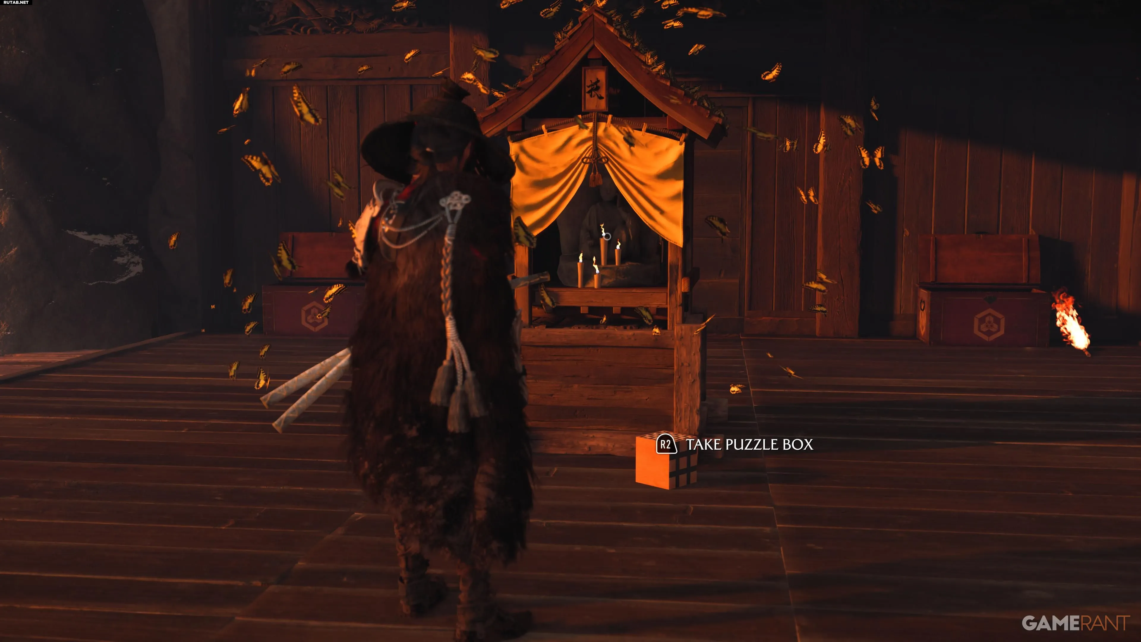 Зажгите два столба, ориентируясь на позы двух лис позади. Решение — левые резные изображения с обеих сторон. После этого откроется путь наверх, ведущий к Алтарю Размышлений и головоломке Кицунэ.