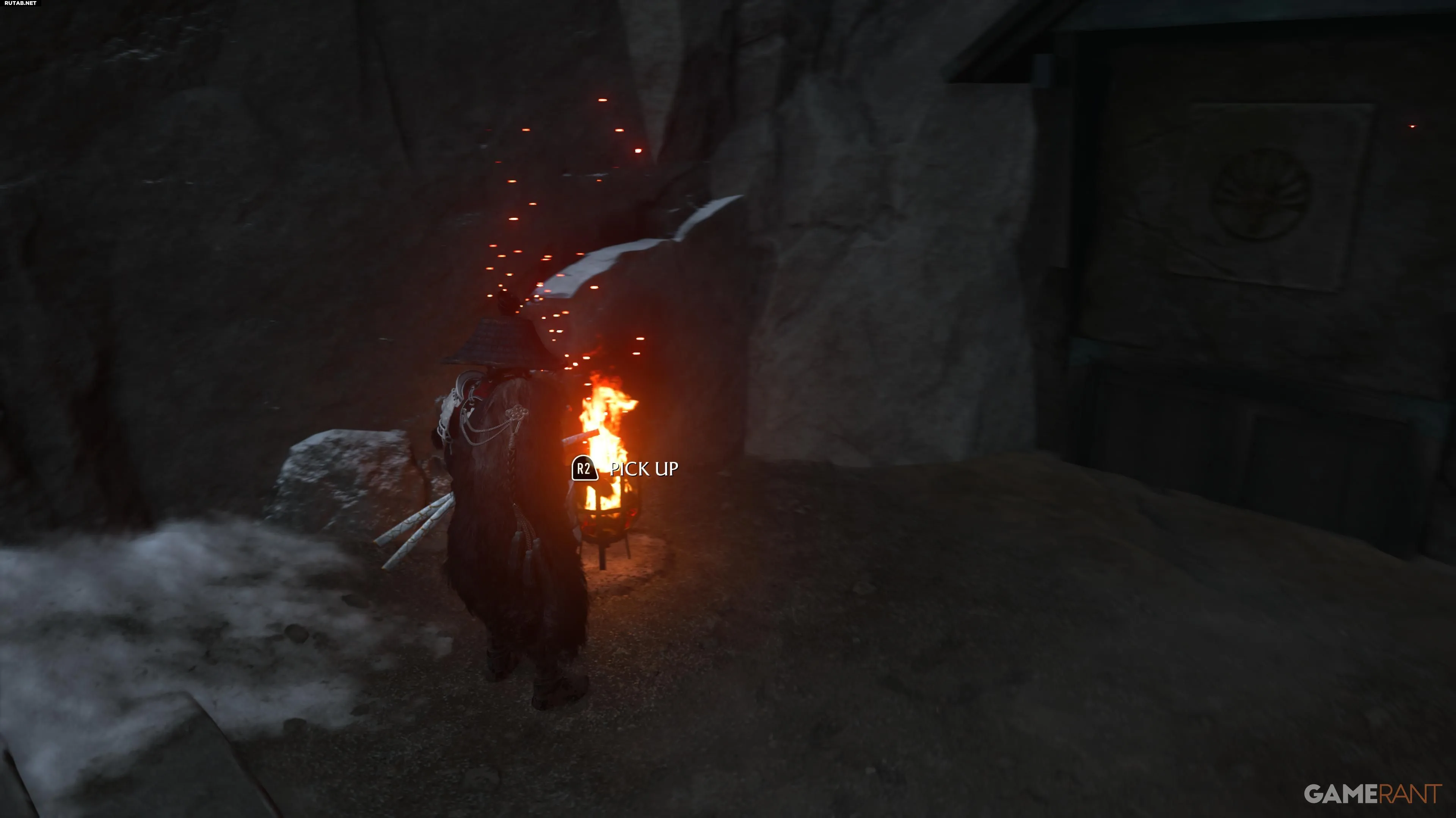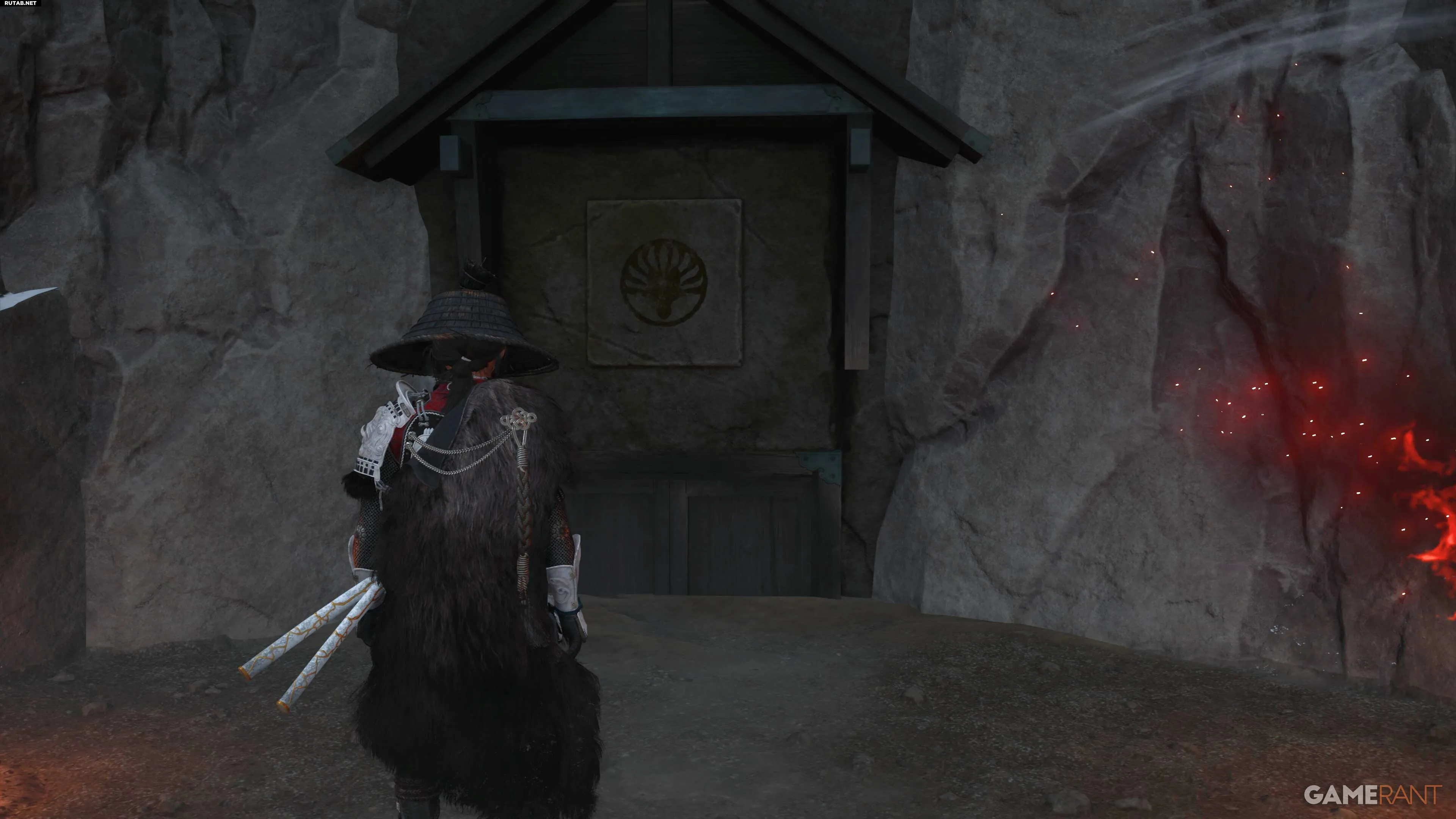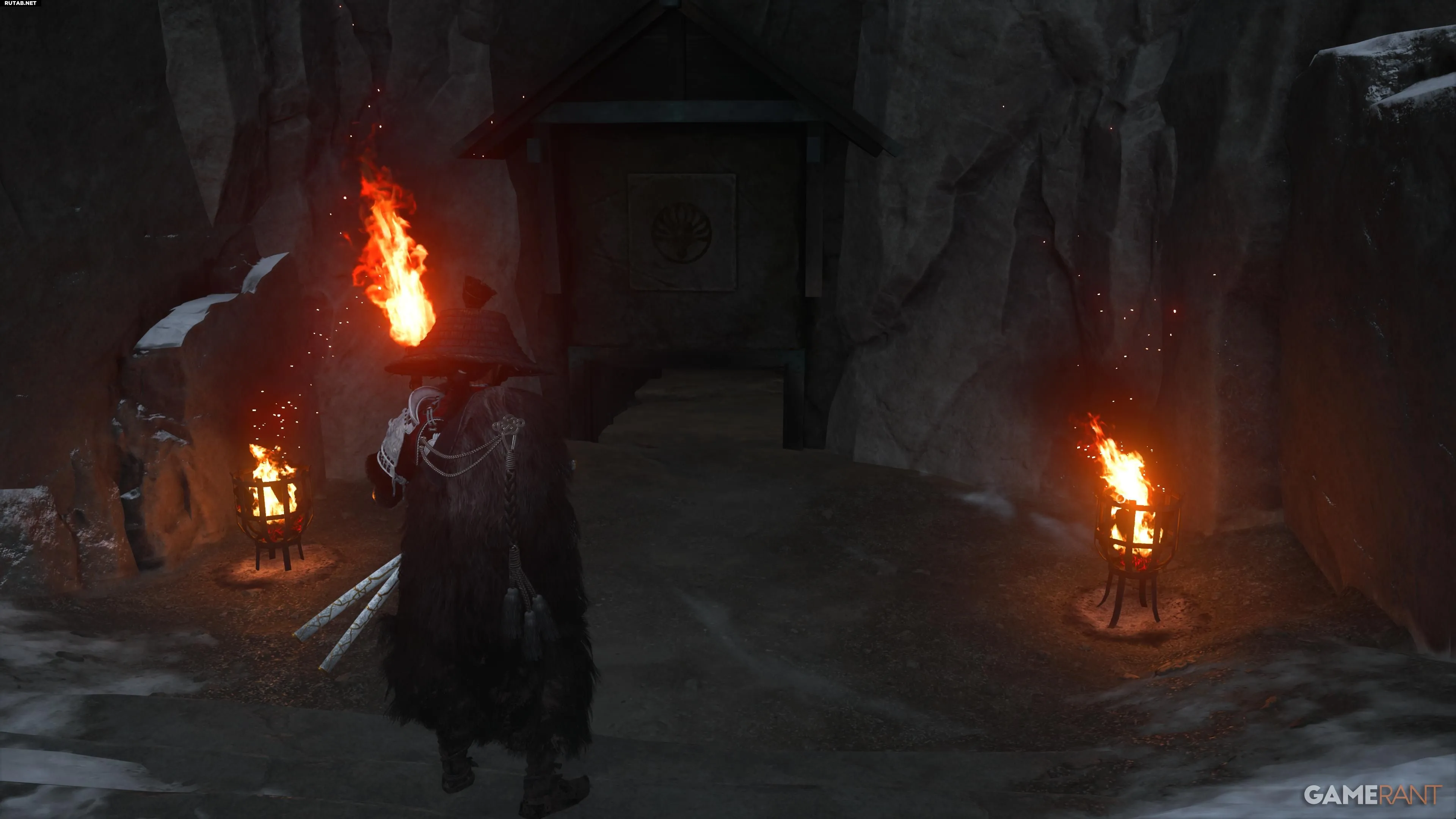 Для первых трёх резных изображений слева зажгите крайний левый столб. Для правого изображения с воющей лисой — крайний правый. Поднимитесь на уступ у двери, возьмите факел и зажгите средний столб. Дверь приоткроется, позволяя пролезть внутрь.