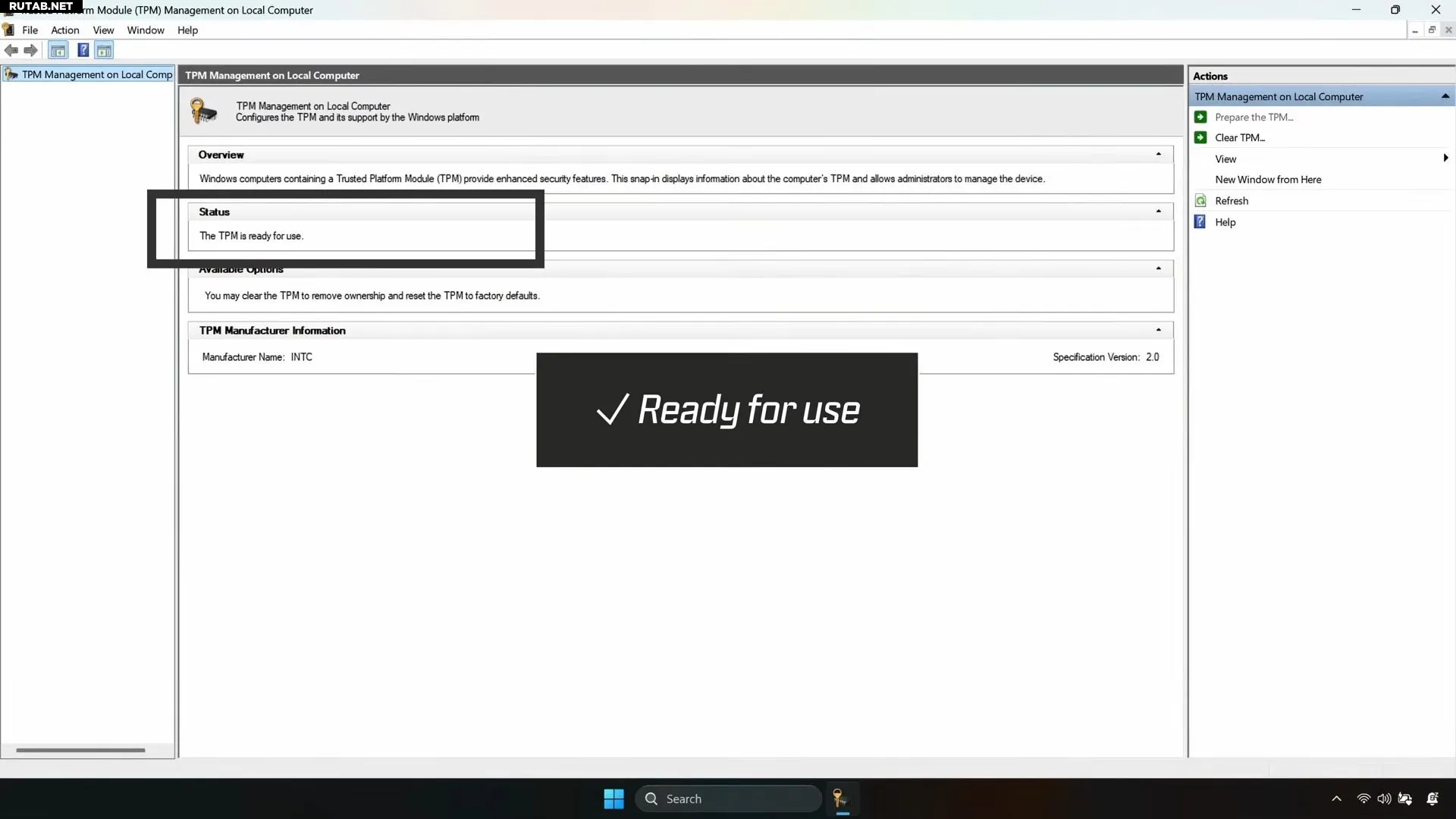 Сначала проверьте, включены ли TPM 2.0 и Secure Boot в вашей системе. Нажмите Win+R, введите «tpm.msc» в поле поиска. Если в появившемся окне отображается «Модуль TPM готов к использованию», значит с TPM всё в порядке.