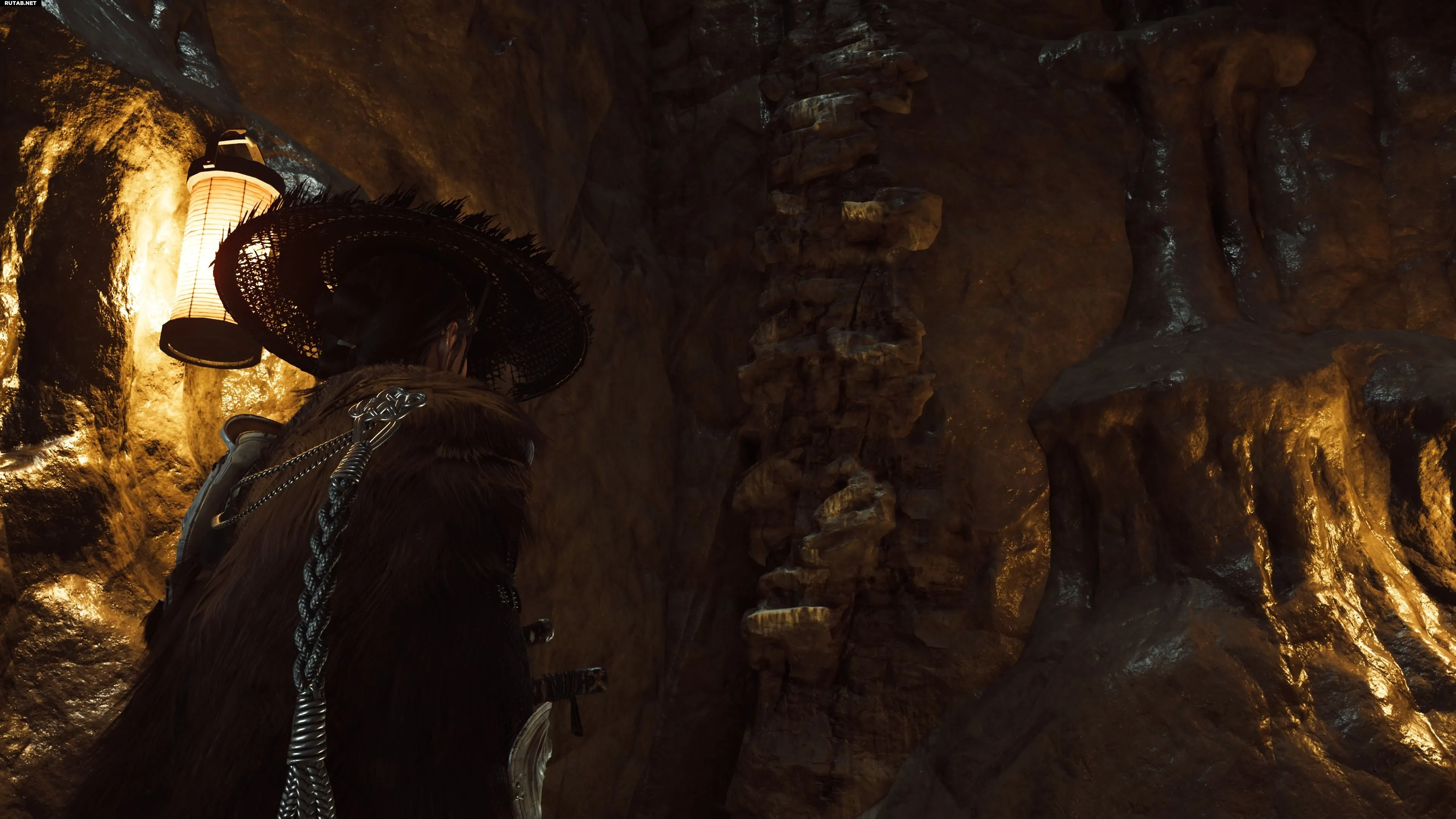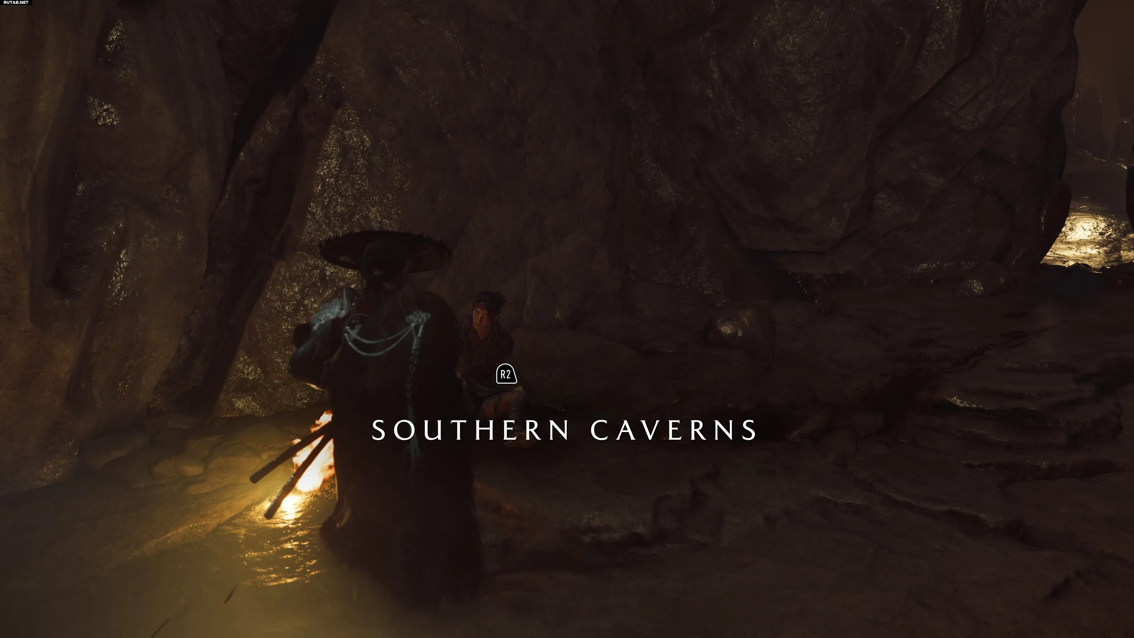 Теперь продолжайте движение на запад, справа от главного входа в Заброшенное Поместье Томинага, где вы наткнётесь на Южные Пещеры. Не обращайте внимания на бандита у входа и не поддавайтесь его предсмертным страхам. Войдите в пещеру и следуйте по линейному пути вперёд, пока не доберётесь до стены, на которую можно взобраться.