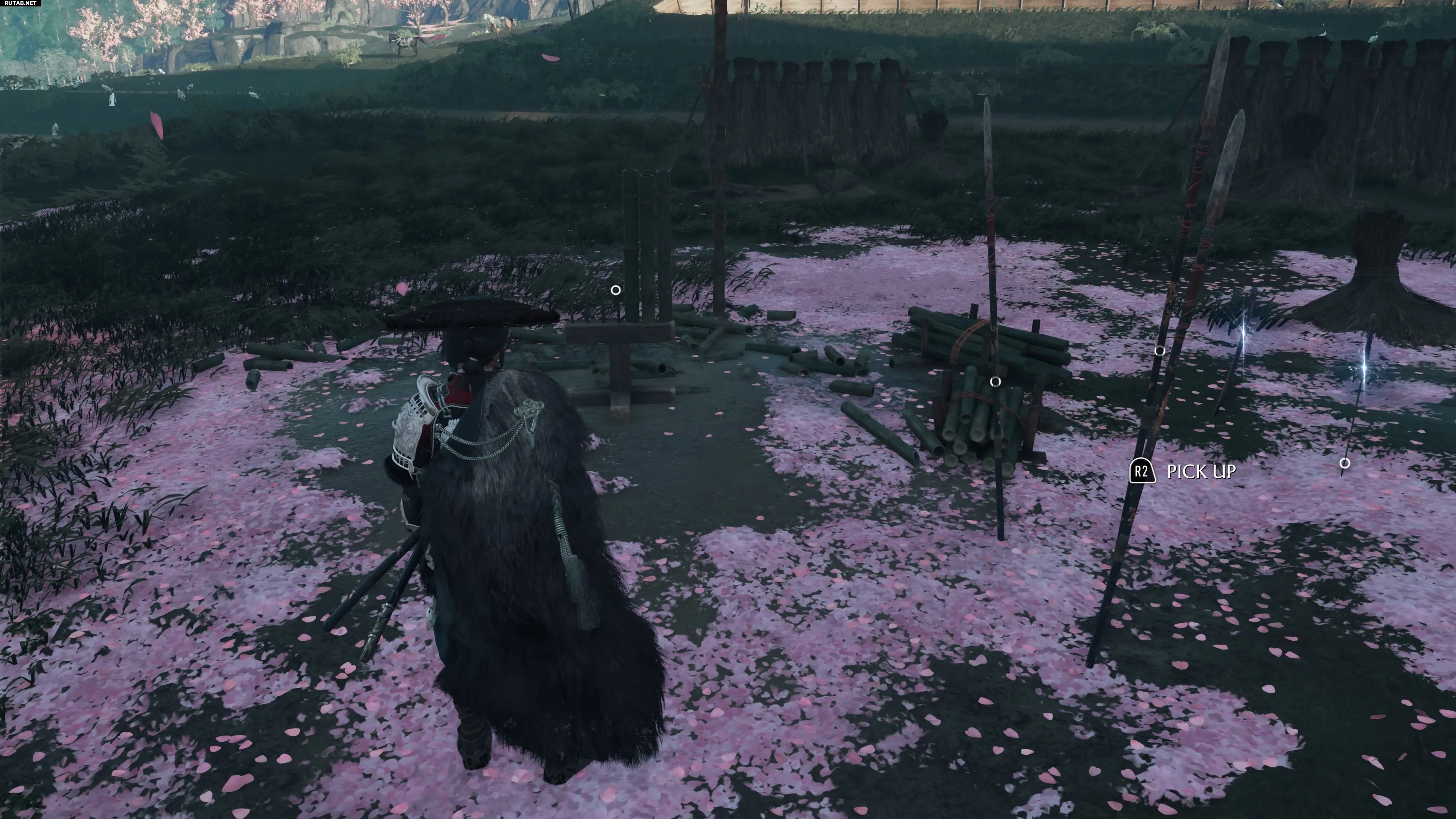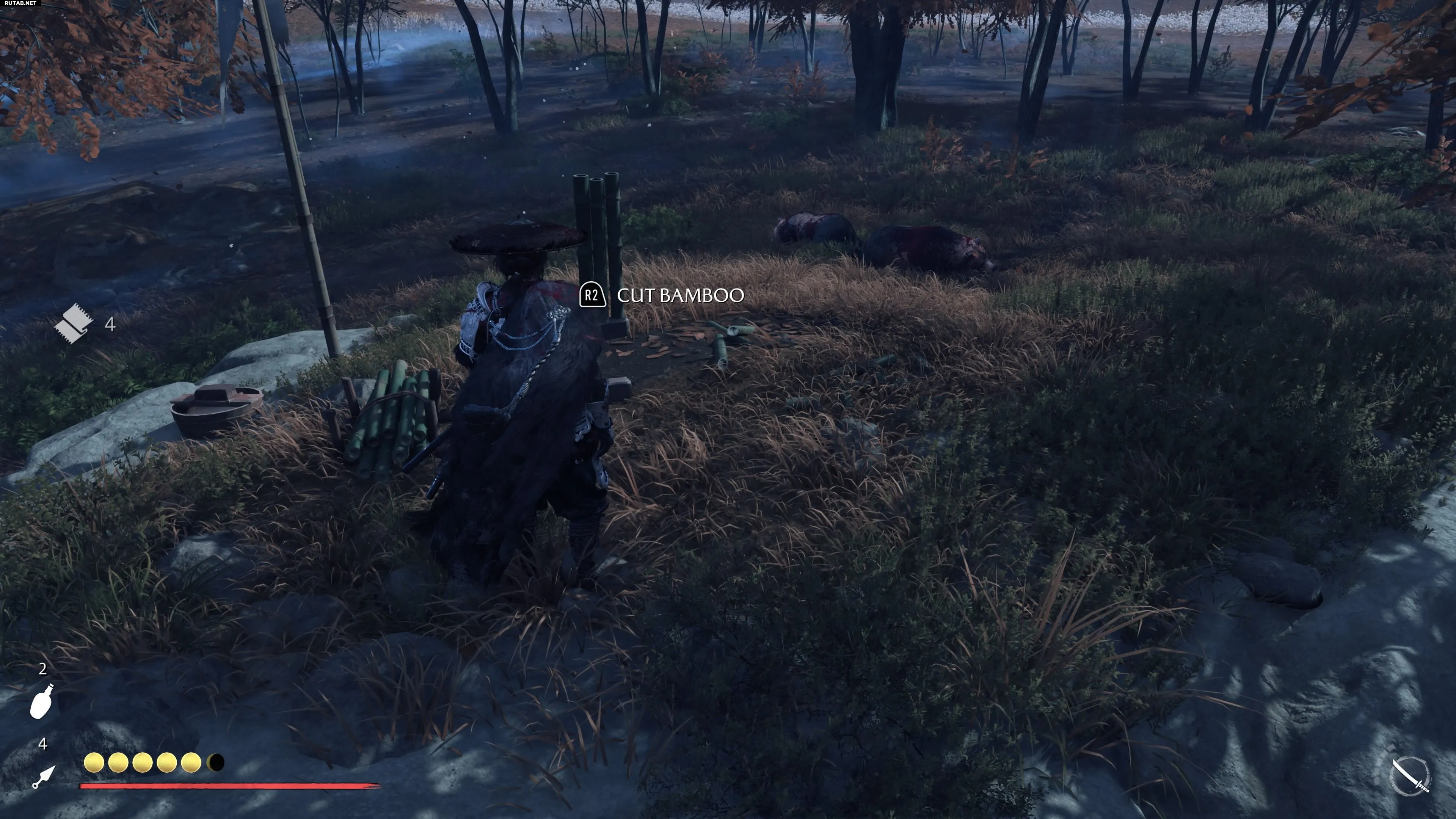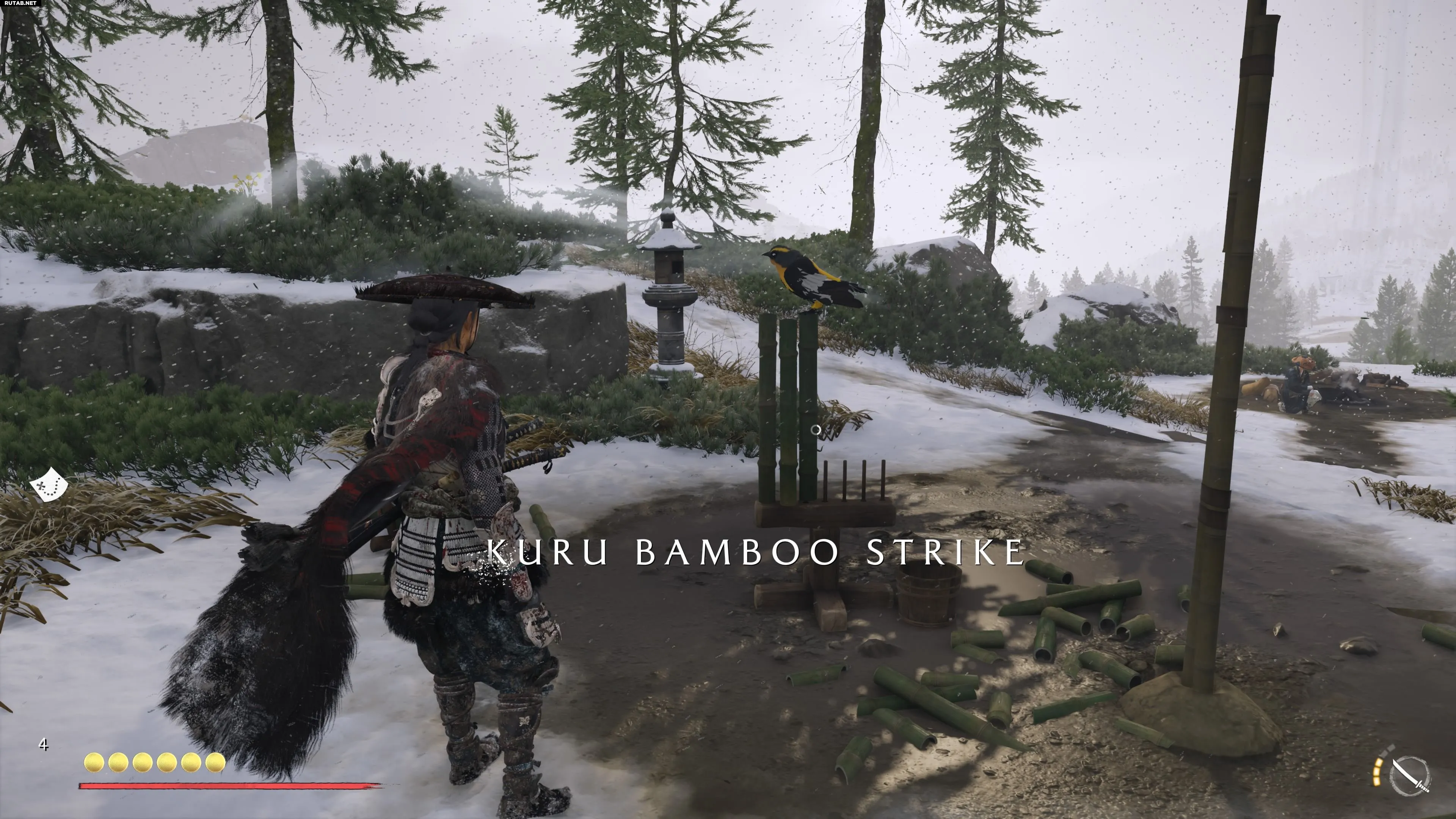 Немного выше рисовых полей Атаго вы найдёте это испытание бамбука. Однако вам потребуется подобрать и выбросить копья и мечи в этой области. Для этого удерживайте R2 и нажмите квадрат, так как попытка начать испытание до того, как вы уберёте оружие, приведёт к тому, что вас будет поражать молния каждый раз.