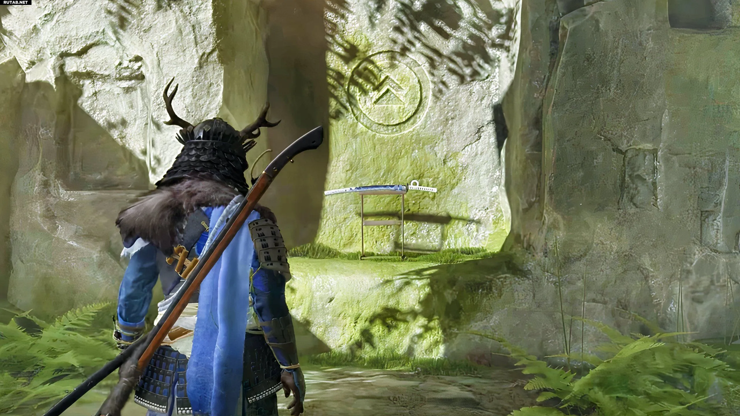 Найдя святилище, поговорите со Сказочником Угэцу, который стоит на коленях у тории. Это откроет путь вверх по тропе за ним, которая приведёт вас к Клинку Бури и Маске Призрака Дзина Сакаи.